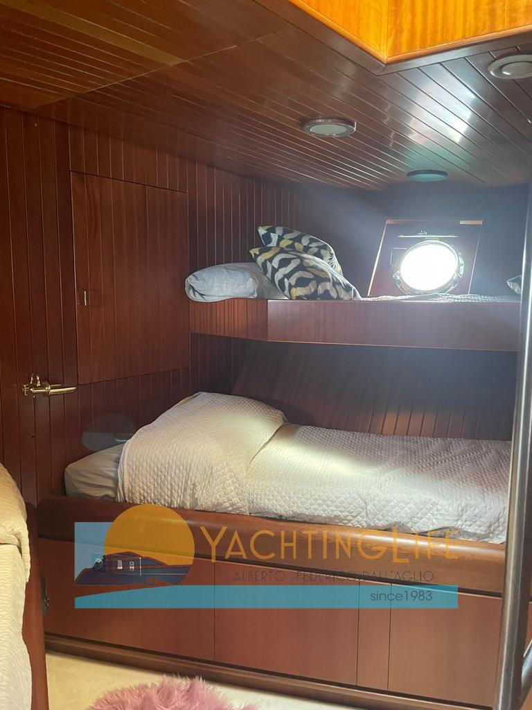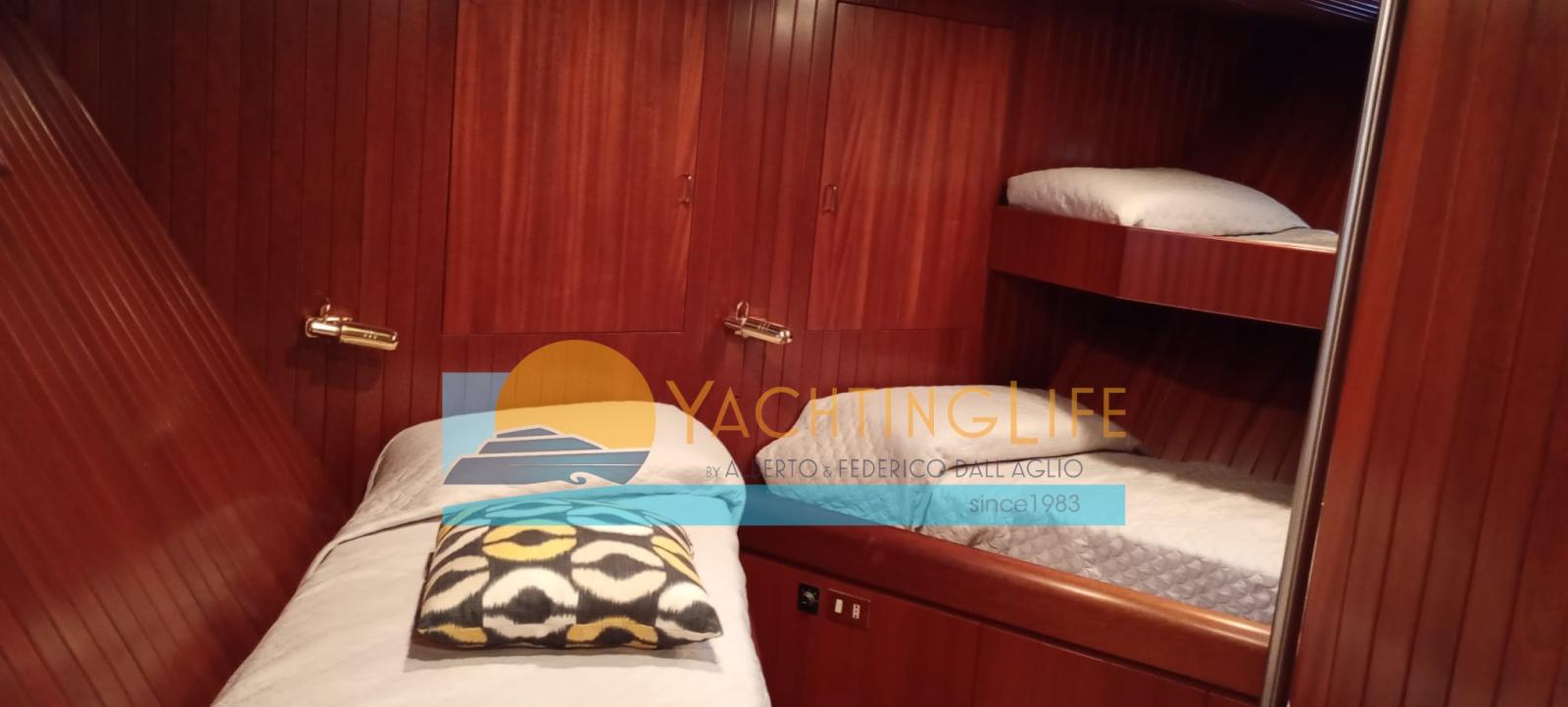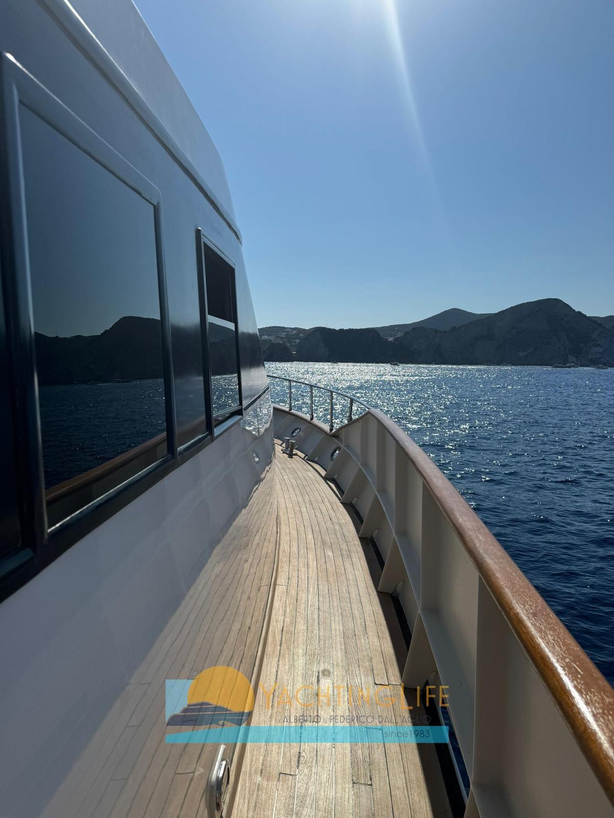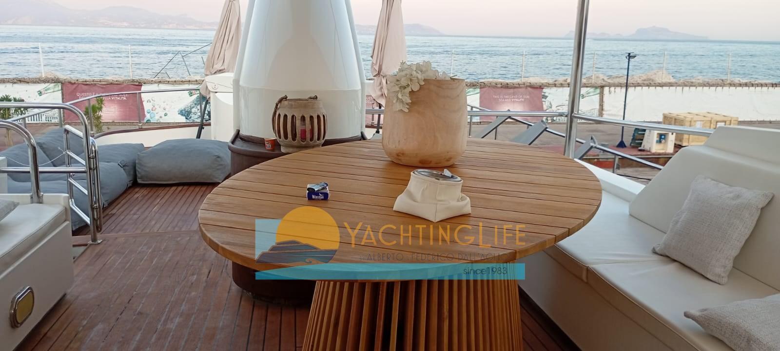 Engine Alarm, Bilge Alarm, 2 Anchor, Water pressure pump, Teak Side Decks, 2 Battery charger, Deck Shower, Twin Steering, Bow Thruster (elettrica), Hydraulic Flaps, Davits for tender on fly, Fire Extinguishing System, Flaps Indicators, Anchor Chain Washdown, Courtesy Lights, Gangway (idraulica), Automatic Bilge Pump, Entry door, Side door, Teak Cockpit, Shorepower connector, 2 Electric Windlass, swimming ladder, Stabilizers (pinne), cockpit table, 2 Stern Winches.