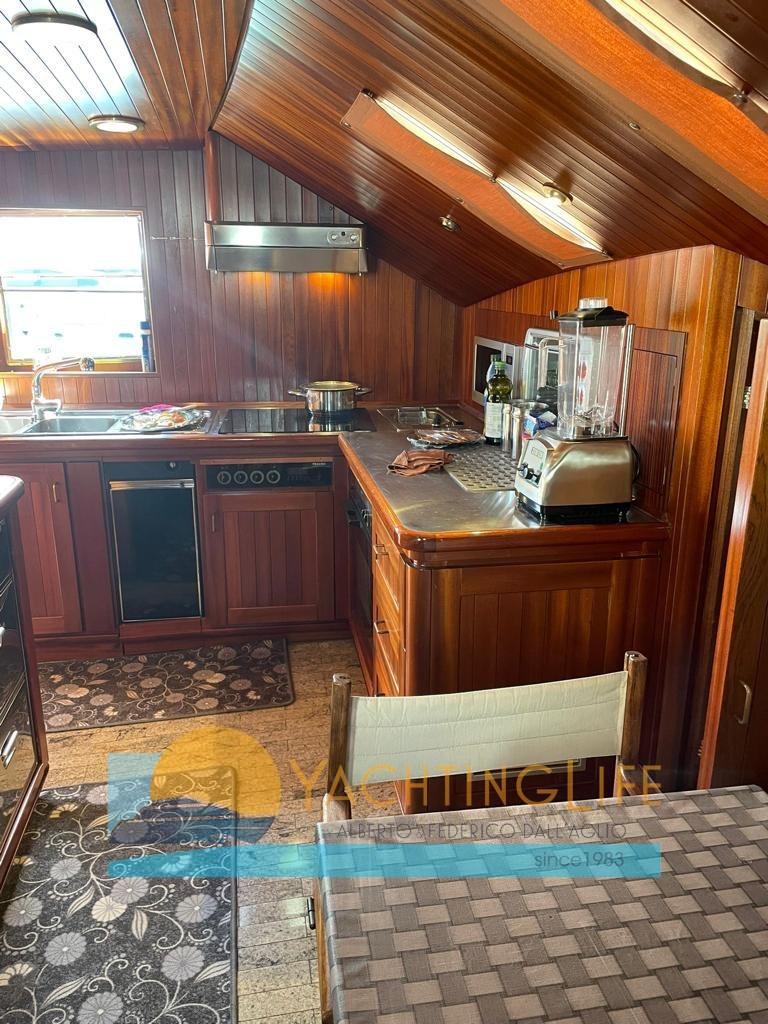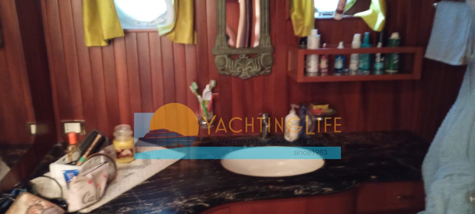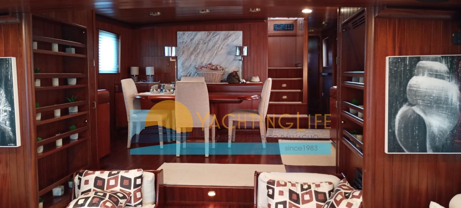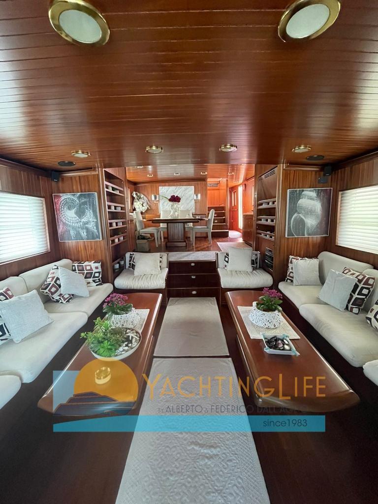 Engine Alarm, Bilge Alarm, 2 Anchor, Water pressure pump, Teak Side Decks, 2 Battery charger, Deck Shower, Twin Steering, Bow Thruster (elettrica), Hydraulic Flaps, Davits for tender on fly, Fire Extinguishing System, Flaps Indicators, Anchor Chain Washdown, Courtesy Lights, Gangway (idraulica), Automatic Bilge Pump, Entry door, Side door, Teak Cockpit, Shorepower connector, 2 Electric Windlass, swimming ladder, Stabilizers (pinne), cockpit table, 2 Stern Winches.