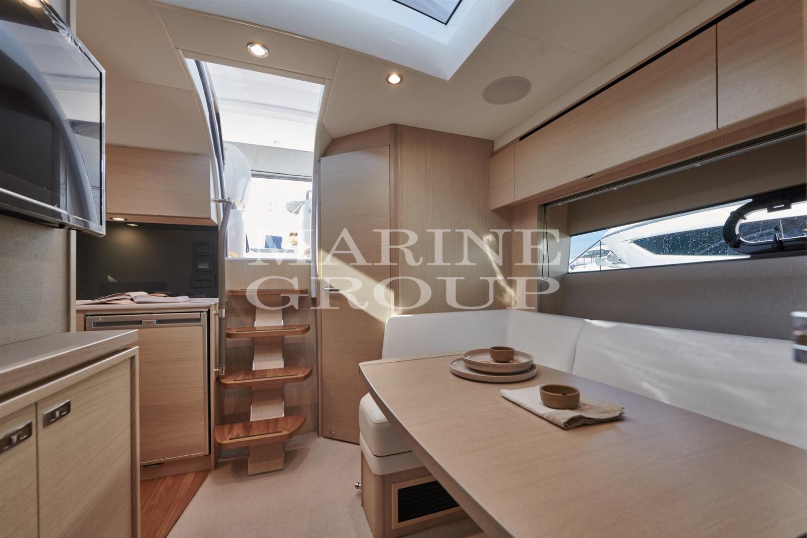 HP SCA RP TRONIC 100 1/h watermaker - Seakeeper 3 stabilizer - Bow thruster - Volvo joystick - Cockpit seat extension convertible into sundeck - Saloon skylight blackout - Aft cabin with two beds convertible into double bed - Aft cabin with third bed instead of chest of drawers - Ultraleather sofa upgrade in saloon - Sliding window in the steering console - Tender saddles - Telescopic gangway - Hi/low platform - removable teak step in the helm station - 220v/240v continental sockets - BBQ in the cockpit bar cabinet - Onan 6kW / 50Hz generator - AGM 90 Ah battery upgrade - SMEG induction hob in the kitchen - External 12v power socket - White courtesy LED lights in cockpit and platform - 32" HD LED TV in the saloon with Fushion radio with two Fushion speakers - External radio speakers connected to the saloon audio - Hot/cold air conditioning 24,000 BTU - Mosquito nets in all opening portholes - Electric black water drainage system - Cockpit seats and wheelhouse in marine vinyl with Met Sterling - Bow sunbathing cushions with contrasts in white marine vinyl with Comfort Exterior III Met Sterling - Grey anti-glare cover behind the windscreen - Black windscreen cover net - Telescopic awning in grey cockpit - Shore power cable with socket - Icemaker IM XT OCX2 HYDRO DX 2301/ 50/60HZ - Blackout awnings - Arimar Elite 220 VTR tender with Yamaha engine F4BMHS