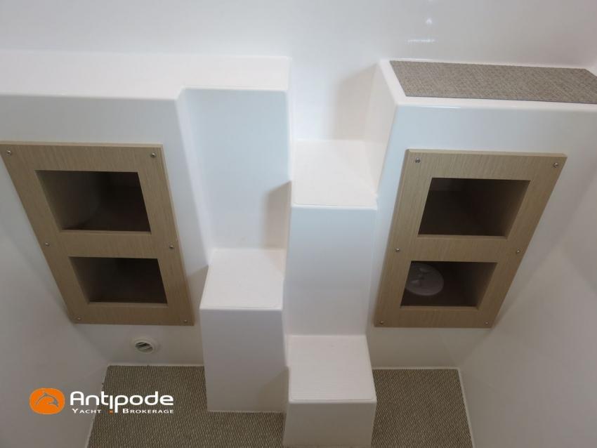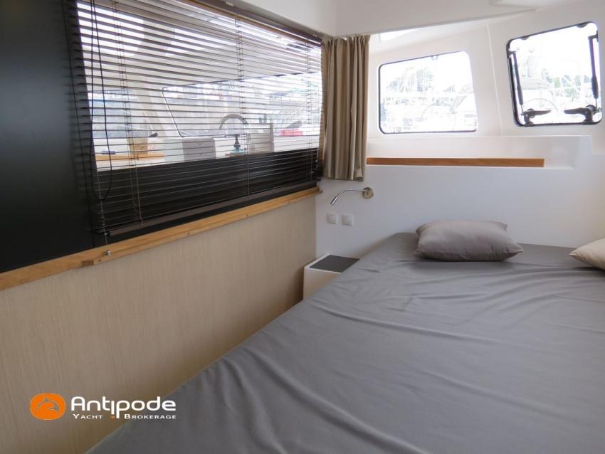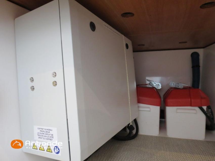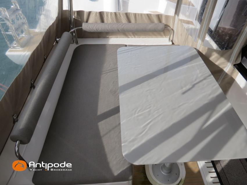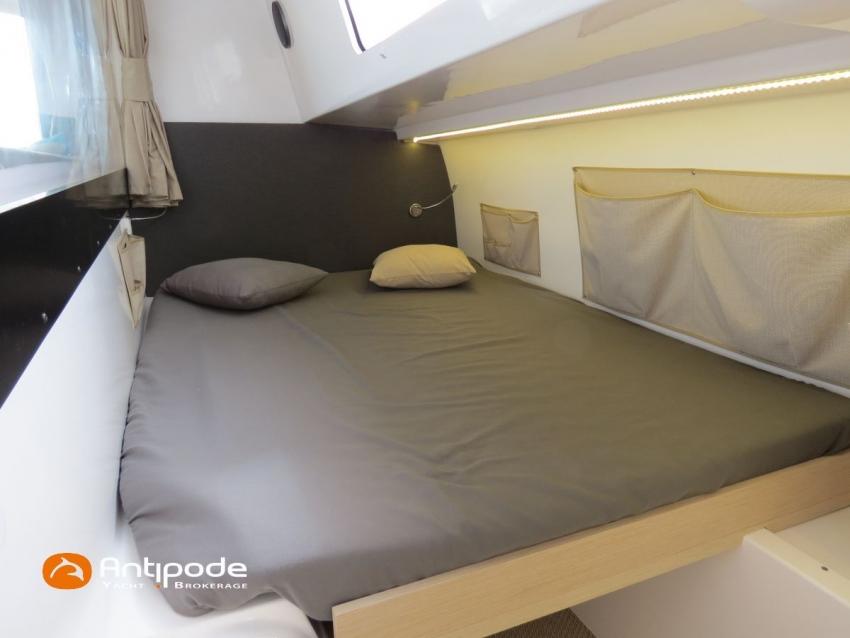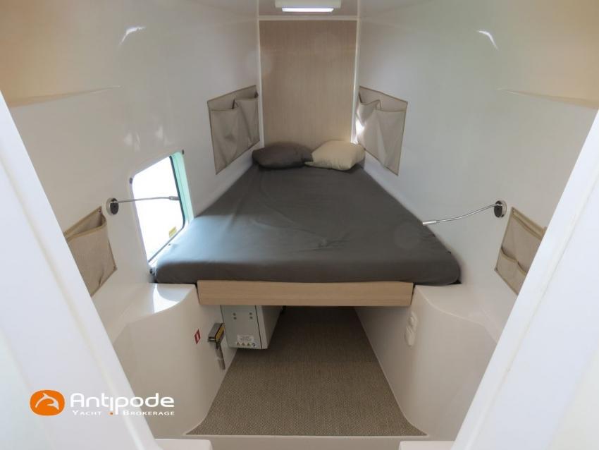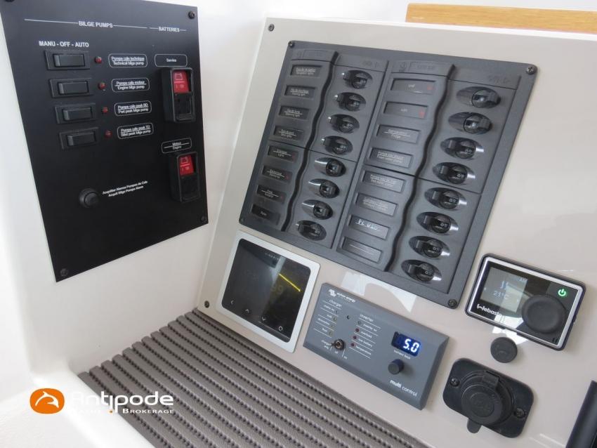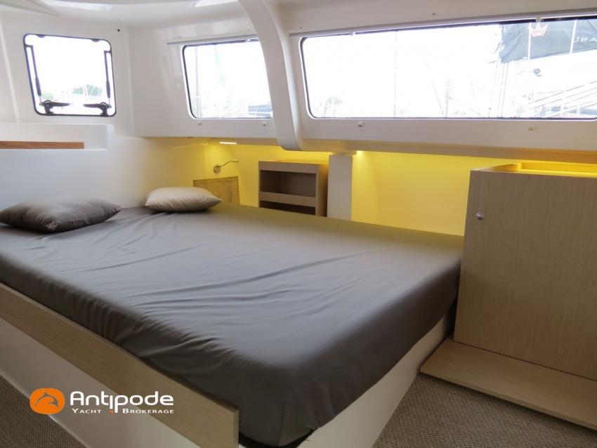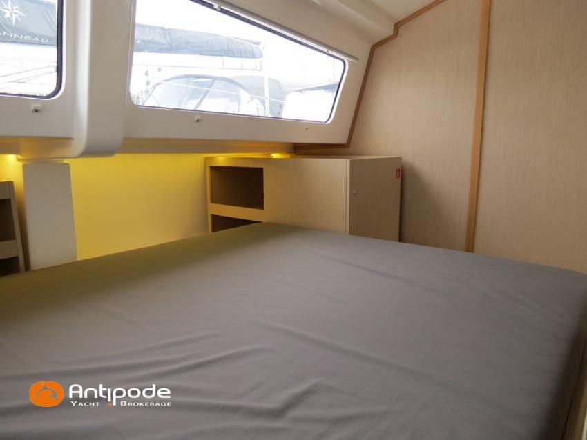 NEEL 43, 2022, first hand, VOLVO D2-50F, 50 hp (500.1 hrs), Bow thruster, Premium package, Interior layout version 1 forward cabin, 2 side cabins , Port cabin close with saloon, 2 single cabins in both forepeack, Alpi interior woodwork, Bolson carpet in saloon & cabins, Mastresses underlays in double cabins, Interior curtains, Kitchen head cupboard, Cocktail table in saloon, Mosquito screens for opening windows and hatches, 2 hulls primary spinnaker winches - Antal XT44, 1 roof winch for genoa and staysail sheets - Antal XT48, Electric manoeuvring winch on roof for halyards and mainsail sheets - Antal XT40, GRP bowsprit, Flexyteek slatted cockpit floor, Flexyteek bathing platform & dinghy craddle, Diner cockpit table , Wheel cover, Wheel station bimini top & enclosure, Cockpit hard top, Cockpit & wheel station cushions - Sunbrella, Cover for wheel pupitre and wheel station cushion, Cockpit chain counter, Electrical lift for dinghy - Antal Line drive + remote control, Full cockpit enclosure, Deck stepped aluminium classic mast and boom, Square top full batten main sail - Incidences, Main sail mast track + batten cars, Single line main sail reefing system (x 2), Main sail lazy bag, Main sail lazy jacks, Genoa roller furling with above deck drum - Facnor LS180, Furling genoa - Incidences, Furling staysail with halyard 2.1 & furler - Incidences, Assymetric spinnaker riggings, Asymmetric spinnaker - 115 sqm, Spinnaker snuffer, Furlable gennaker - Technique Voile, Code 0 on furler - Intuitive Sails, In board autopilot - B&G NAC3, Autopilot pupiters at chart table and wheel station, Wheel station repeater - B&G Triton 2, Nav station repeater - B&G Triton 2, GPS and chartplotter (wheel station) - B&G 12 pouces, Radar with radome radar fitted on mast - B&G broadband 4G, AIS Transponder CLASS B (emission and reception) & Silent mode, DSC VHF at chart table - B&G V60, Handheld VHF - Icom, Fusion MS AV 750 audio system+ 4 speakers, Distress beacon, Fridge unit 12 V (front opening door), Freezer 12 V, Water heater - 60 liters - 220 V and engine heat exchanger, 2 burners cooker + oven & toaster, Plancha in cockpit, 2 x Bow thruster batteries & charger, Service batteries - Lithium - 2 x 200Ah, Dual charger / Inverter - 2000W - Victron Energy, Interior 220 V / 12 V / USB sockets, Battery controller, WEBASTO heating system, Holding tank, Electric toilets, Solar panels - Solbian 2 x 155W , Hot and cold cockpit shower, Leds navigation lights, Leds interior & cockpit lights , 8 men liferaft & safety equipments, Kobra anchor + chain, Fenders and warps, Dinghy + Suzuki 4 str 2.5Hp outboard engine, Located Brittany. For more information or to make an appointment for a visit, contact : Jean-Baptiste Lemaire +33 6 10 25 00 03 - jb@antipode-yachts.com