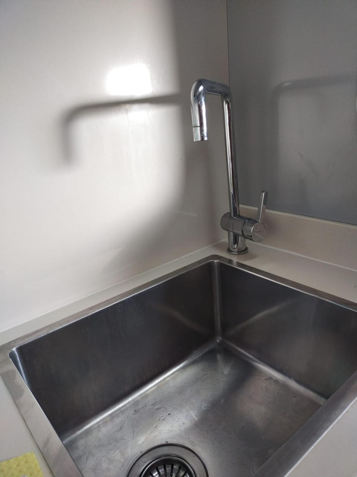 New kitchen with white quartz top and back, square stainless steel sink, mix design, 2-burner induction hob, all new cost 4.500,00