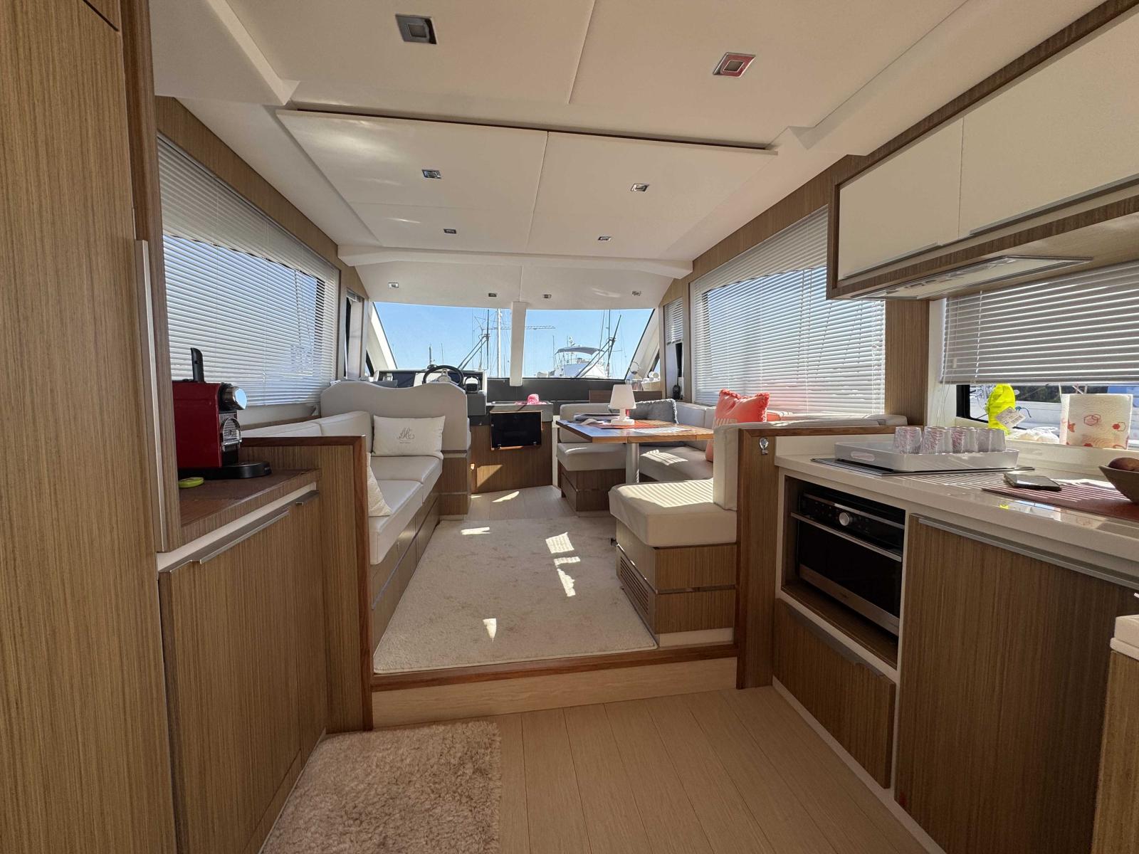 This model captivates with its sleek lines, quiet comfort when sailing, and elegant finishes. Equipped with the highly sought-after Seakeeper, it ensures exceptional stability, even in rough seas. The joystick manoeuvring system simplifies every docking manoeuvre, the full air conditioning provides absolute comfort, and the large refrigerator allows you to extend your cruises without constraint.