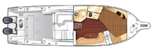 Dinette with J-shaped sofa with table, oblique bow bed, double bed aft, bathroom with shower