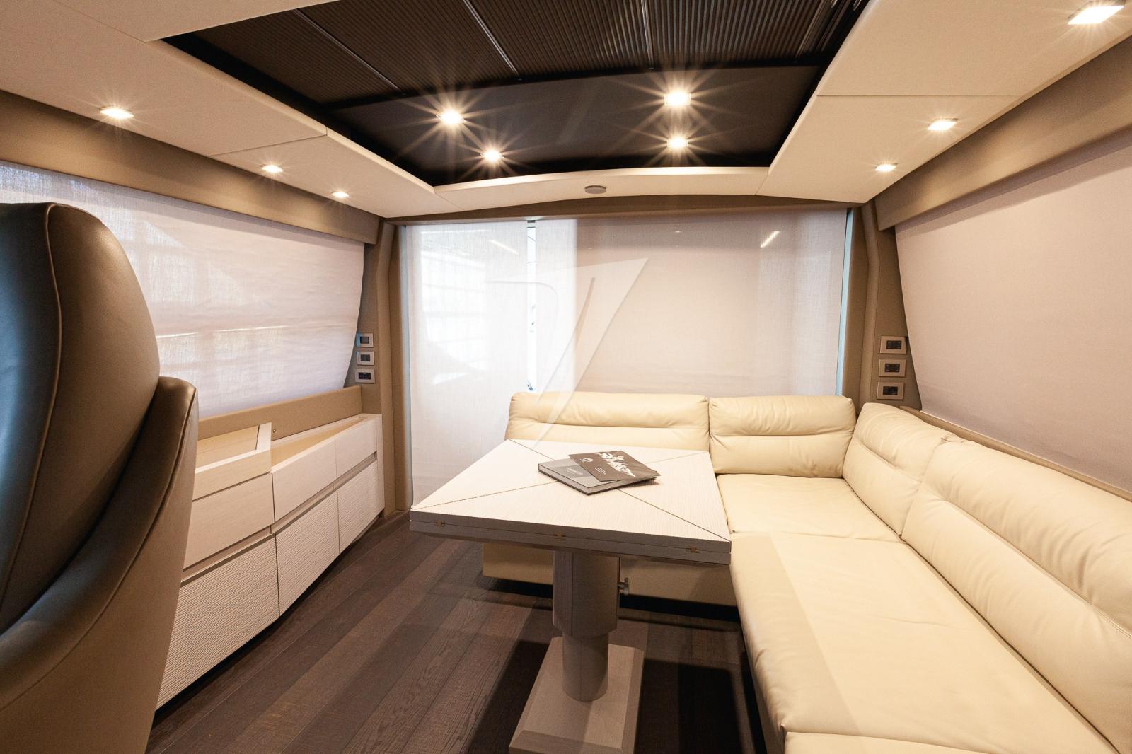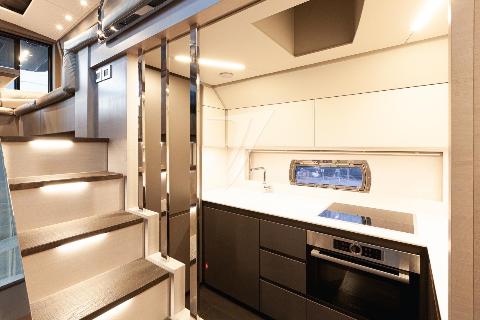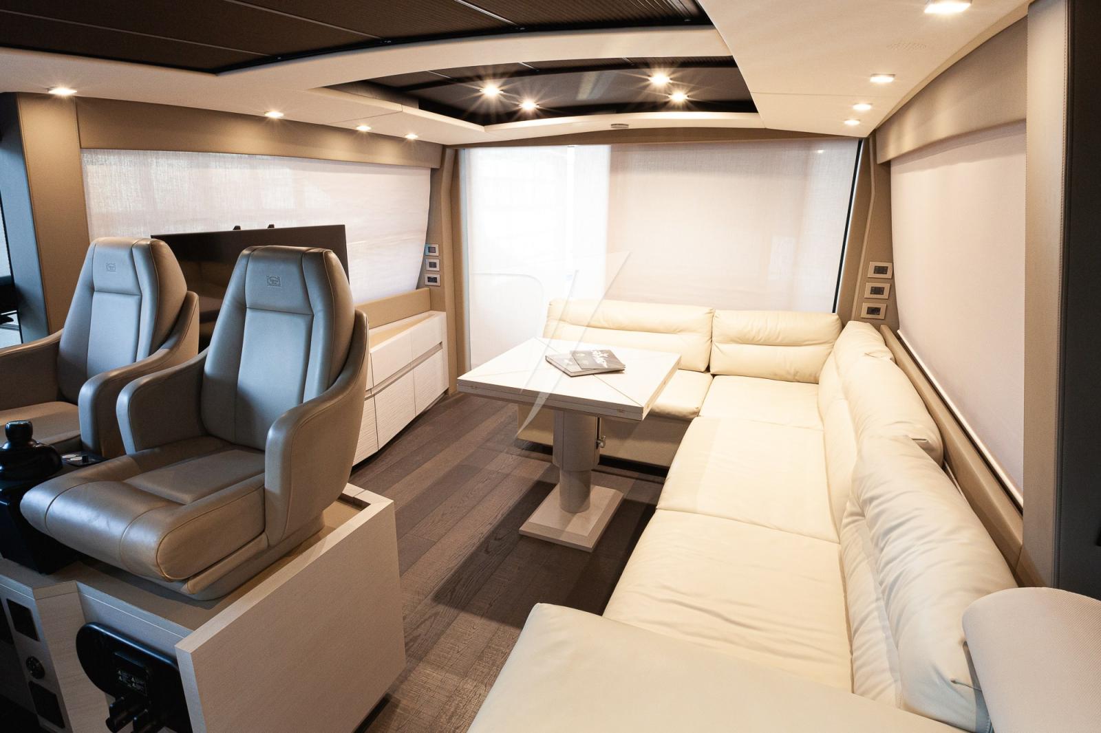 Fume/Gas Detector, Engine Alarm, Bilge Alarm, Water pressure pump, Auto-Trim, Folding cleats, Teak Side Decks, Deck Shower, Electric Flaps, Tender Garage, Hard top, Fire Extinguishing System, Compressor Air System, Flaps Indicators, Anchor Chain Washdown, Washbasin in the cockpit, Courtesy Lights, Underwater lights, Gangway, Entry door, Teak Cockpit, Shorepower connector, Water harbor connector system, Electric Windlass, swimming ladder, Stabilizers (Seakeeper), cockpit table, Living Room Foldable Table, guard rails with gates, Horn, Stern Winches, Bow Winches.