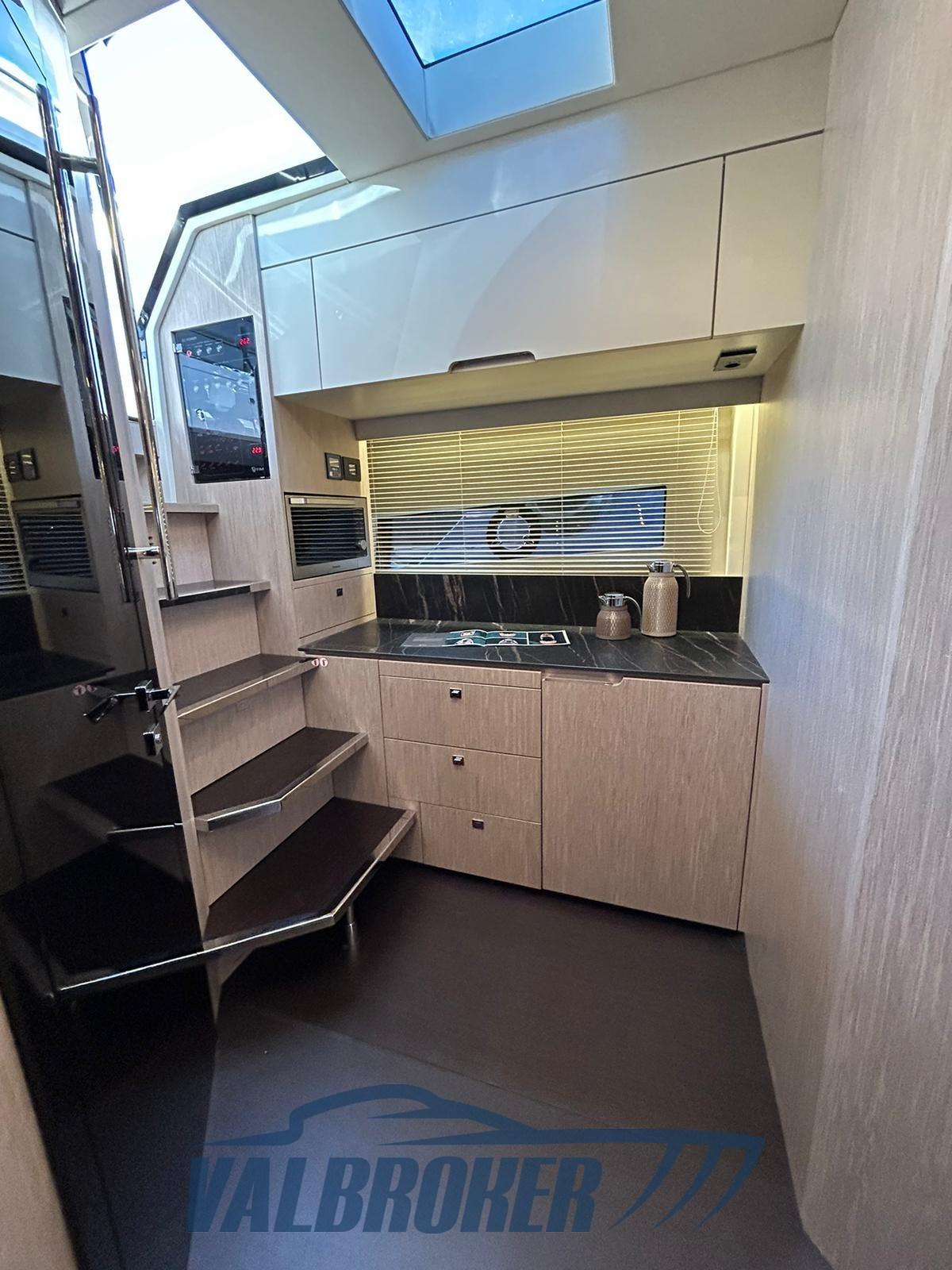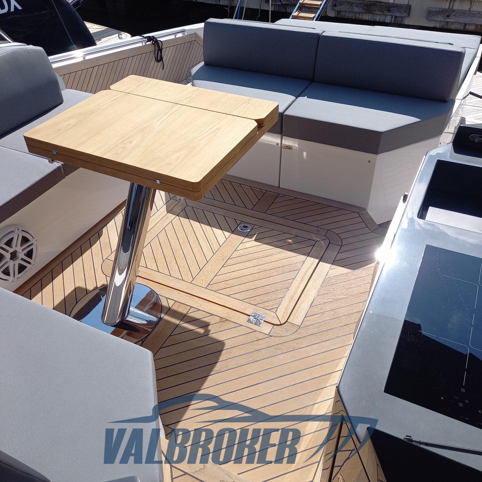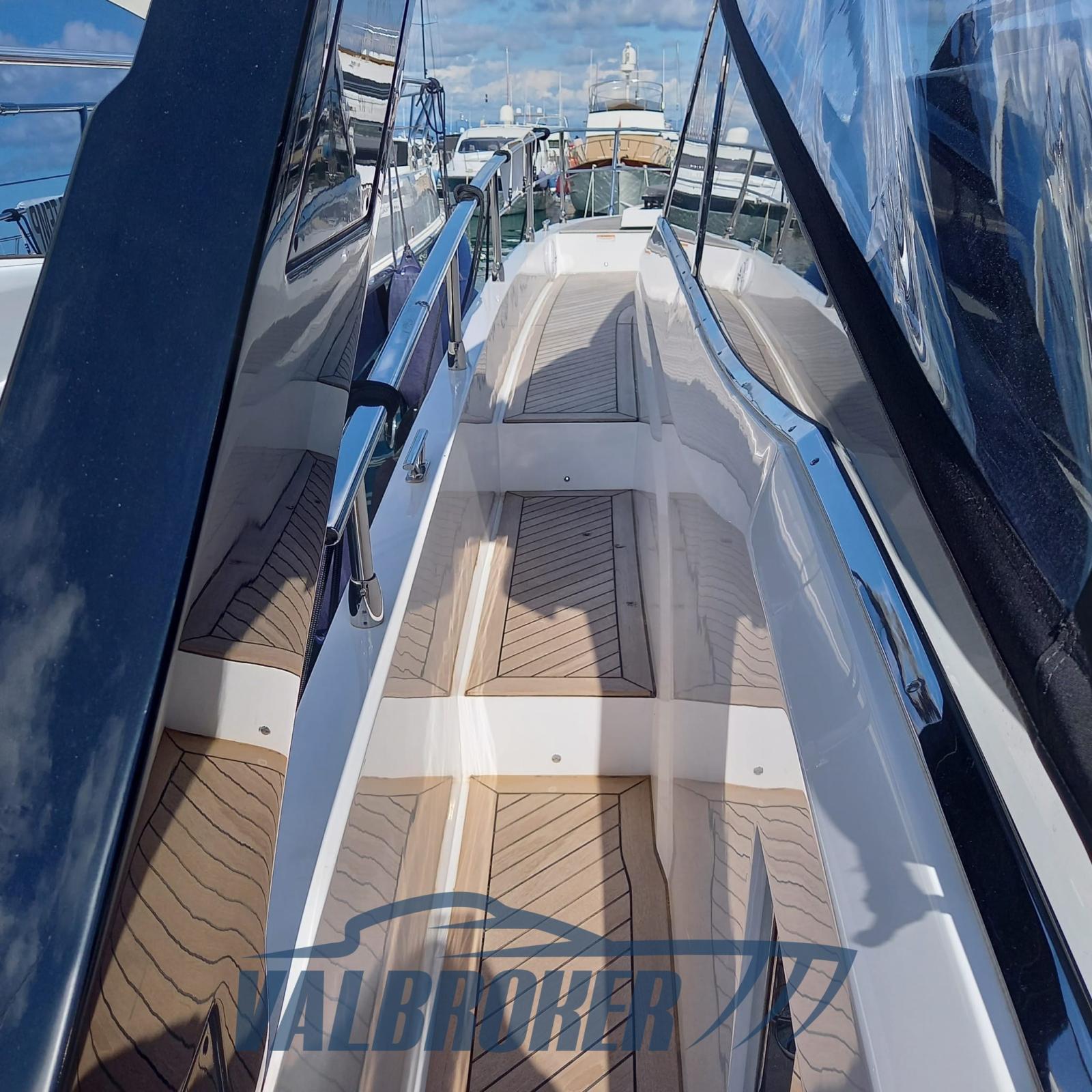 Anchor (elettronica DPS), Auto Dynamic Trim Interceptor (Volvo Penta), Water pressure pump, 4 Batteries, Folding cleats, Teak Side Decks, Deck Shower, Bow Thruster (proporzionale), Electric Flaps, Hard top, Fire Extinguishing System, Washbasin in the cockpit, Courtesy Lights, Underwater lights, Gangway (con gradini, idraulica a scomparsa), Platform (tender lift 400 kg), 2 Automatic Bilge Pump, Side door, Teak Cockpit, Electric Windlass, swimming ladder (idraulica), cockpit table (teak + tavolo prua), T-Top (nero lucido in carbonio), Bow Winches.