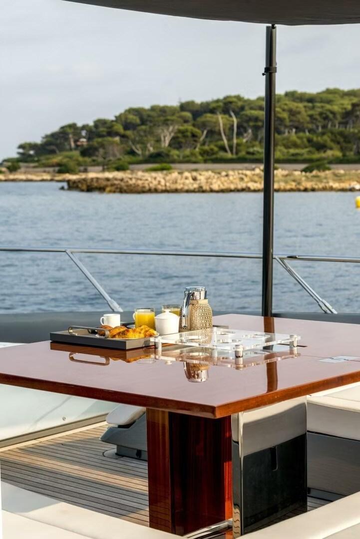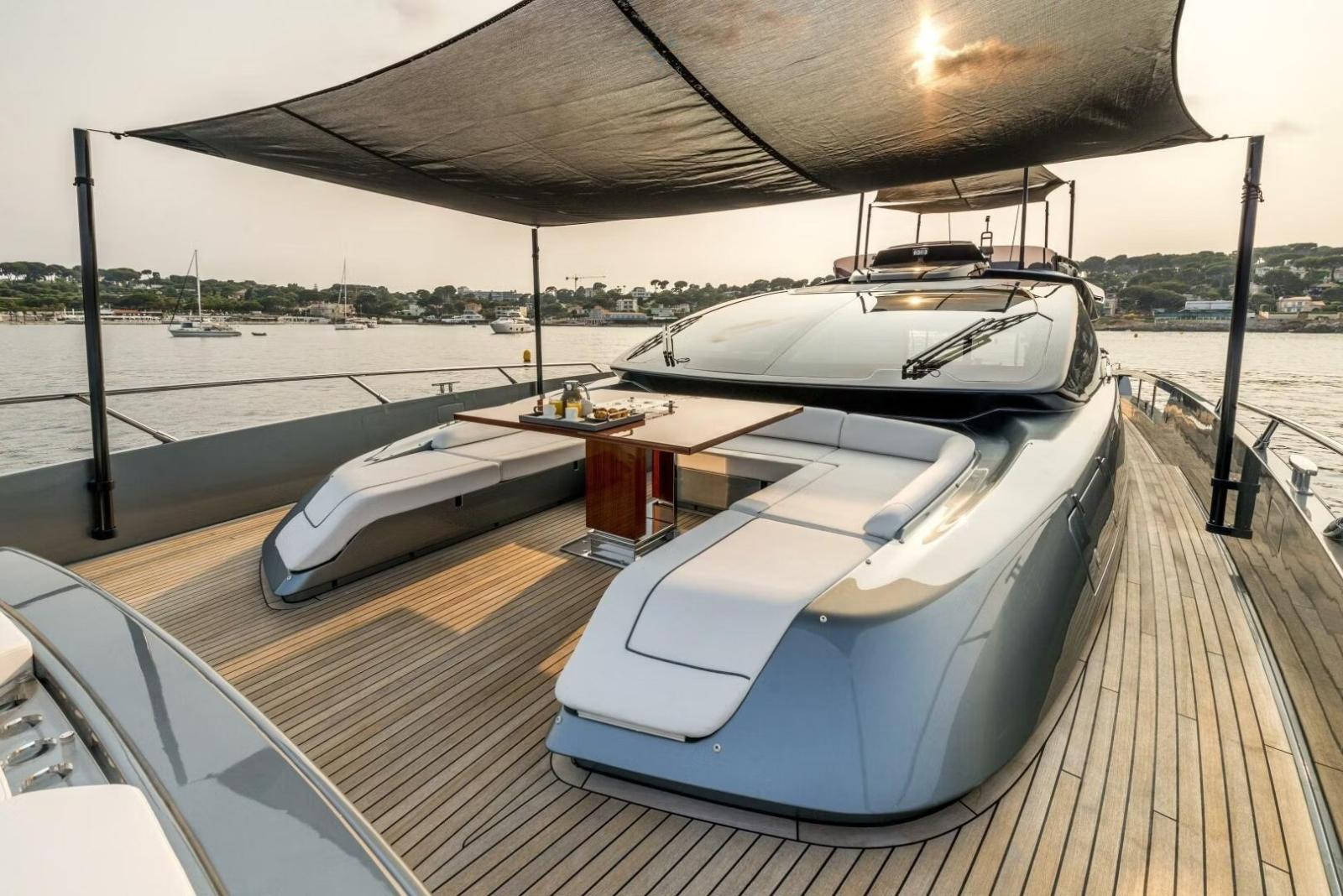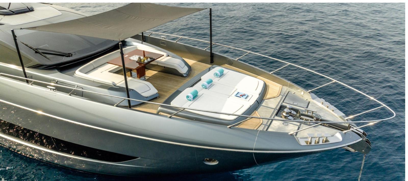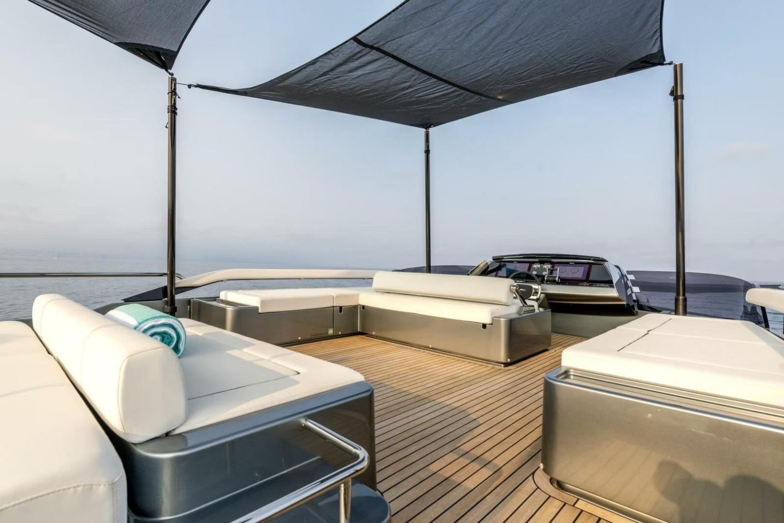 3 Bimini (a prua, poppa e flybridge con pali in carbonio), Cushions (esterna personalizzata), Electric Canopy (oscuranti).