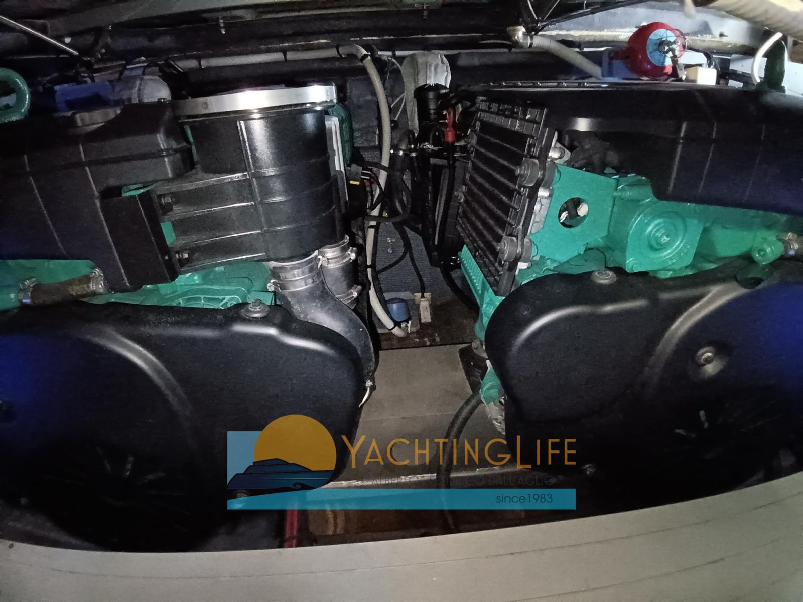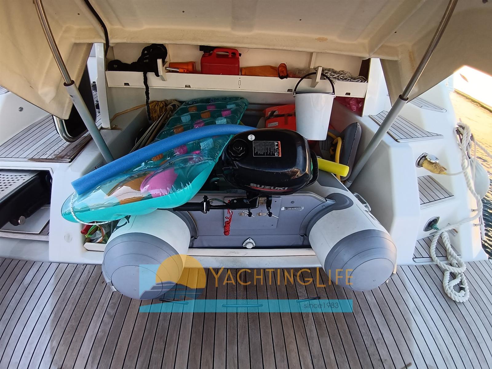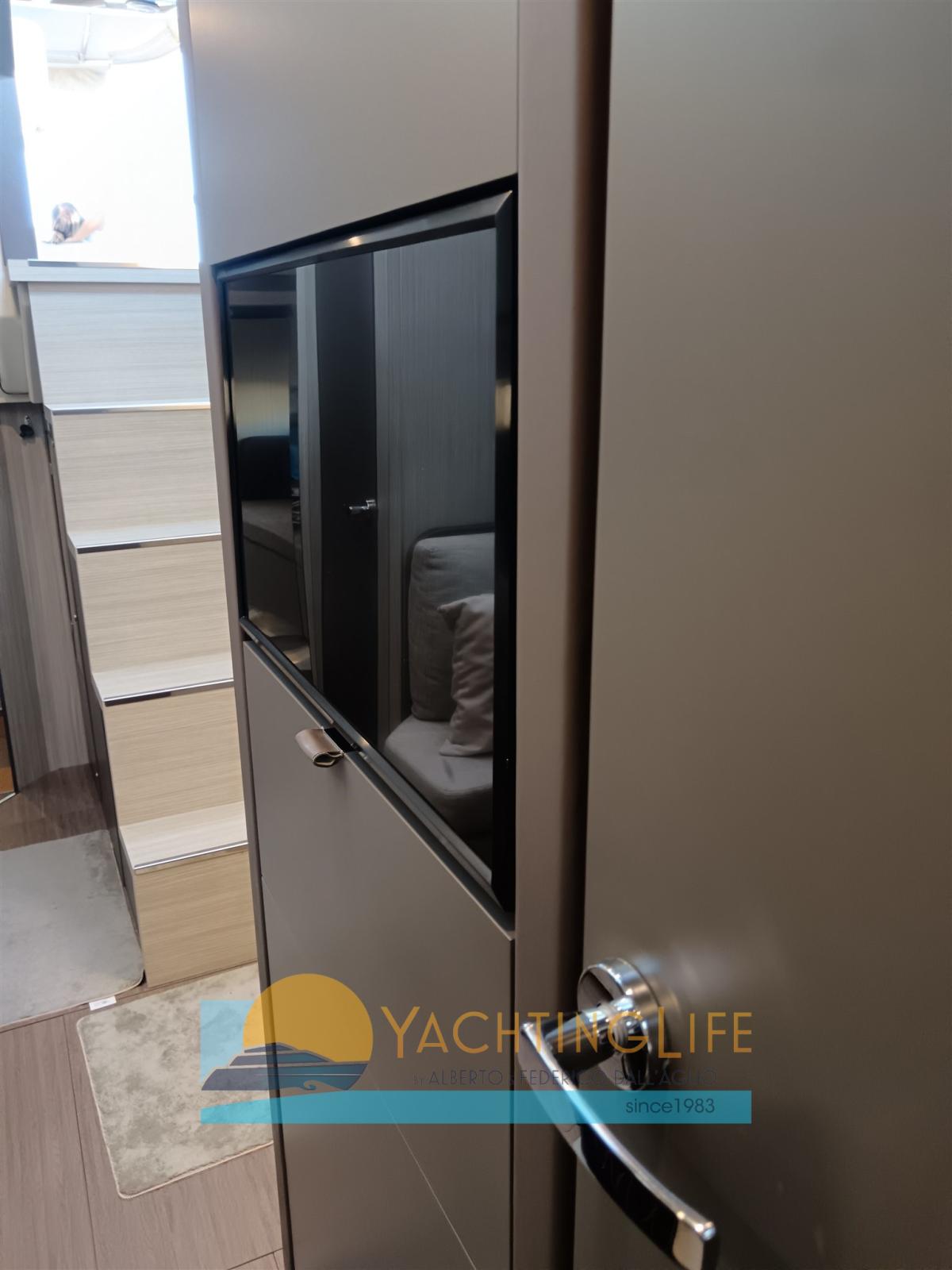 Engine Alarm, Bilge Alarm, Water pressure pump, Deck Shower, Electric Flaps, Tender Garage, Hard top, Fire Extinguishing System, Flaps Indicators, Washbasin in the cockpit, Courtesy Lights, Underwater lights, Gangway (idraulica), Platform (idraulica), Automatic Bilge Pump, Teak Cockpit, Shorepower connector, Electric Windlass, swimming ladder, cockpit table, Tender (e motore), Horn.