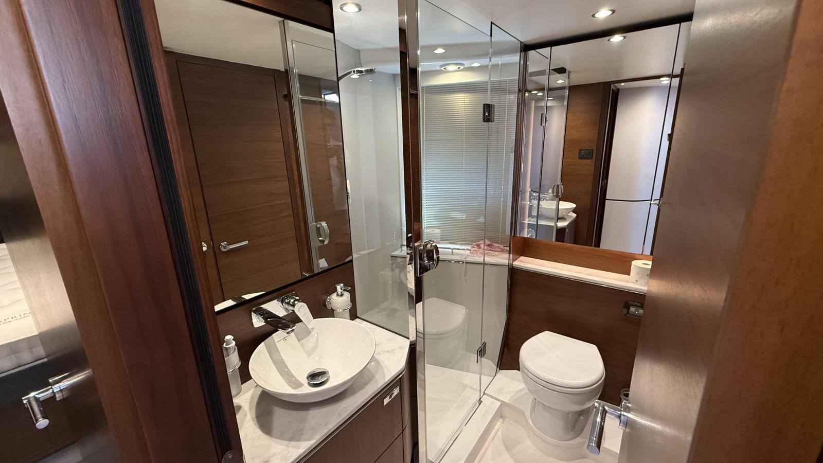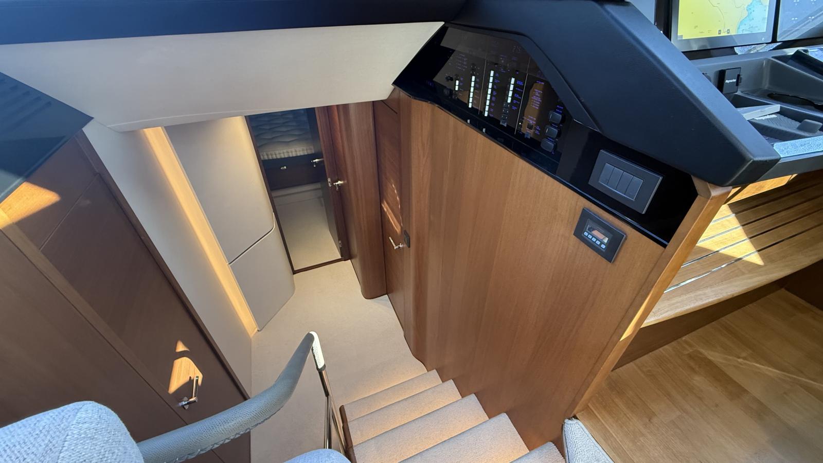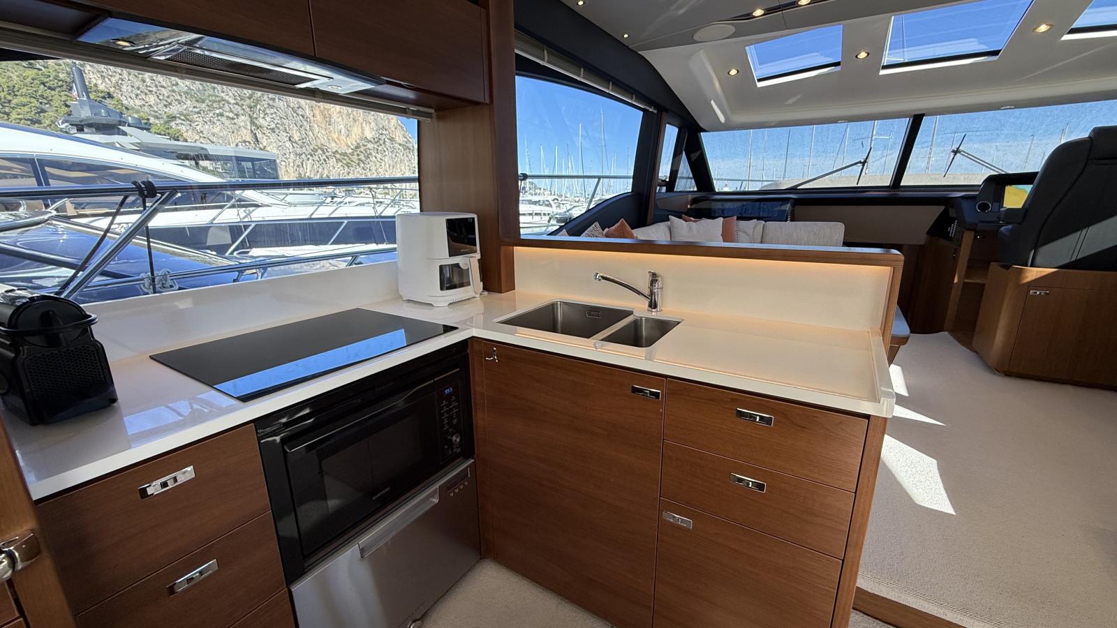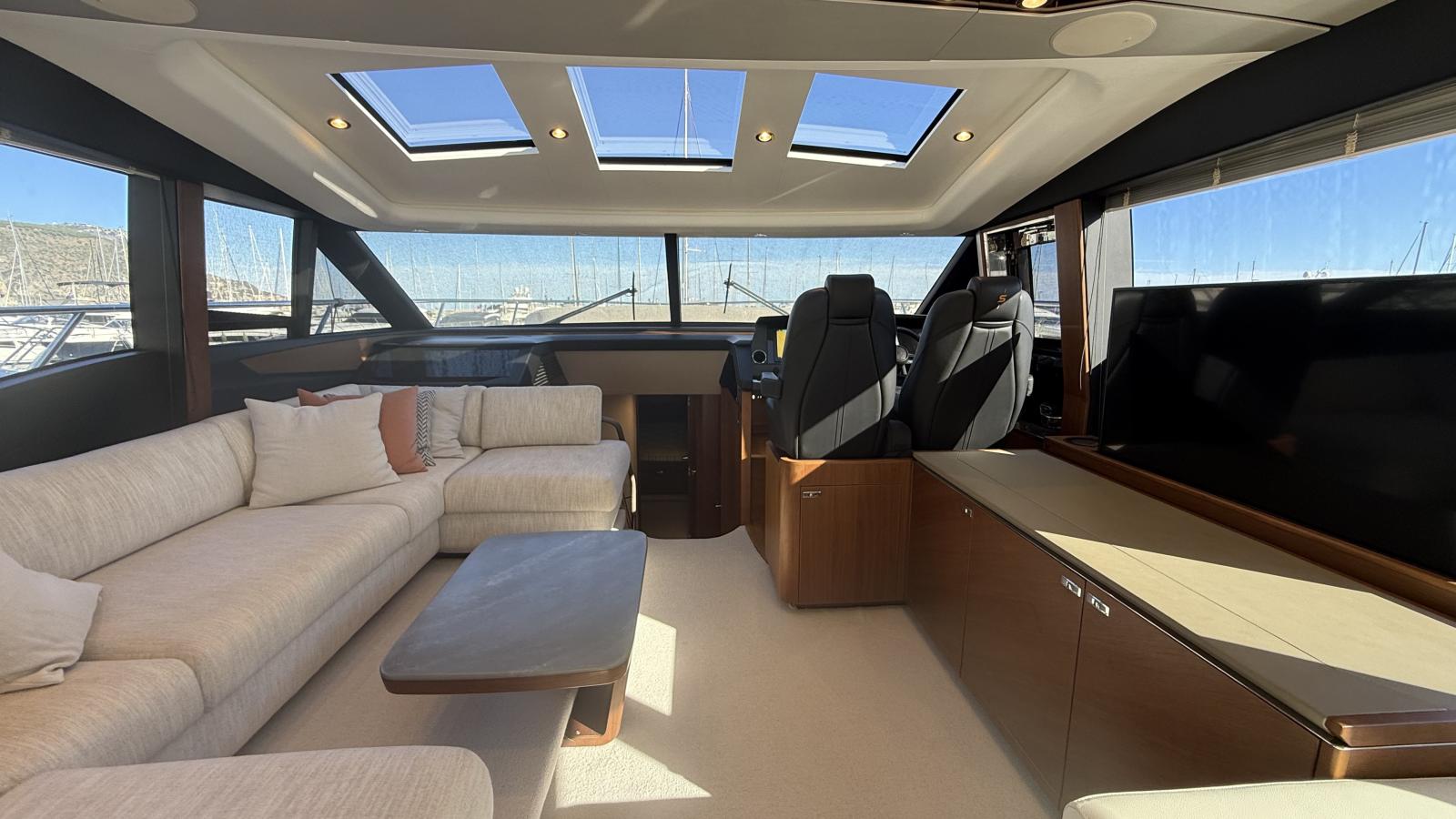 Designed for seamless indoor-outdoor living, her spacious aft cockpit flows effortlessly into the bright main salon through large sliding glass doors, creating an inviting and social atmosphere. The flybridge offers an additional dining area, sunbeds, and a fully equipped outdoor galley, perfect for entertaining at sea.