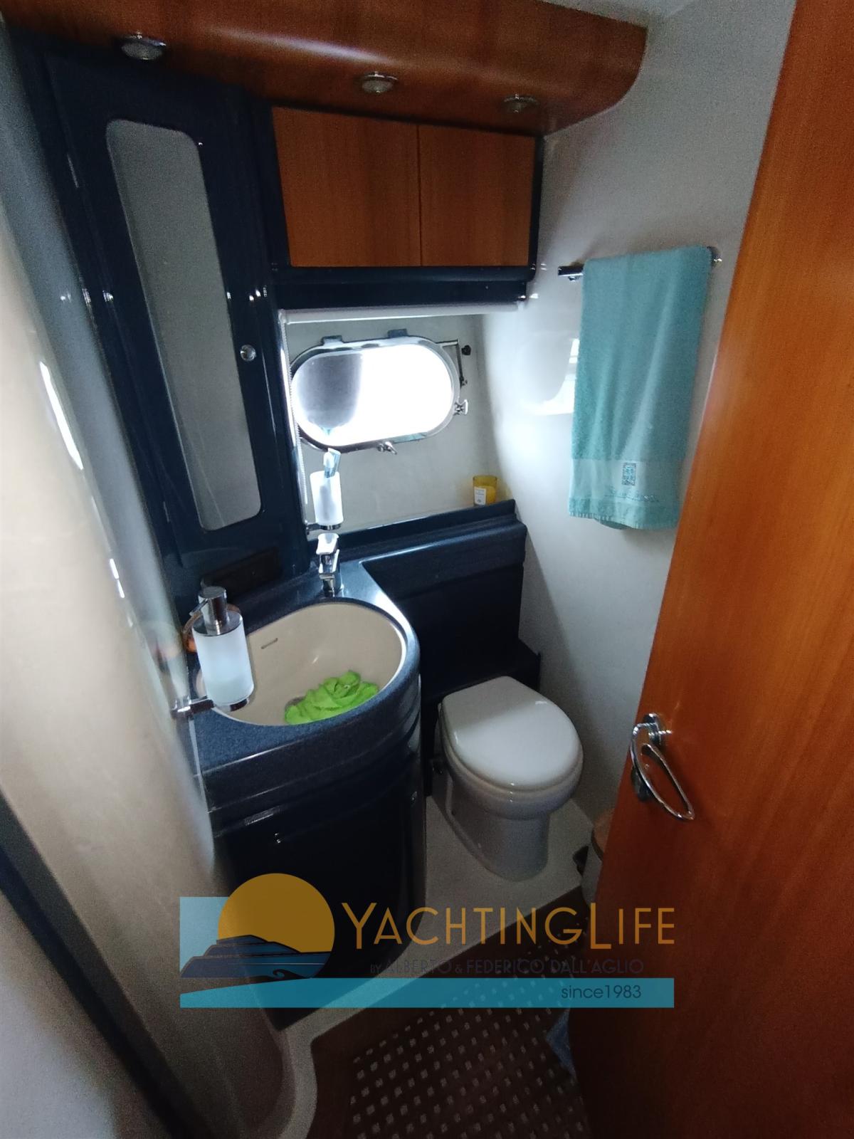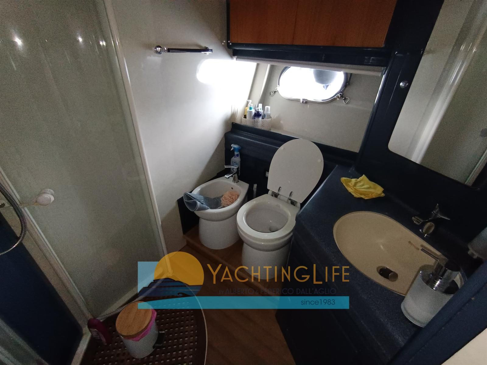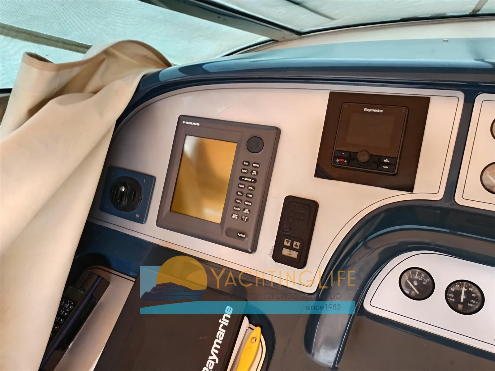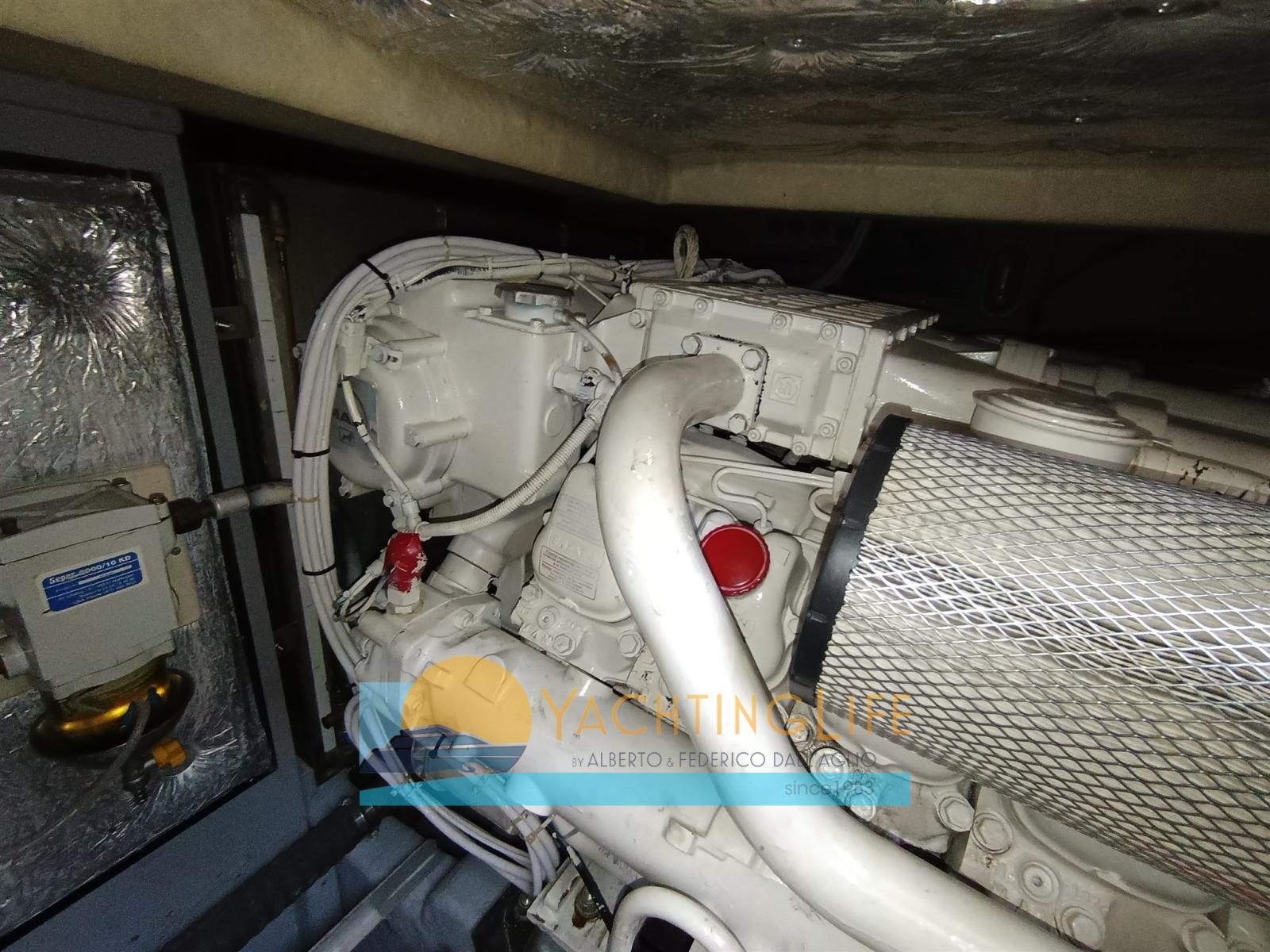 Engine Alarm, Water pressure pump, Shore power cable, Bow Thruster (Side Power), Directional Spotlight, Hydraulic Flaps, Fire Extinguishing System, Flaps Indicators, Washbasin in the cockpit, Courtesy Lights, Outboard engine for tender, Fenders, Gangway (Idraulica a scomparsa), Entry door, Shorepower connector, Rollbar, Electric Windlass, swimming ladder, cockpit table, Tender, Horn, Stern Winches.