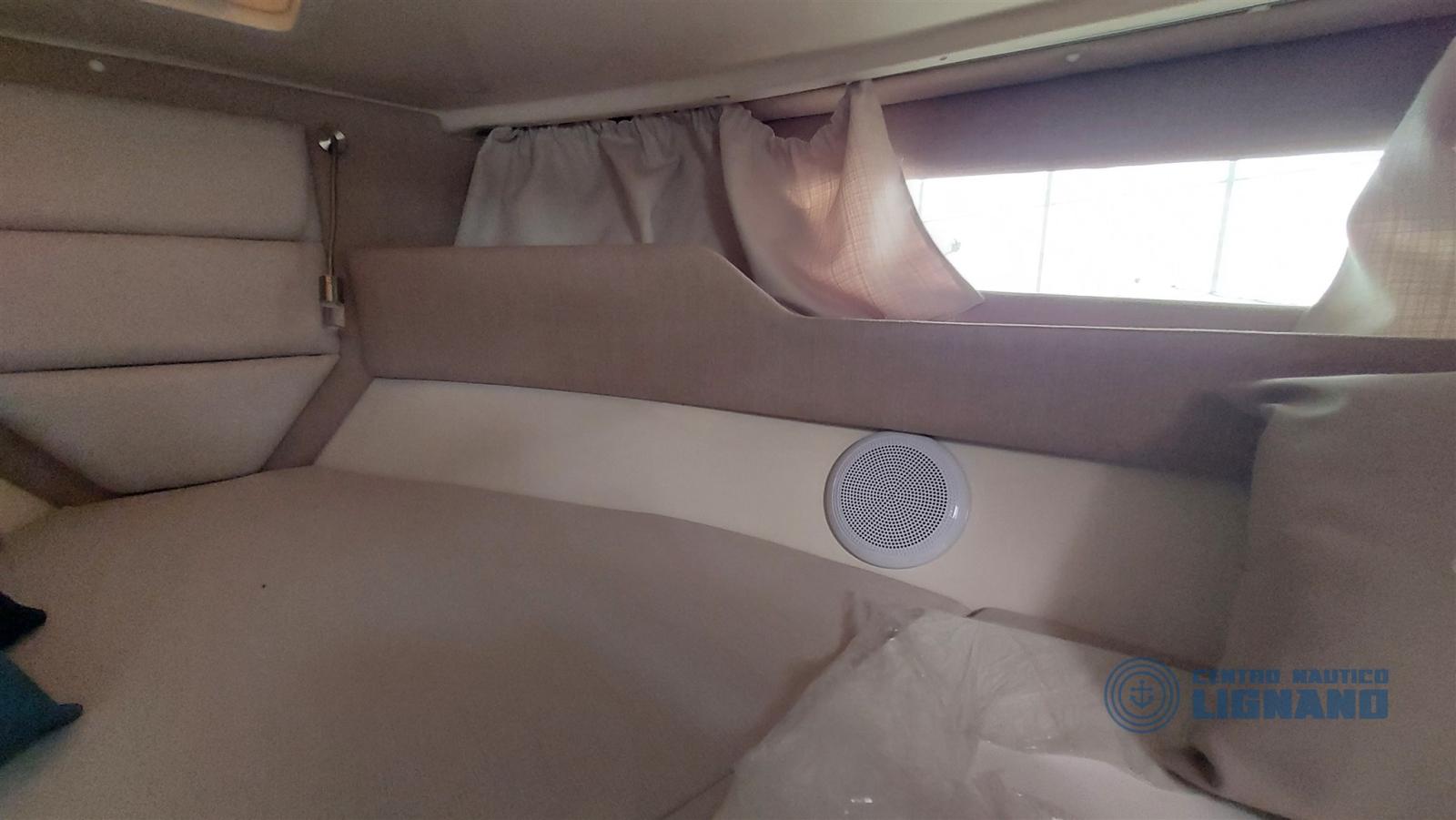 white hull, complete beige cushions, hatch, porthole, refrigerator, bow sundeck, handrail and windshield, plexiglass windows, bow roller, haulage hooks, cleats, bow handrail, table foot, stainless steel swim ladder, fuel system 270lt, water and shower system 67lt, electrical system, compass, navigation lights, 360° light, blue LED lights in the cabin, external sink. Stern platforms with synthetic teak upholstery, alternative cushions (blue-grey), automatic flaps, Gas stove, Sink with tap (in cabin), Hydraulic steering, Black satin stainless steel roll bar with awning, Stereo with 4 speakers, Wireless mobile phone charging box, Hydraulic steering