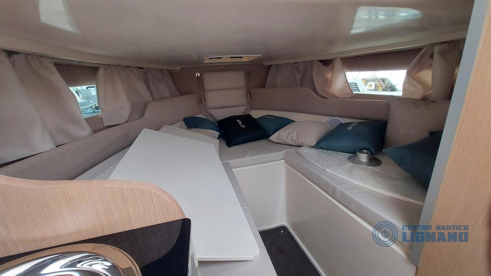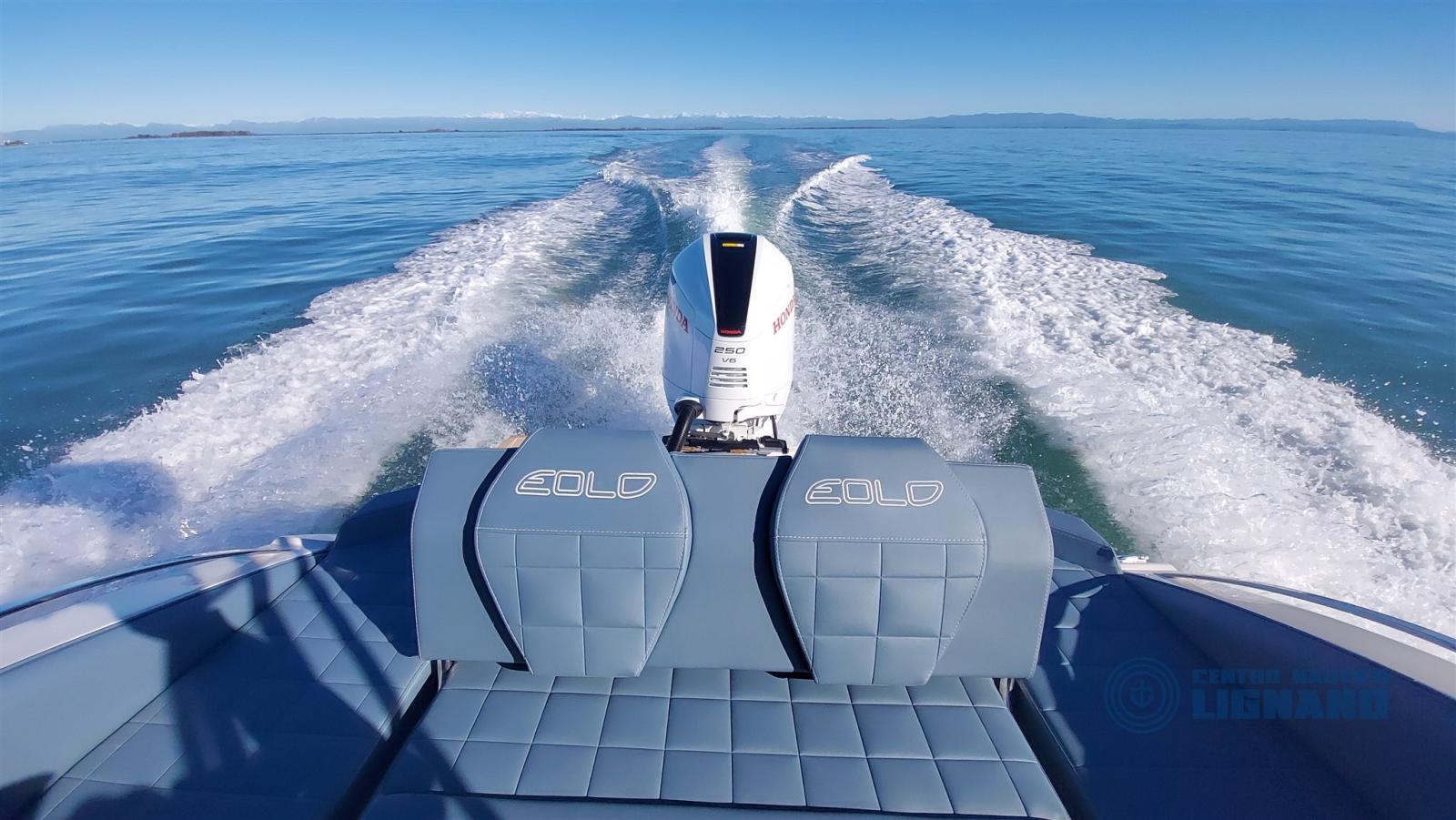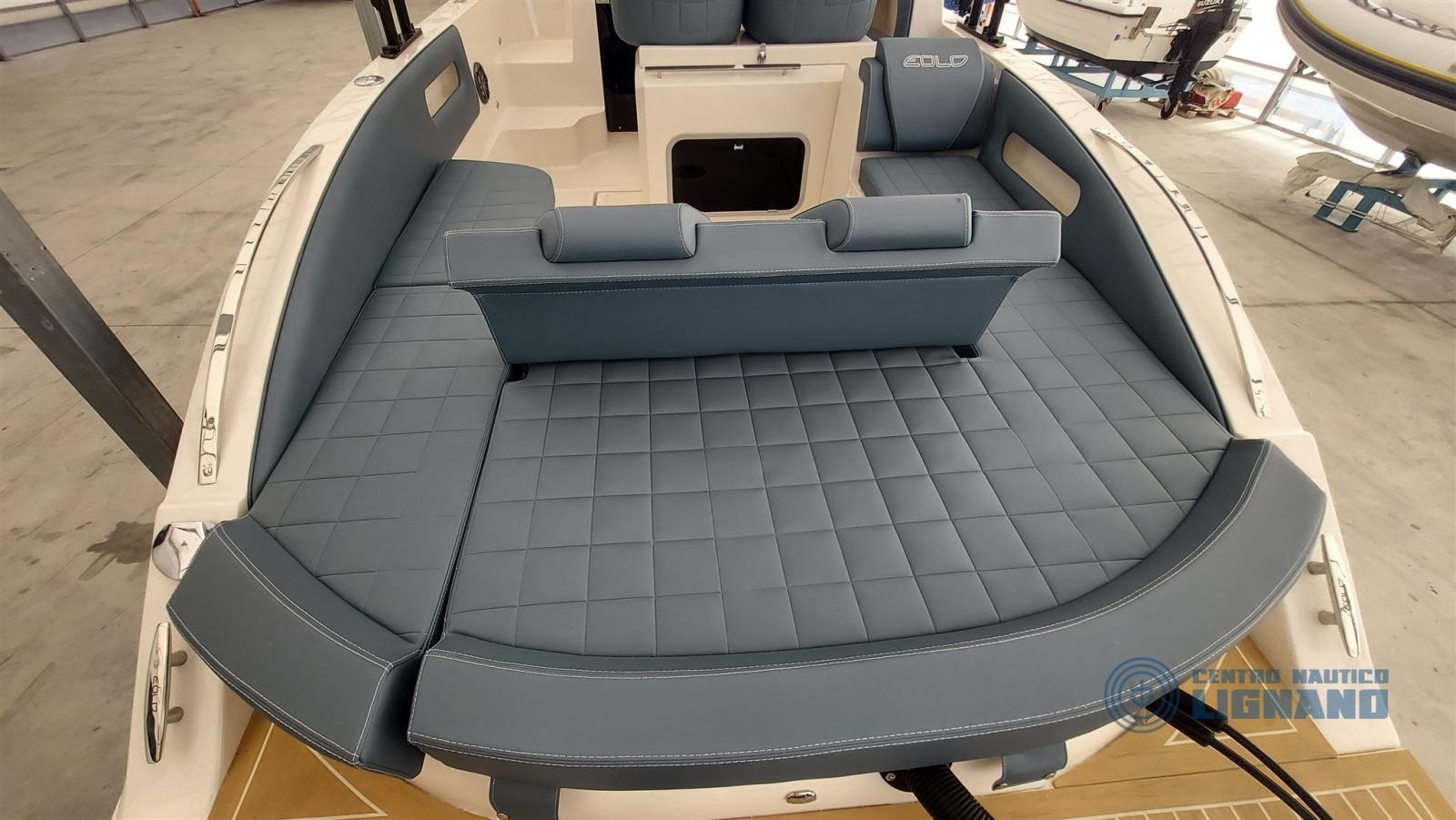 New boat Eolo 830 Day HBS ready for delivery and immediately visible at the Centro Nautico Lignano headquarters. Boat complete with standard accesses, LIST: white hull, full beige cushions, hatch, porthole, refrigerator, bow sundeck, handrail and windshield, plexiglass windows, bow roller, haulage hooks, cleats, bow handrail, table foot, stainless steel swim ladder, 270lt fuel system, 67lt water and shower system, electrical system, compass, navigation lights, 360° light, 12V socket, horn, Bilge pump, blue LED lights in the cabin, outdoor sink. Stern platforms with synthetic teak cladding.
