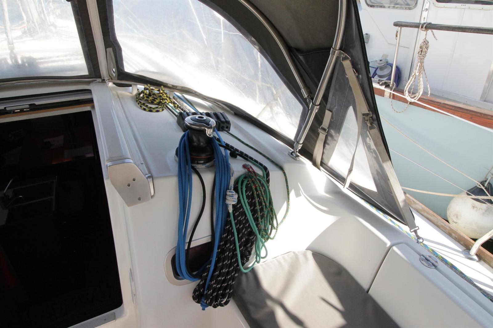 Engine Alarm, Anchor (plate), Water pressure pump, 2 Batteries (x100ah + 77ah pour moteur), Deck Shower (avec eau chaude), Wind Generator, Battery Monitor, Auxiliary Engine (2,5cv 4t), Manual Bilge Pump, Shorepower connector, Electric Windlass, swimming ladder, Outboard Engine Support Bracket, cockpit table (bois avec rallonge), Tender (compact 2m), 4 Winch (HARKEN).