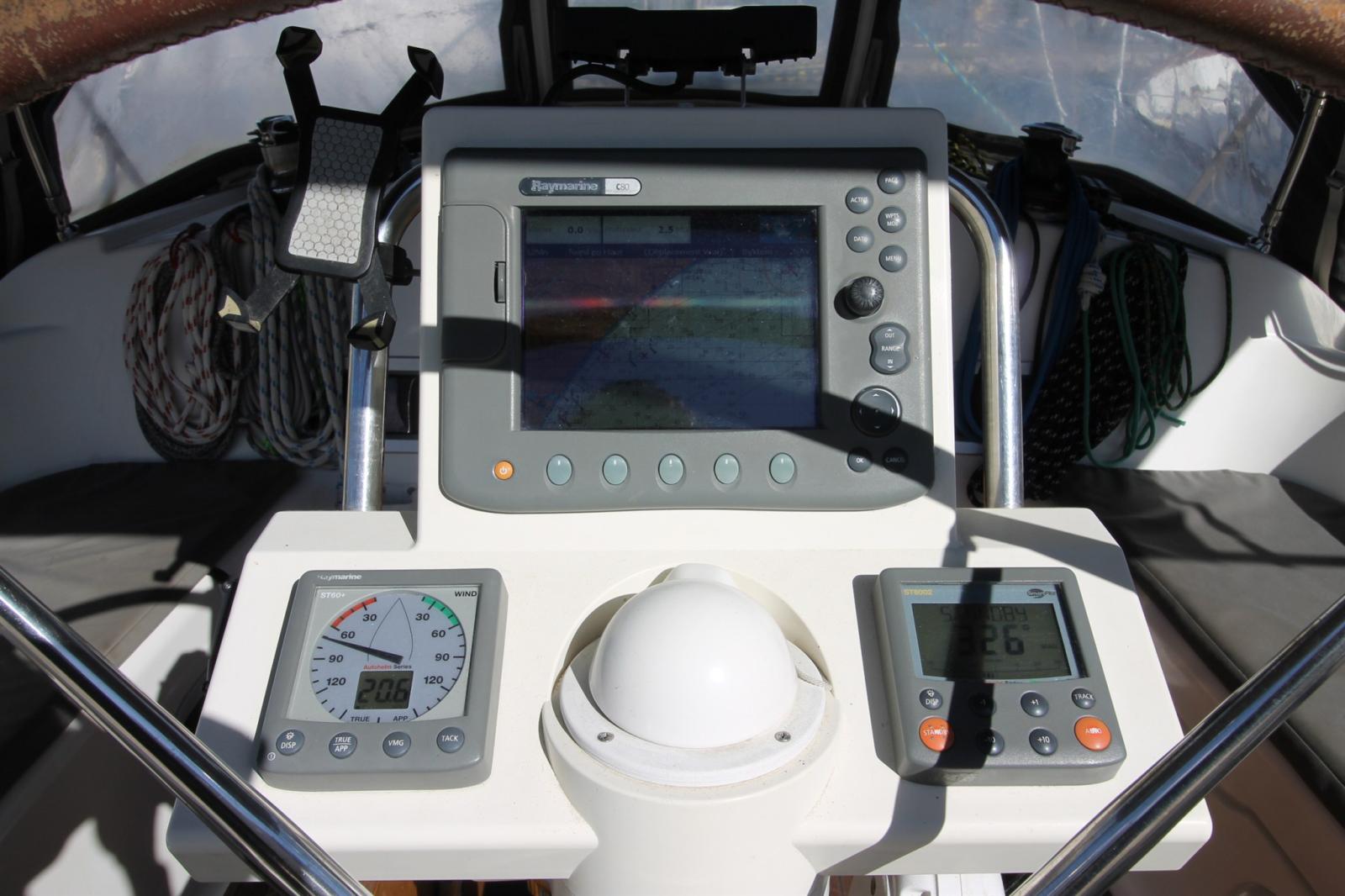 AIS (classe B (emetteur, recepteur)), Rudder angle indicator, Odometer (Raymarine ST60), DSC vhf (ICOM M330), Autopilot (sur mèche de safran), Chartplotter (raymarine E80), VHF Radio (portable), Sonar (Raymarine ST60), Wind Station (Raymarine ST60).