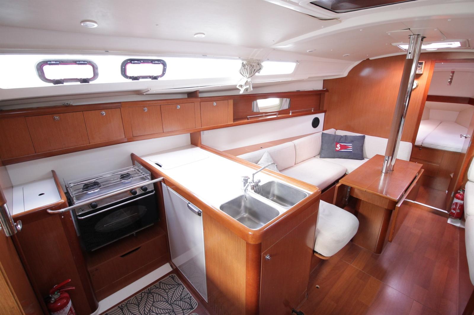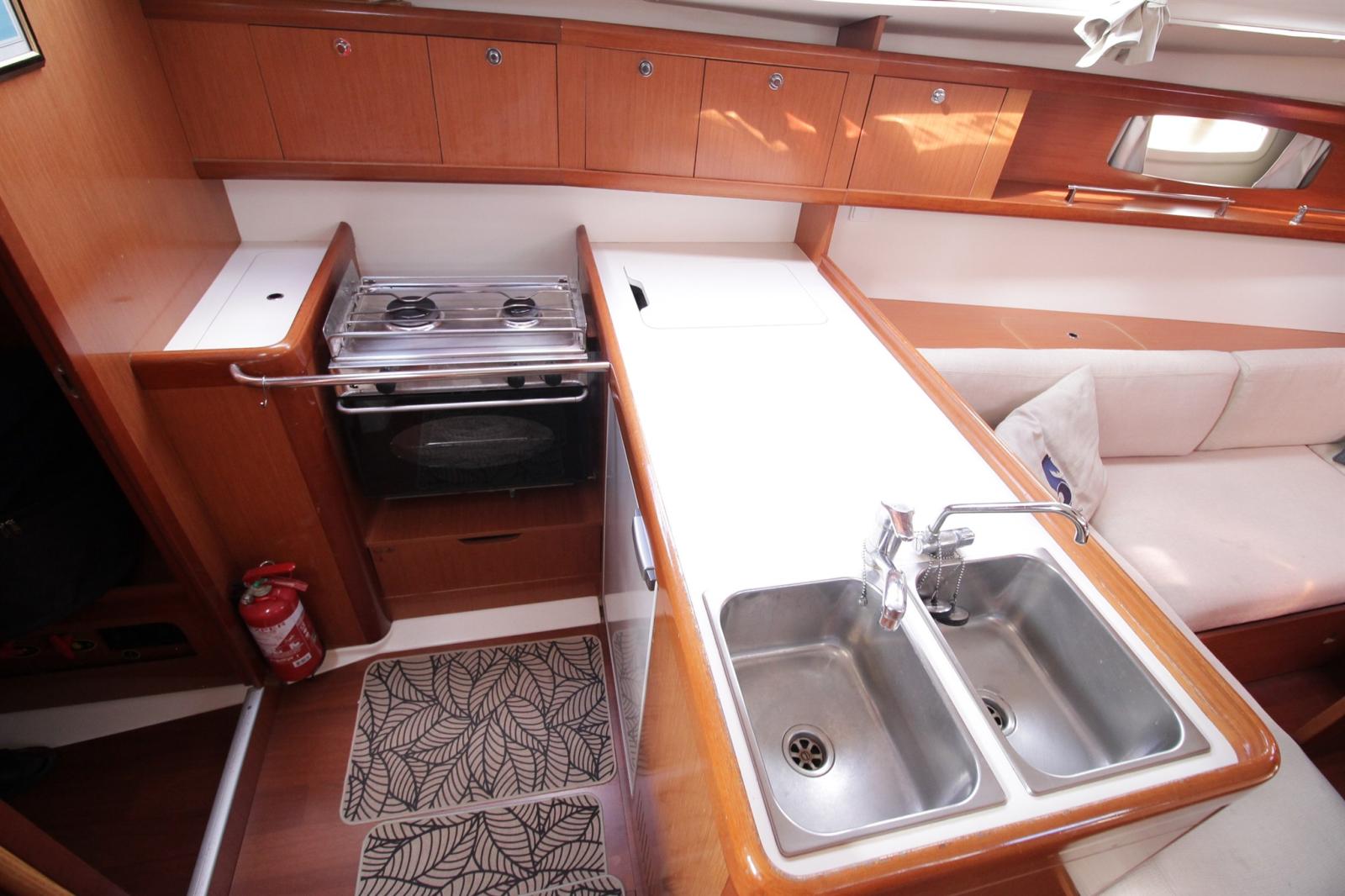Galley, Oven (+ 2 feux gaz), Refrigerator (porte en façade), Microwave Oven (220v).