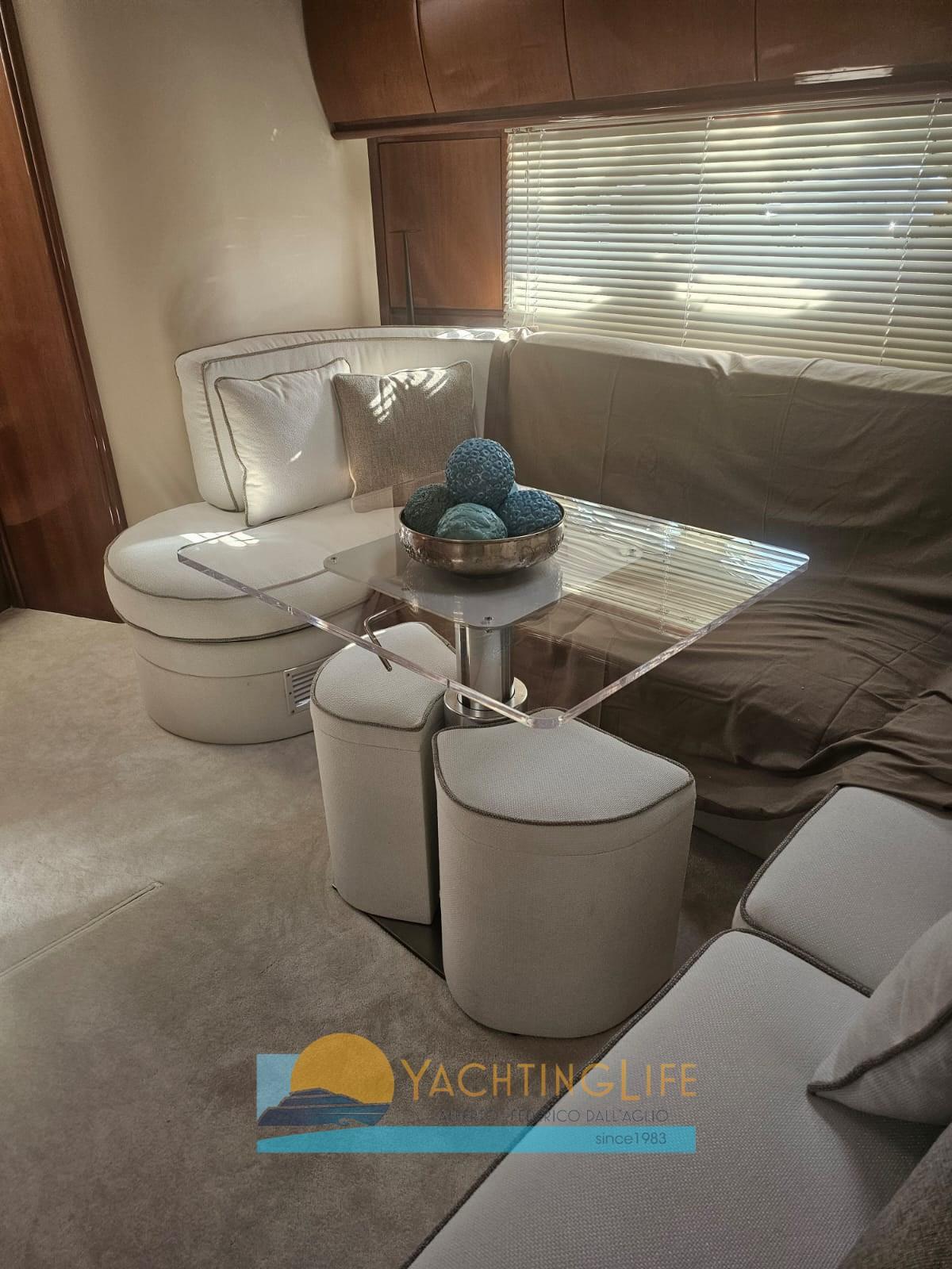 Engine Alarm, Bilge Alarm, Water pressure pump, Deck Shower, Hydraulic Flaps, Hard top, Fire Extinguishing System, Flaps Indicators, Courtesy Lights, Gangway (idraulica), Platform, Automatic Bilge Pump, Teak Cockpit, Shorepower connector, Electric Windlass, swimming ladder, cockpit table, Horn, Stern Winches.
