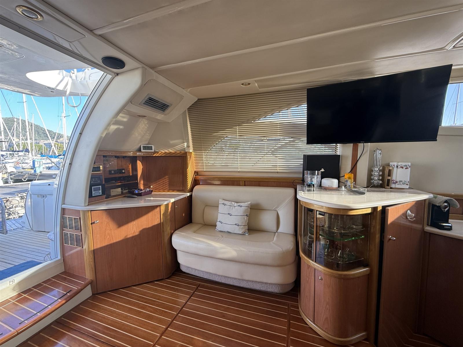 Engine Alarm, Bilge Alarm, Alternator, Water pressure pump, Shore power cable, Guard rail, Deck Shower, Twin Steering, Directional Spotlight, Electric Flaps, Fire Extinguishing System, Flaps Indicators, Washbasin in the cockpit, Courtesy Lights, Underwater lights, Fenders, Gangway, Platform, Automatic Bilge Pump, Manual Bilge Pump, Entry door, Teak Cockpit, Shorepower connector, Electronic instrumentation repeater, Rollbar, Electric Windlass, swimming ladder, cockpit table, guard rails with gates, Horn.