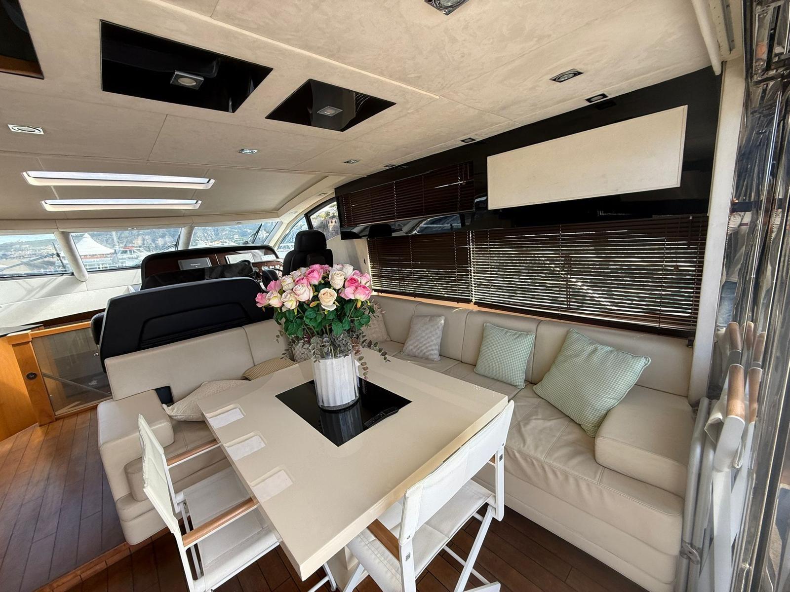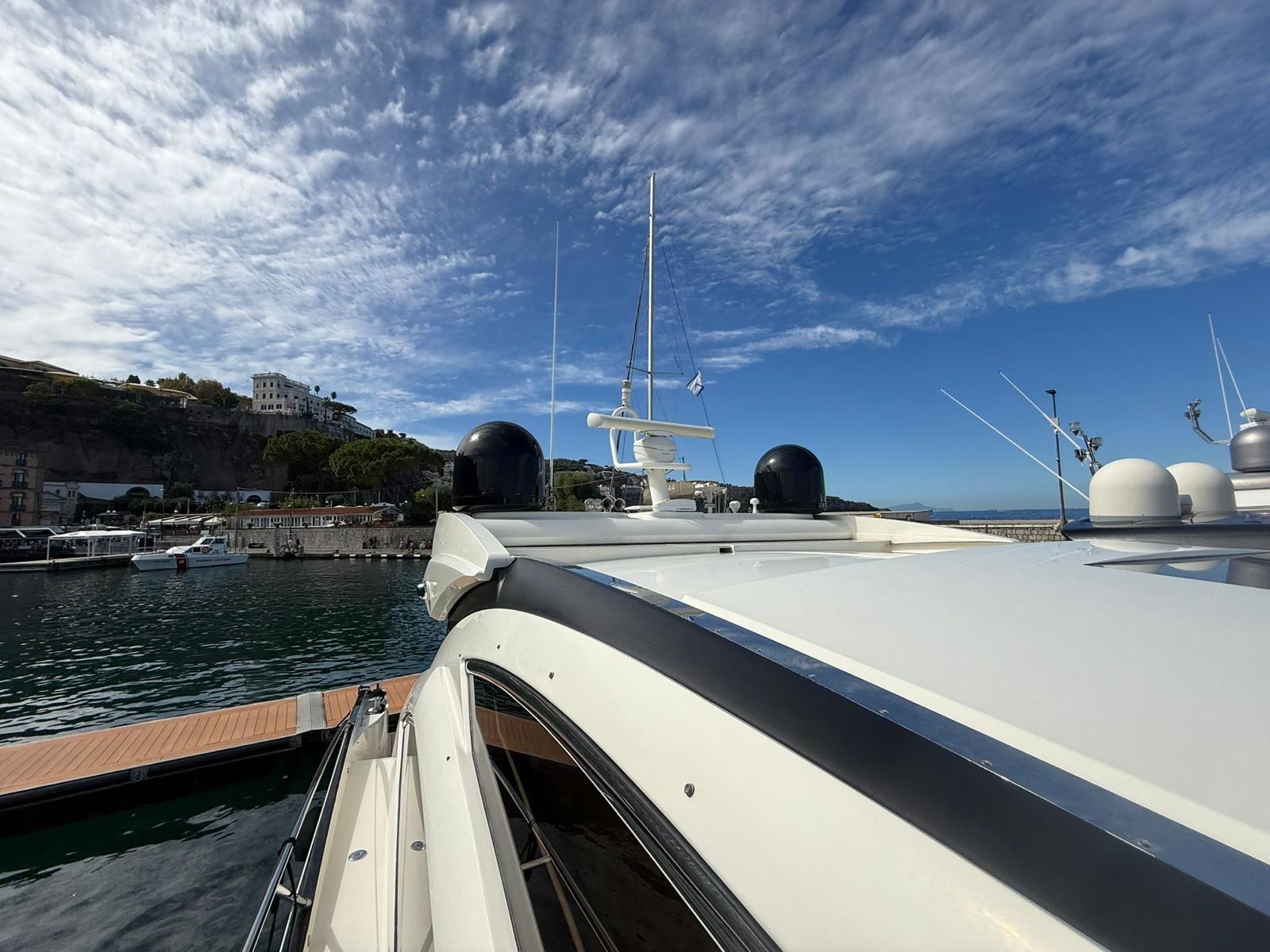 Engine Alarm, Bilge Alarm, Alternator, Water pressure pump, Teak Side Decks, Deck Shower, Hydraulic Flaps, Tender Garage, Hard top, Fire Extinguishing System, Flaps Indicators, Anchor Chain Washdown, Washbasin in the cockpit, Courtesy Lights, Underwater lights, Gangway, Platform, Automatic Bilge Pump, Manual Bilge Pump, Teak deck, Entry door, Teak Cockpit, Shorepower connector, Water harbor connector system, Electric Windlass, swimming ladder, cockpit table, Living Room Foldable Table, Tender, Horn, 2 Stern Winches, Bow Winches.