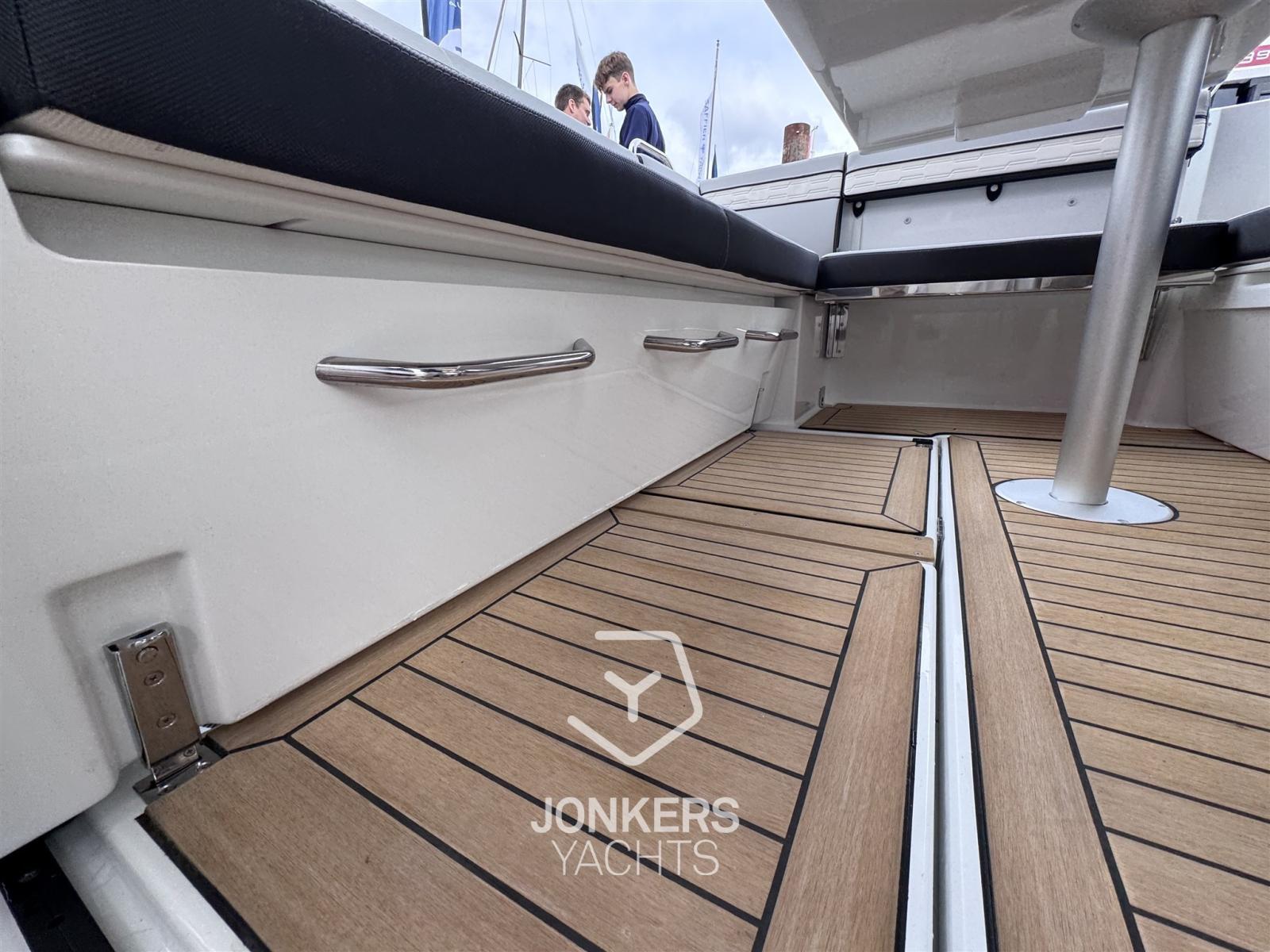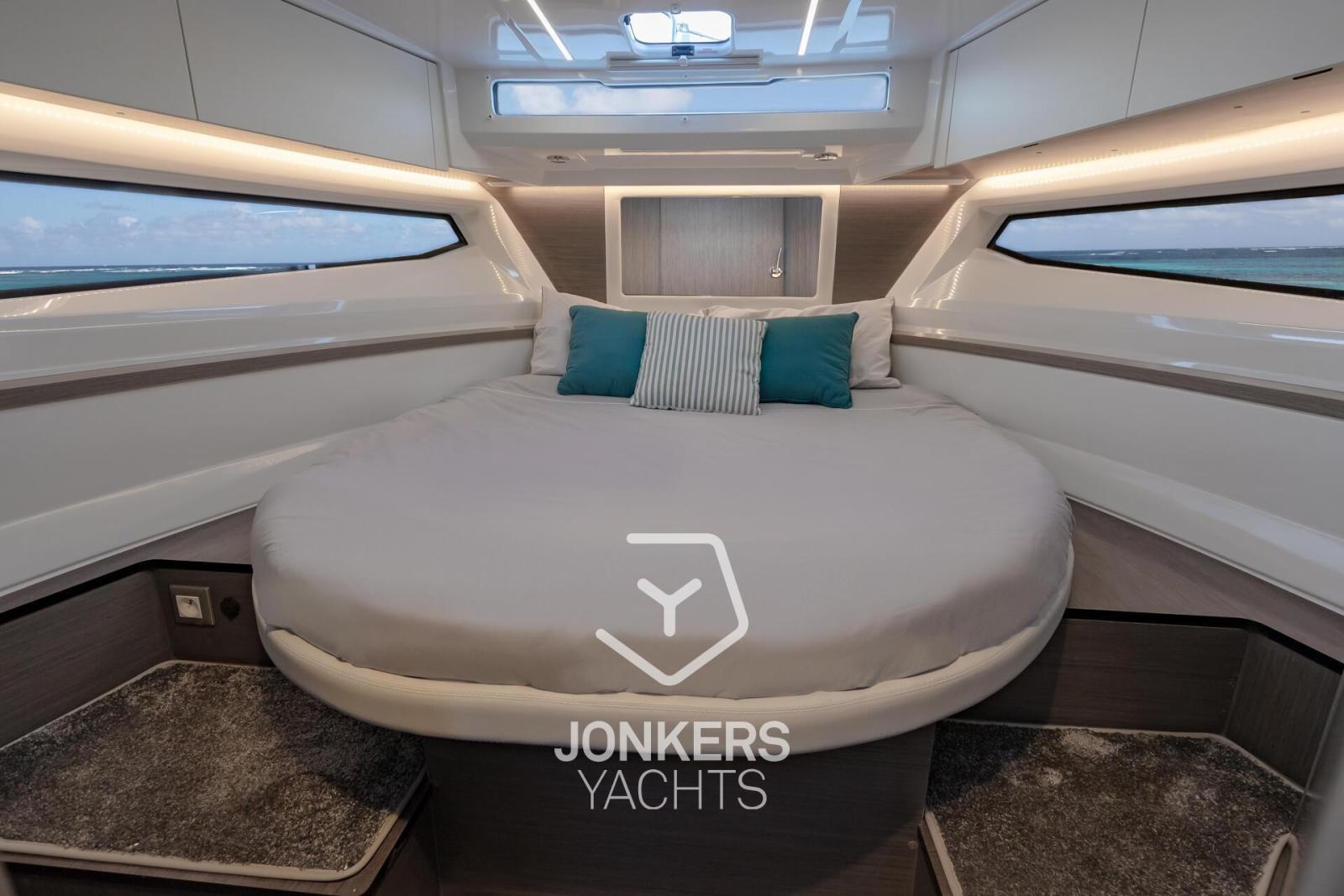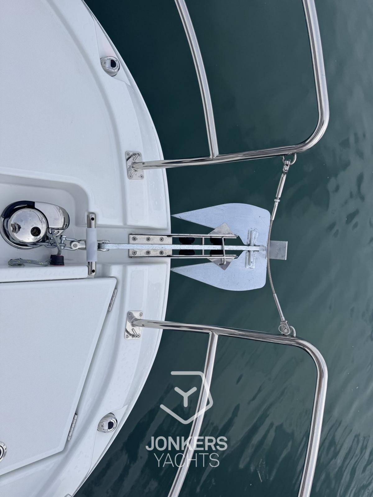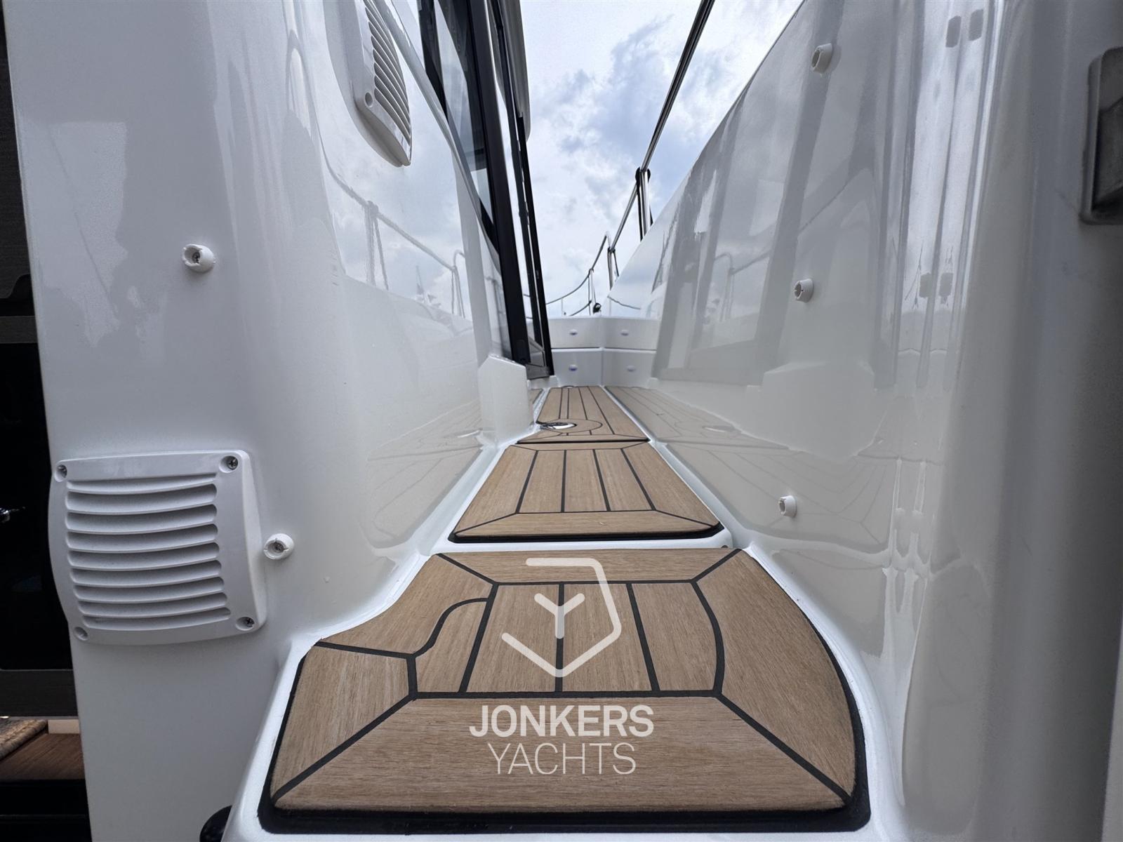 The large windows in the hull and the coachroof roof, fit seamlessly into the powerful, sporty silhouette. The new hull allows planing from 20 knots, a speed easily achieved with her two engines, 2 x 250 HP at maximum speed, providing comfort and maneuverability.