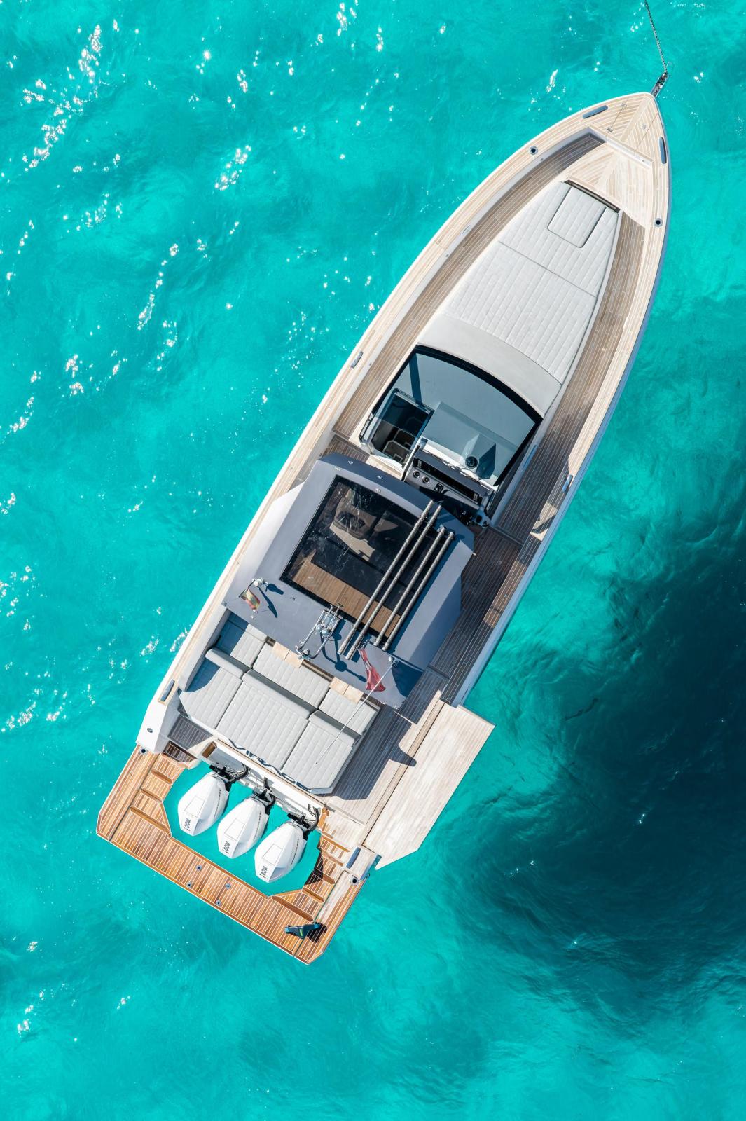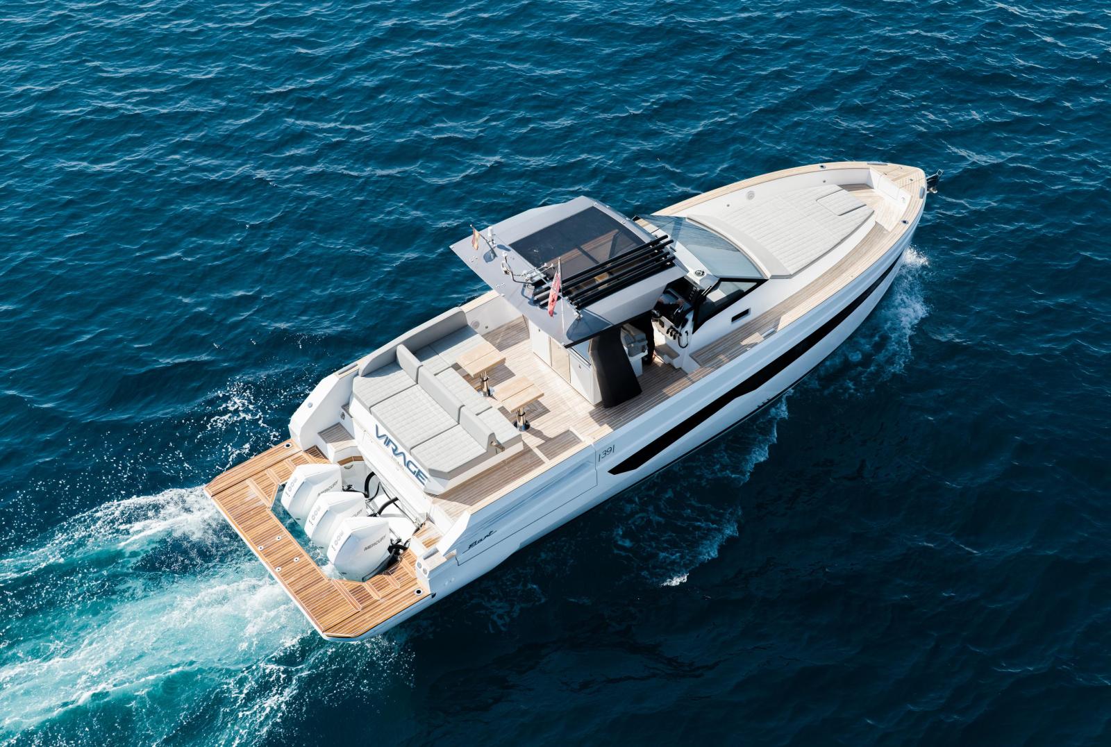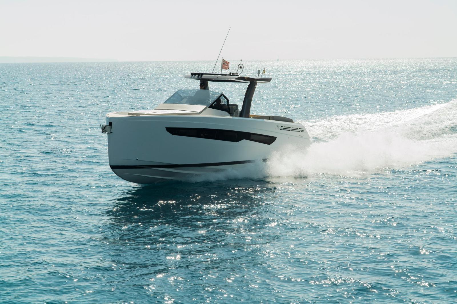 Built in 2023 by Fiart Mare in Baia, Naples, this exceptional open motor yacht represents one of the finest examples of Italian craftsmanship available on the market today. Measuring 12.61 metres LOA with a 3.86-metre beam, the Fiart 39 combines a sleek, aggressive hull design with remarkable onboard comfort, including two private cabins ideal for overnight cruising across the Mediterranean. Power comes from a triple Mercury Verado V8 300hp outboard package delivering 900 horsepower, paired with a full Garmin electronics suite, Sleipner bow thruster, and retractable sunshade over the helm. The generous teak cockpit offers expansive seating and socialising space, while the clean white GRP hull and minimalist Italian lines make her instantly recognisable underway. Currently located in Puerto Portals, Mallorca. VAT not paid. Available for immediate viewing.