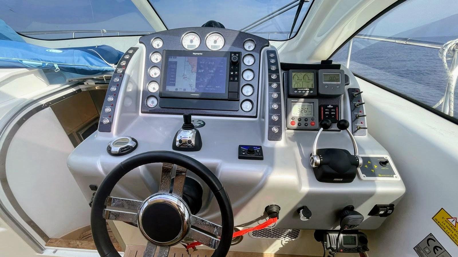 Rudder angle indicator, Electronic engine control, Chain counter (Quick), DSC vhf (Raymarine), Joystick, Autopilot (Raymarine ST6002), Plotter with GPS antenna (Raymarine axiom Pro12), VHF Radio (Portable), Engine Measuring Instruments.