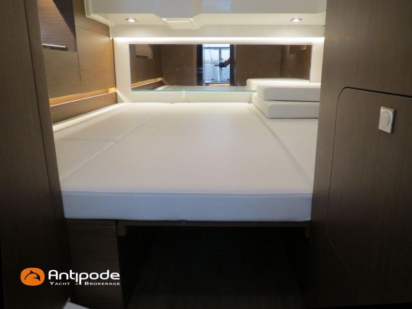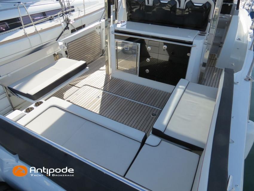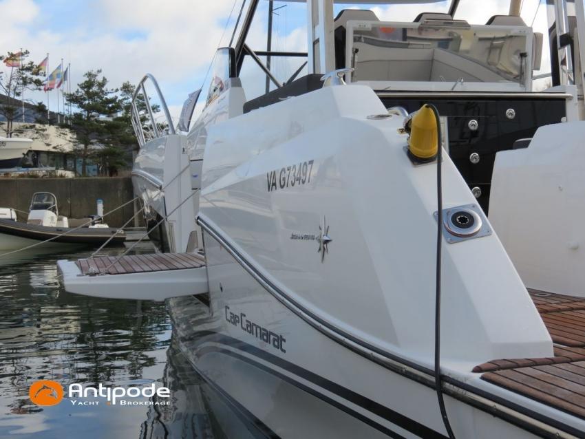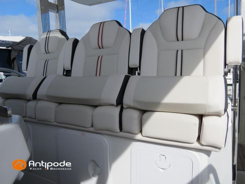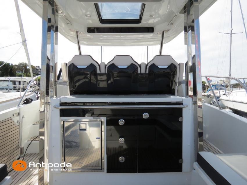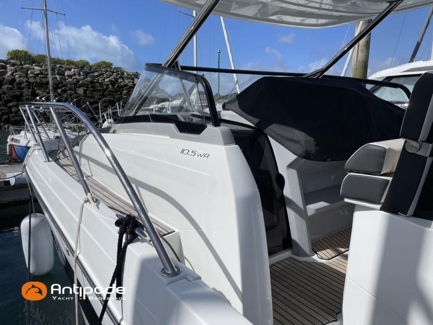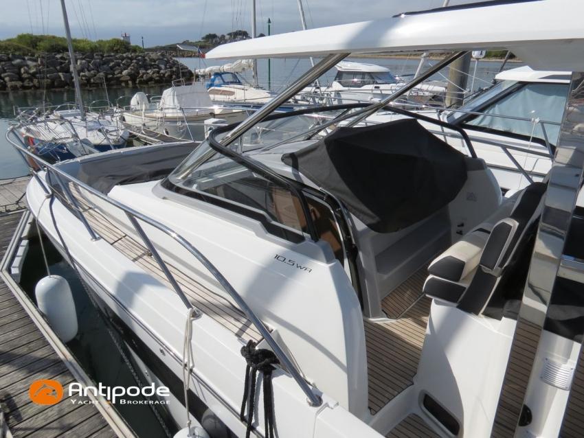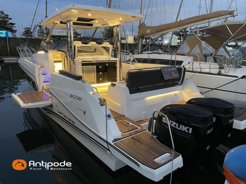 CAP CAMARAT 10.5 WA, 2024, first hand, SUZUKI DF300 AP (x2), 2x300 hp (89 hrs), Bow thruster, Version S2, door fo aft cabin, Premiere Silvertex Ice layout, PVC Marine Pure White saloon upholstery, Saloon table convertible in double bed, Mosquito screens for opening windows and hatches, Port removable seat in cockpit, Teak slatted cockpit floor, Teak bathing platforms, Cockpit T-Top, Cockpit cushions + covers, Sun bathing deck mastresses + cover, Wheel station electric windlass remote control, Side platform, Ski mast, Cockpit kitchen cover, Pupiter wheel station cover, Zipwake automatic trim tabs, GPS and chartplotter (wheel station) - Garmin GPS Map 923xsv, Electronic navigation charts, DSC VHF - Garmin VHF 100, Fridge unit 12 V (front opening door) - 80 L, 2 nd fridge unit 12 V in cockpit - 49 L, Water heater 220 V , 2 burners cooker, 1 burner cooker in cockpit, Sink / hot & cold water in cockpit, Micro wave owen, 220 V shore power + battery charger, Interior 12 & 220 sockets, Holding tank (80 liters), Electric toilets, Hot and cold cockpit shower, Leds navigation lights, Leds interior & exterior lights, Anchor + chain, Fenders and warps, Located Brittany. For more information or to make an appointment for a visit, contact : Jean-Baptiste Lemaire +33 6 10 25 00 03 - jb@antipode-yachts.com