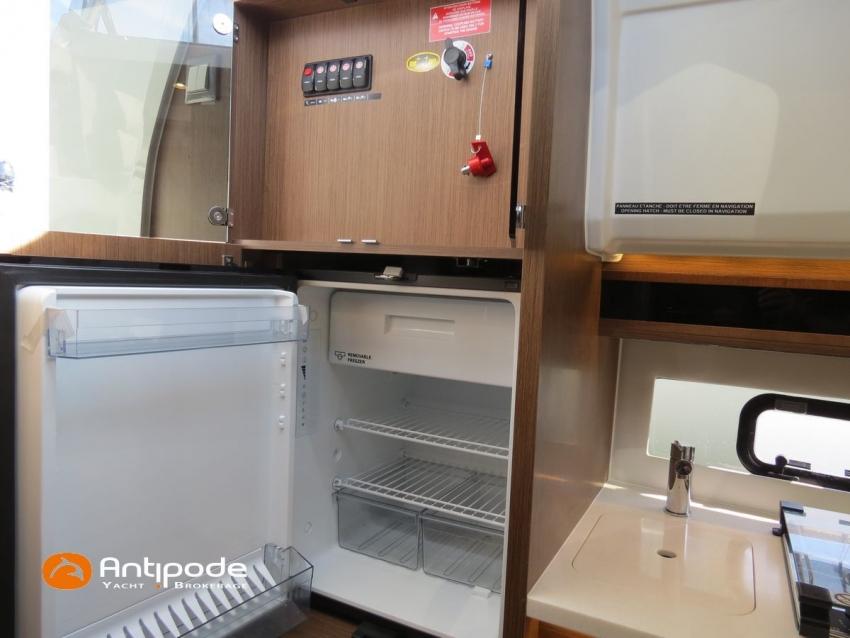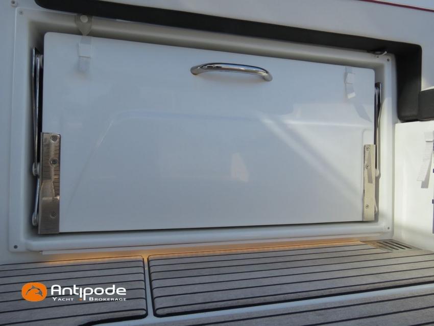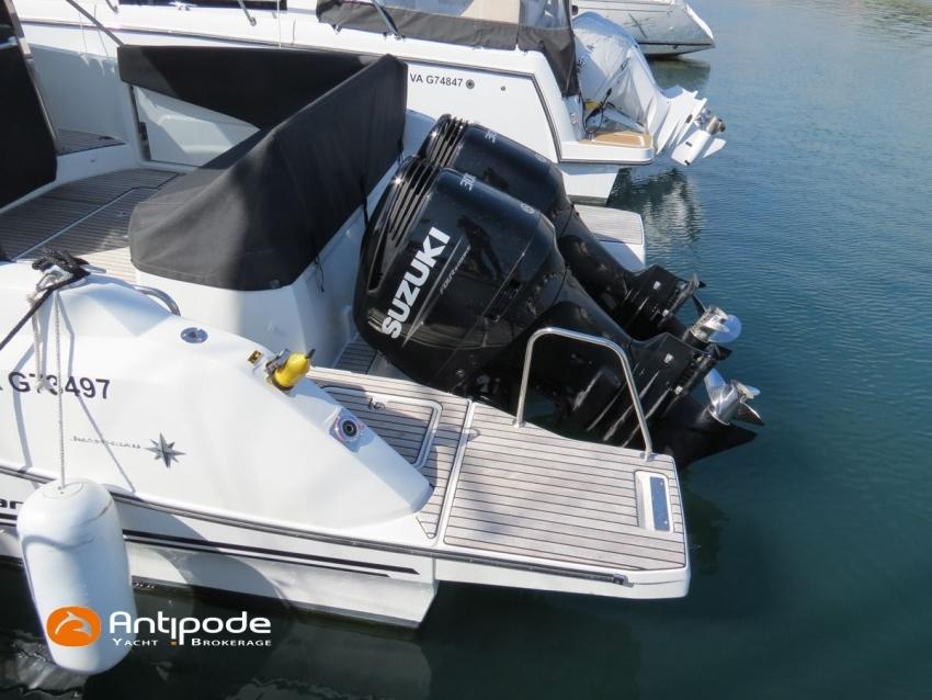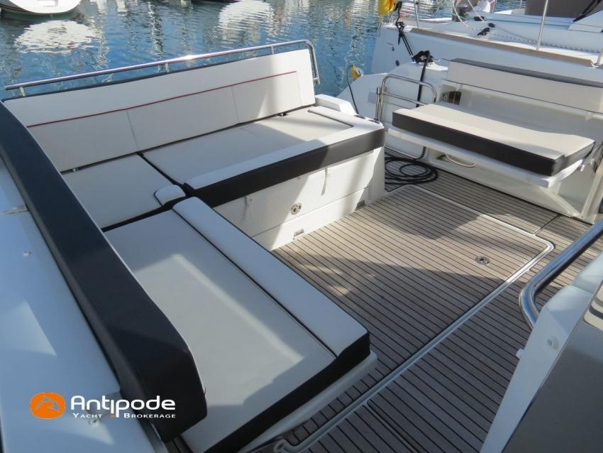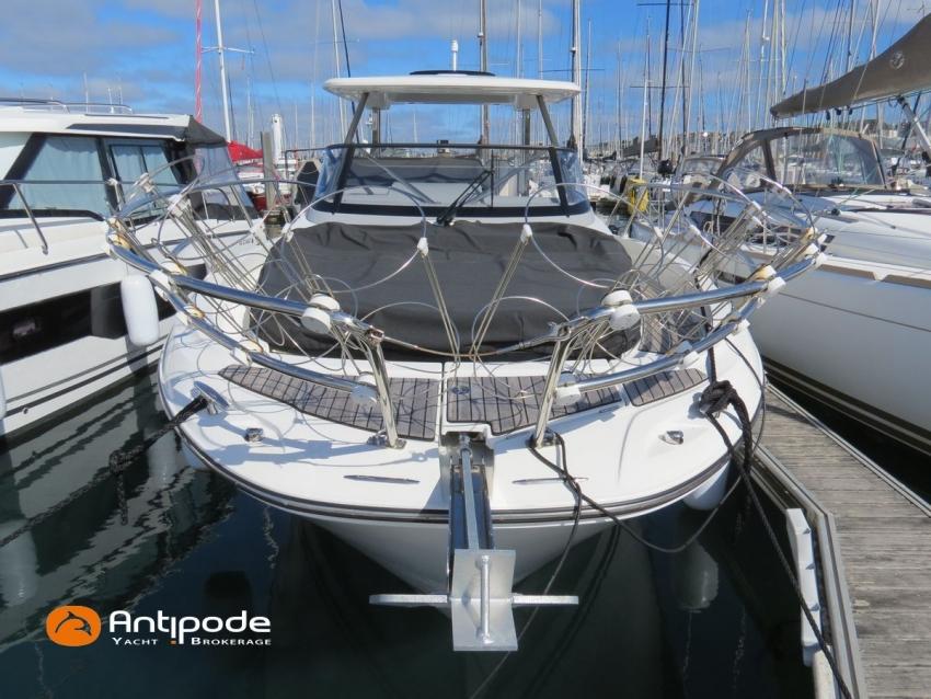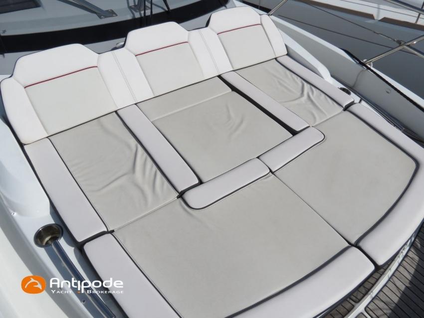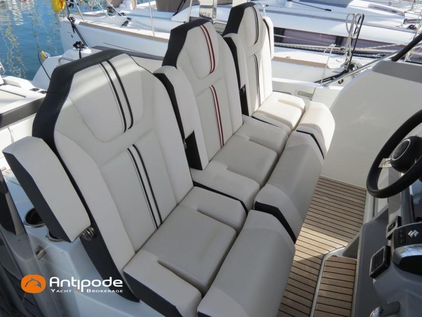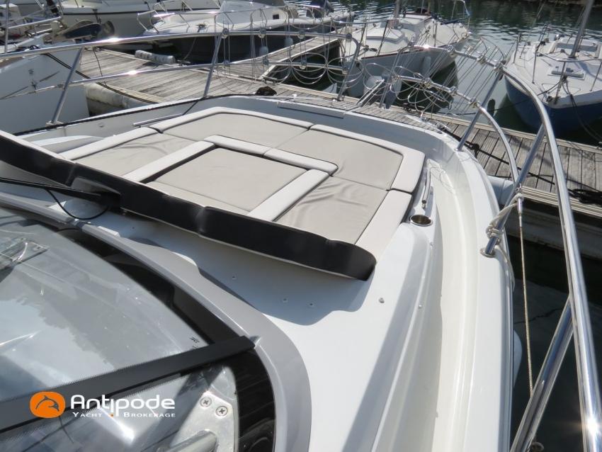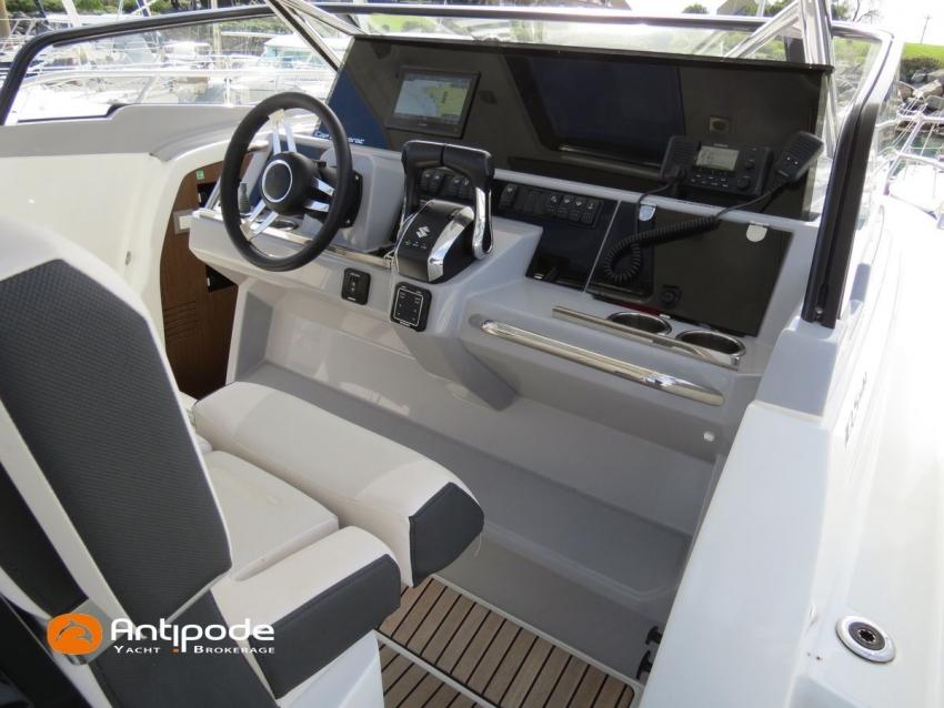 CAP CAMARAT 10.5 WA, 2024, first hand, SUZUKI DF300 AP (x2), 2x300 hp (89 hrs), Bow thruster, Version S2, door fo aft cabin, Premiere Silvertex Ice layout, PVC Marine Pure White saloon upholstery, Saloon table convertible in double bed, Mosquito screens for opening windows and hatches, Port removable seat in cockpit, Teak slatted cockpit floor, Teak bathing platforms, Cockpit T-Top, Cockpit cushions + covers, Sun bathing deck mastresses + cover, Wheel station electric windlass remote control, Side platform, Ski mast, Cockpit kitchen cover, Pupiter wheel station cover, Zipwake automatic trim tabs, GPS and chartplotter (wheel station) - Garmin GPS Map 923xsv, Electronic navigation charts, DSC VHF - Garmin VHF 100, Fridge unit 12 V (front opening door) - 80 L, 2 nd fridge unit 12 V in cockpit - 49 L, Water heater 220 V , 2 burners cooker, 1 burner cooker in cockpit, Sink / hot & cold water in cockpit, Micro wave owen, 220 V shore power + battery charger, Interior 12 & 220 sockets, Holding tank (80 liters), Electric toilets, Hot and cold cockpit shower, Leds navigation lights, Leds interior & exterior lights, Anchor + chain, Fenders and warps, Located Brittany. For more information or to make an appointment for a visit, contact : Jean-Baptiste Lemaire +33 6 10 25 00 03 - jb@antipode-yachts.com