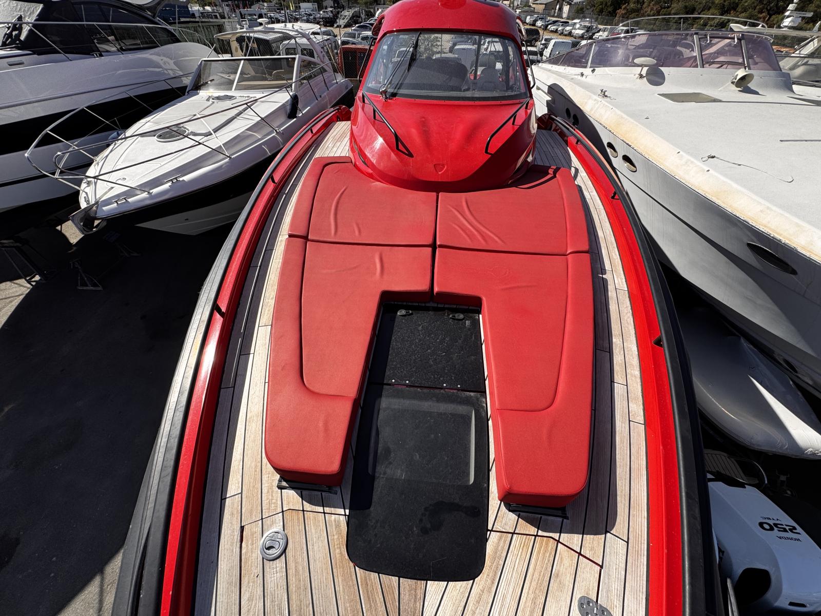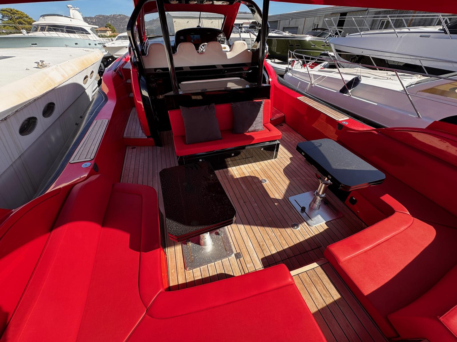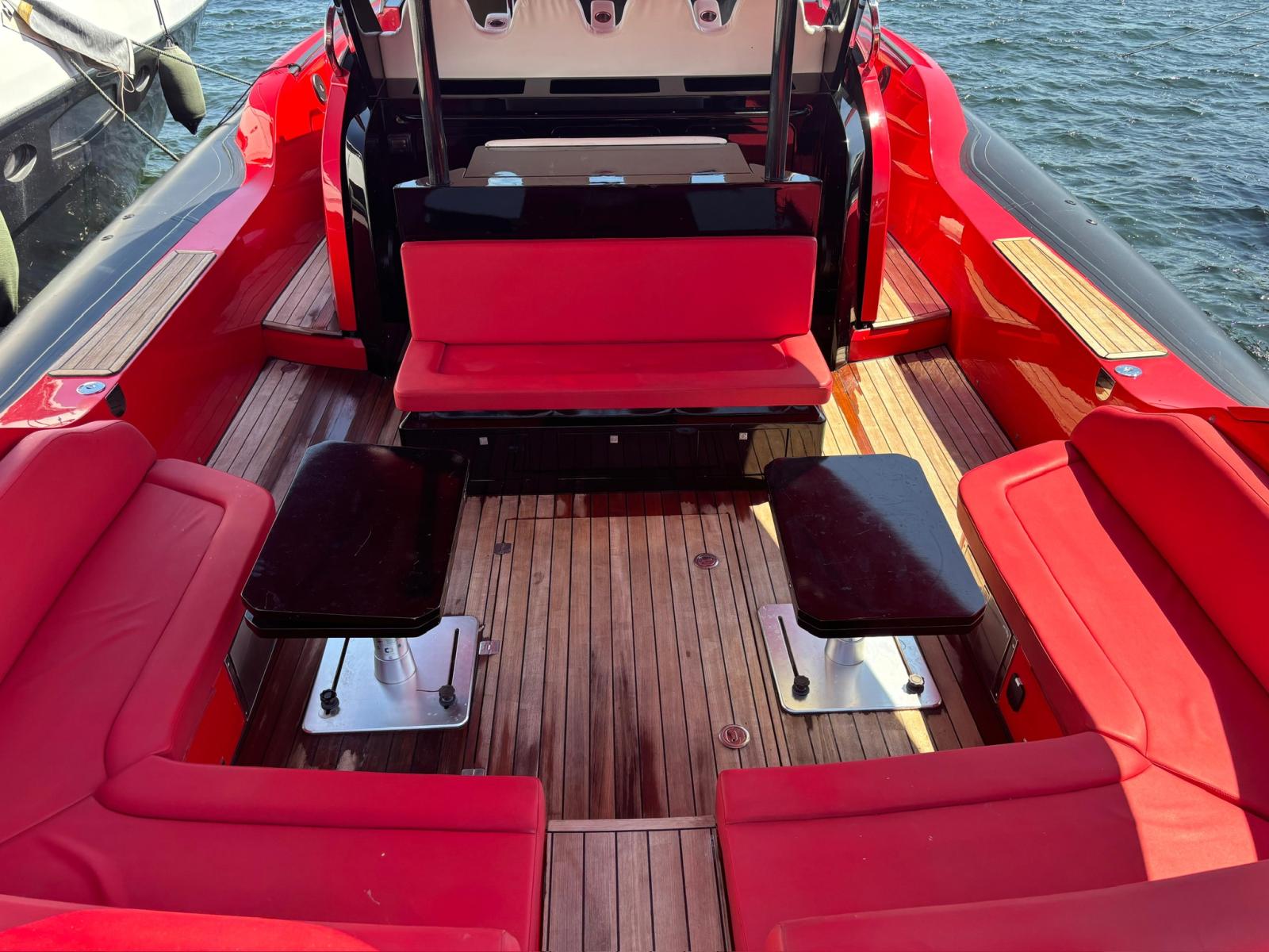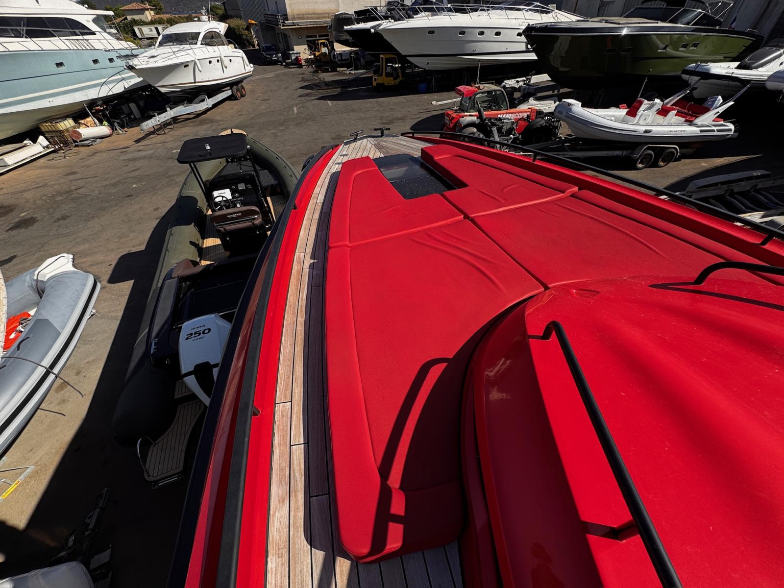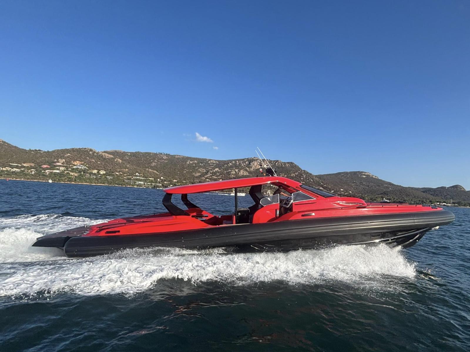 SACS STRIDER 19 from 2015, a RIB distinguished by its powerful blend of performance, comfort, and reliability. Thanks to its twin 1150 hp Caterpillar engines paired with perfectly serviced Arneson transmissions, it offers powerful acceleration and a remarkable top speed. The new bow thruster, new propellers, redone upholstery, and completely refurbished engine room electrical system are testament to rigorous technical maintenance. It also features generous sunbathing areas, a fitted cockpit, two cabins, and a bathroom. Its Raymarine electronics are complete.