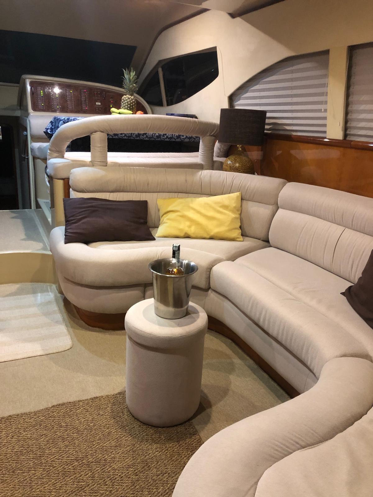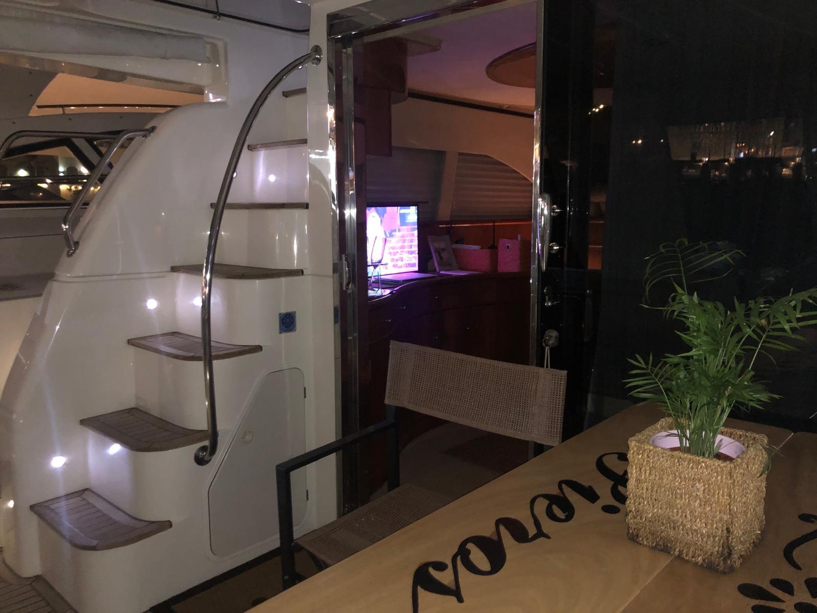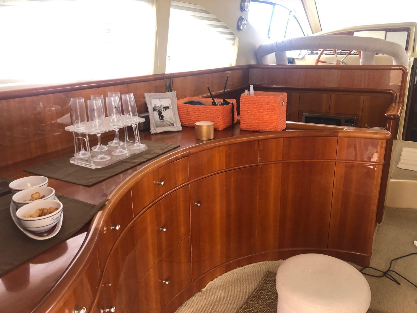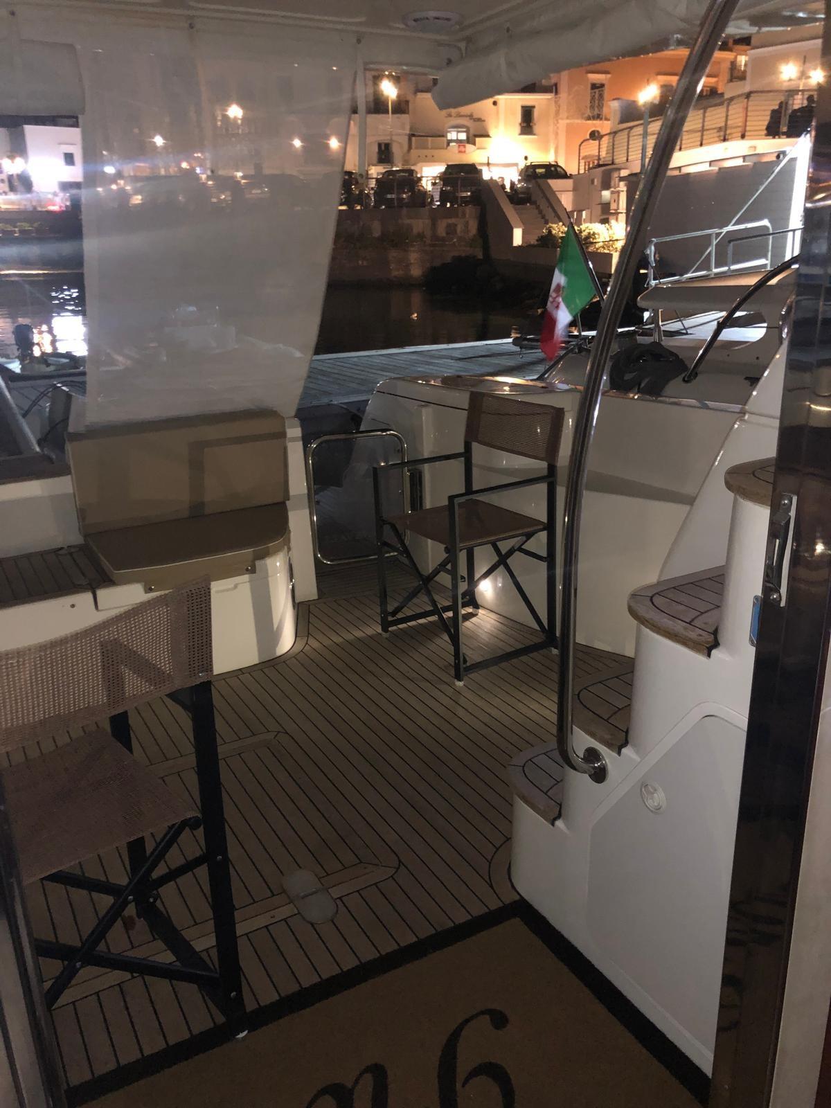 Engine Alarm, Bilge Alarm, Water pressure pump, Deck Shower, Directional Spotlight, Hydraulic Flaps, Fire Extinguishing System, Flaps Indicators, Courtesy Lights, Underwater lights, Gangway (Idraulica), Platform, Automatic Bilge Pump, Teak Cockpit, Shorepower connector, Water harbor connector system, Voltage Rectifier, Electronic instrumentation repeater, Rollbar, Electric Windlass, swimming ladder, Saddles for tender, Waste Water Purifier System, Living Room Foldable Table, Horn, Stern Winches.