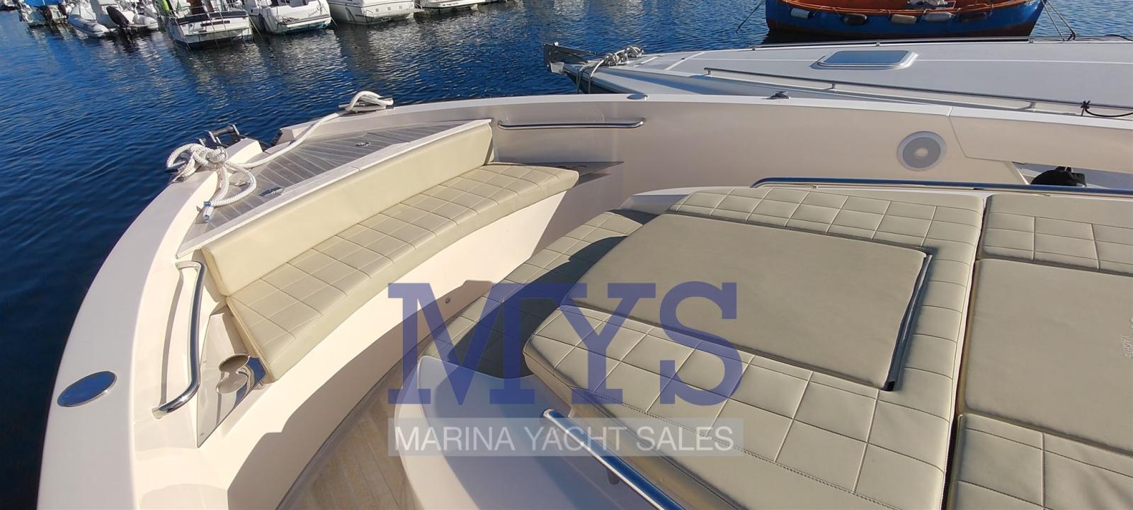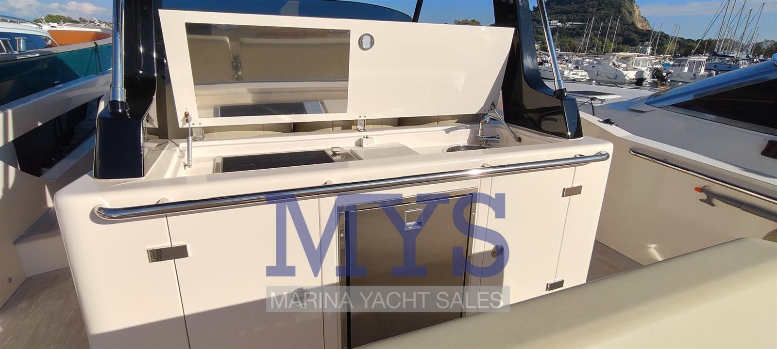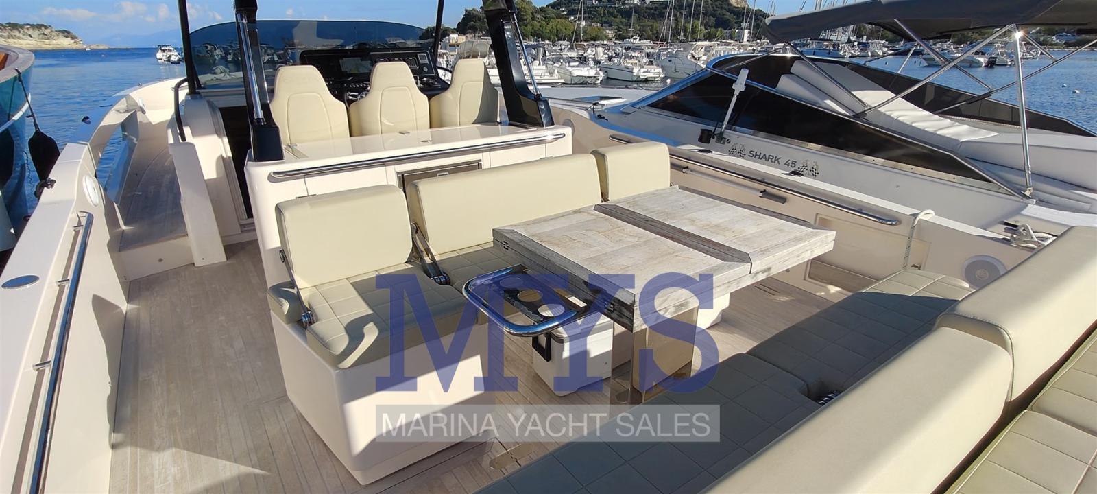 Engine Alarm, Bilge Alarm, Alternator, Water pressure pump, Auto-Trim, Shore power cable, Deck Shower, Hydraulic Flaps, Fire Extinguishing System, Flaps Indicators, Washbasin in the cockpit, Courtesy Lights, Fenders, Automatic Bilge Pump, Manual Bilge Pump, Entry door, Teak Cockpit, Shorepower connector, Electric Windlass, swimming ladder, cockpit table, Horn, T-Top.