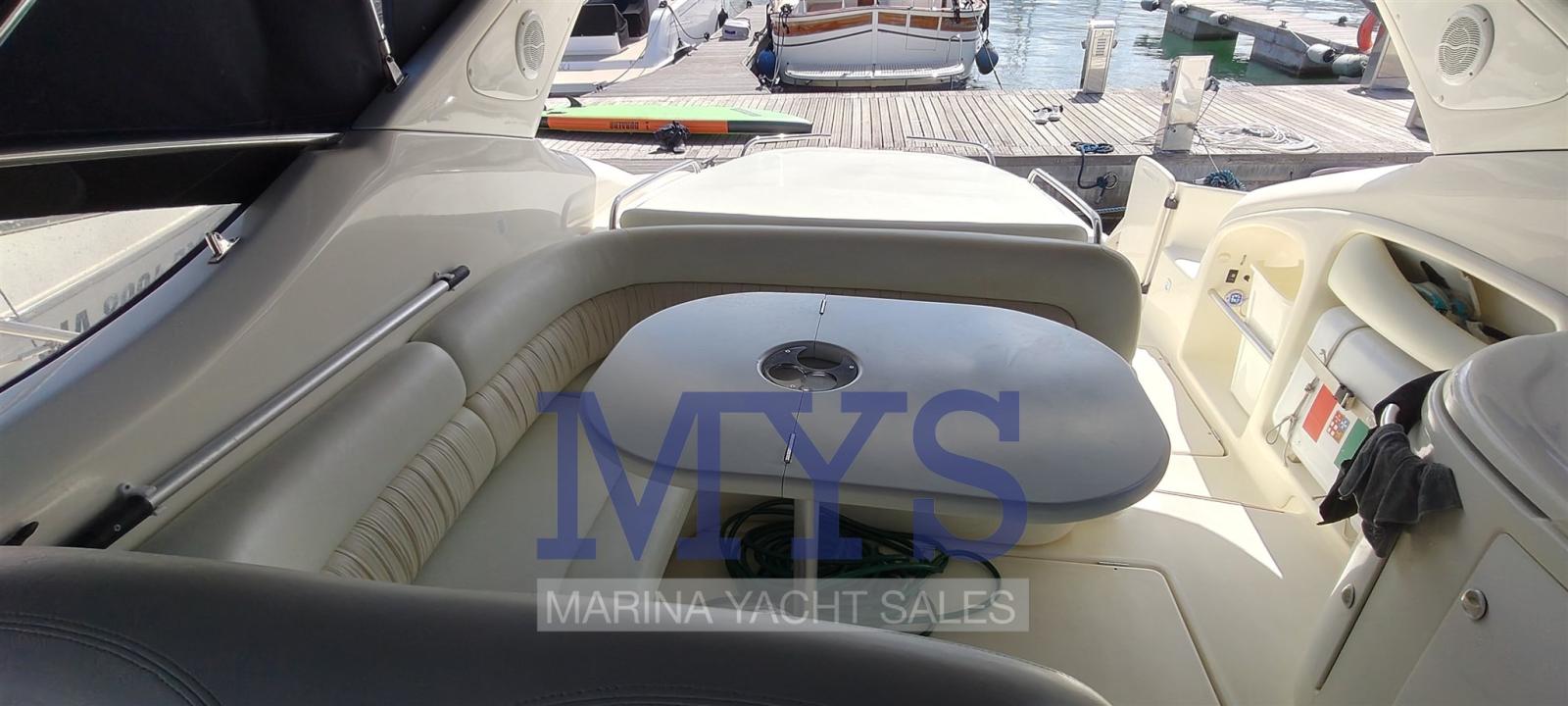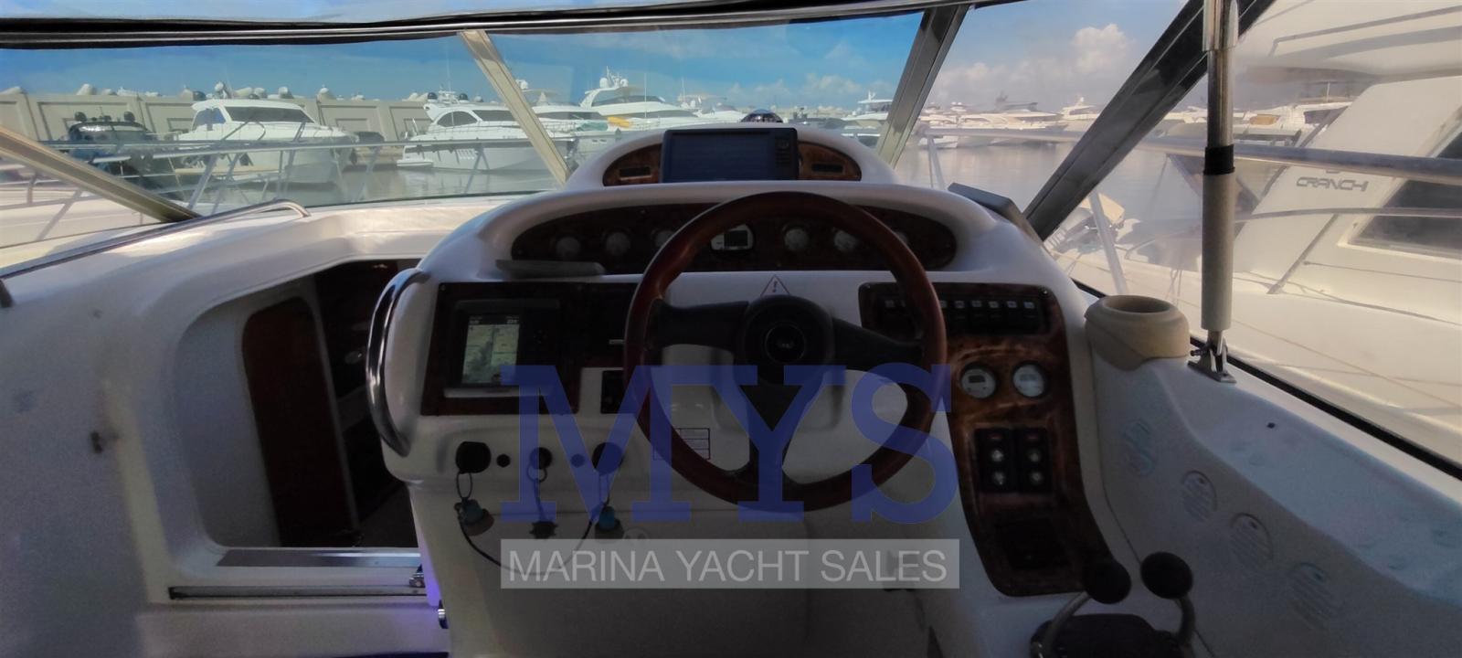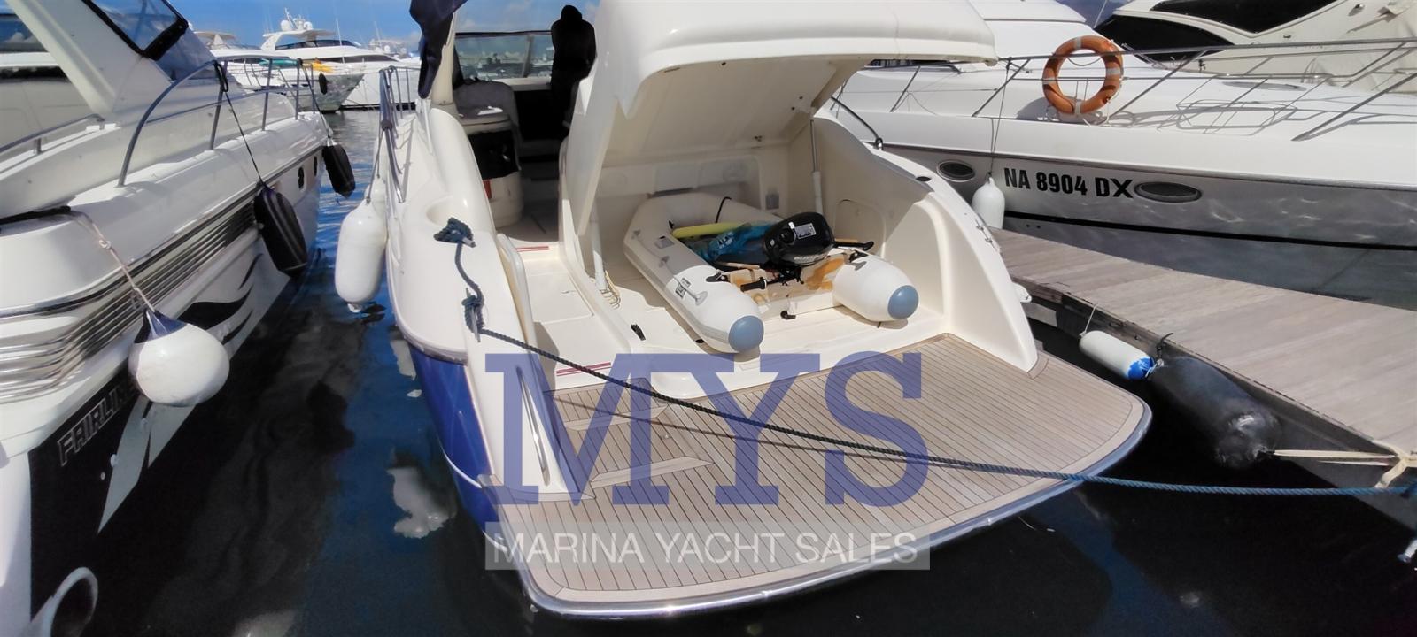 Engine Alarm, Bilge Alarm, Alternator, Water pressure pump, Shore power cable, Guard rail, Deck Shower, Hydraulic Flaps, Tender Garage, Flaps Indicators, Washbasin in the cockpit, Courtesy Lights, Platform, Automatic Bilge Pump, Teak deck, Entry door, Shorepower connector, Rollbar, Electric Windlass, swimming ladder, cockpit table, Tender, Horn, T-Top.