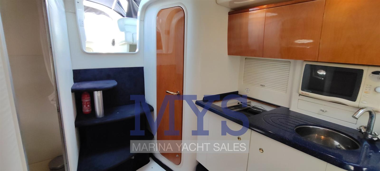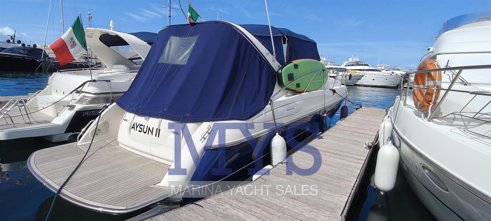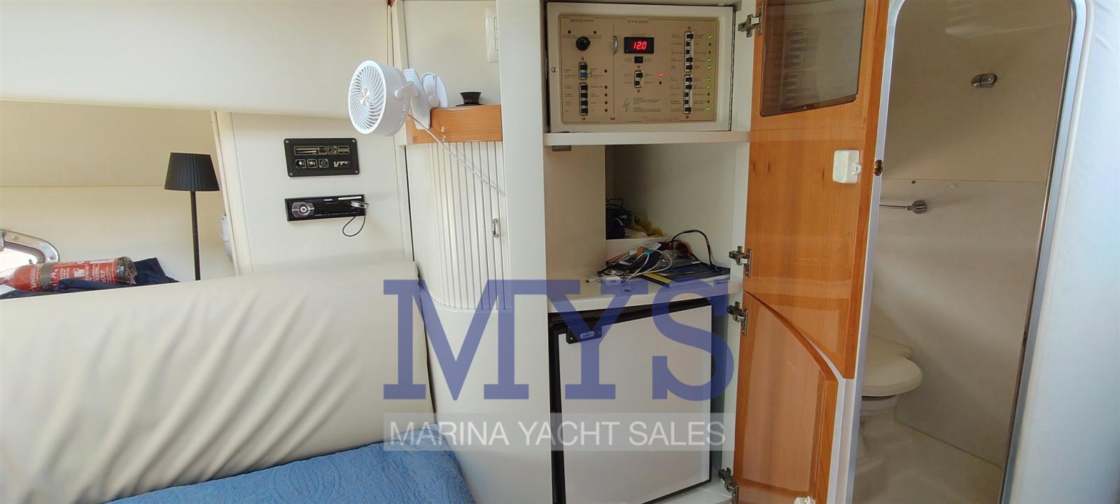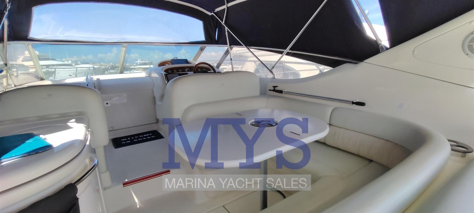 Engine Alarm, Bilge Alarm, Alternator, Water pressure pump, Shore power cable, Guard rail, Deck Shower, Hydraulic Flaps, Tender Garage, Flaps Indicators, Washbasin in the cockpit, Courtesy Lights, Platform, Automatic Bilge Pump, Teak deck, Entry door, Shorepower connector, Rollbar, Electric Windlass, swimming ladder, cockpit table, Tender, Horn, T-Top.
