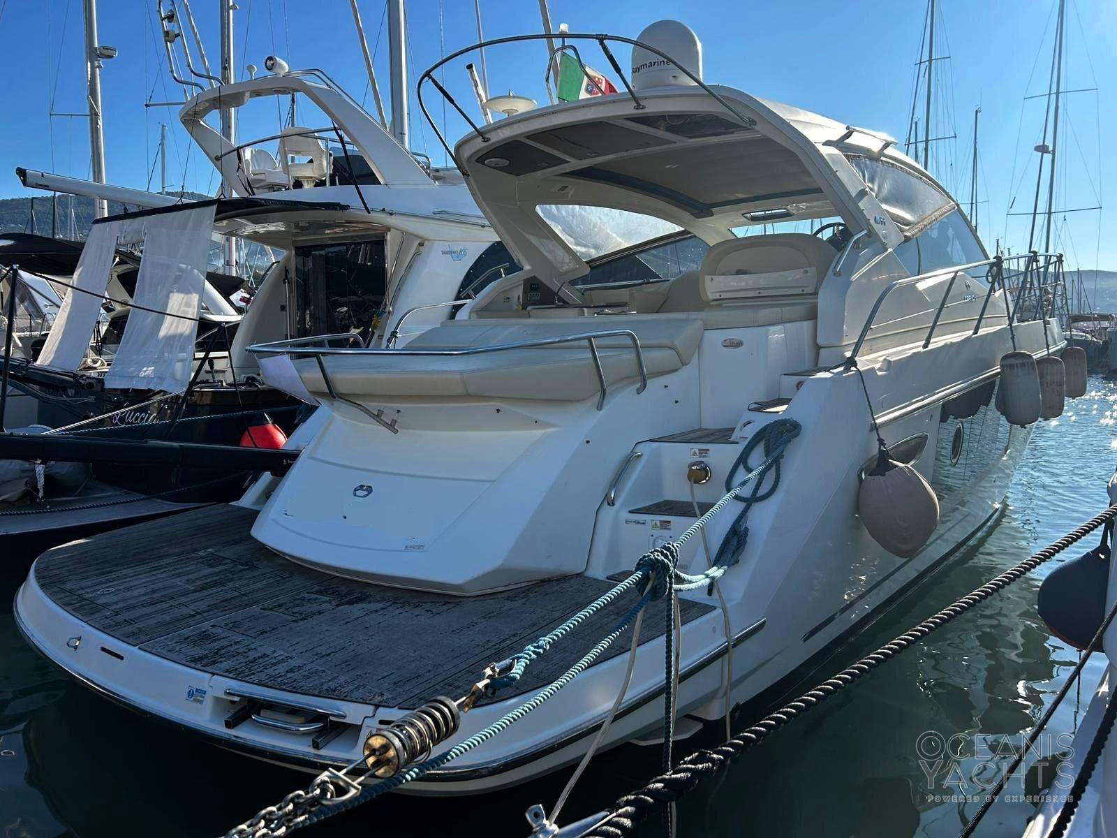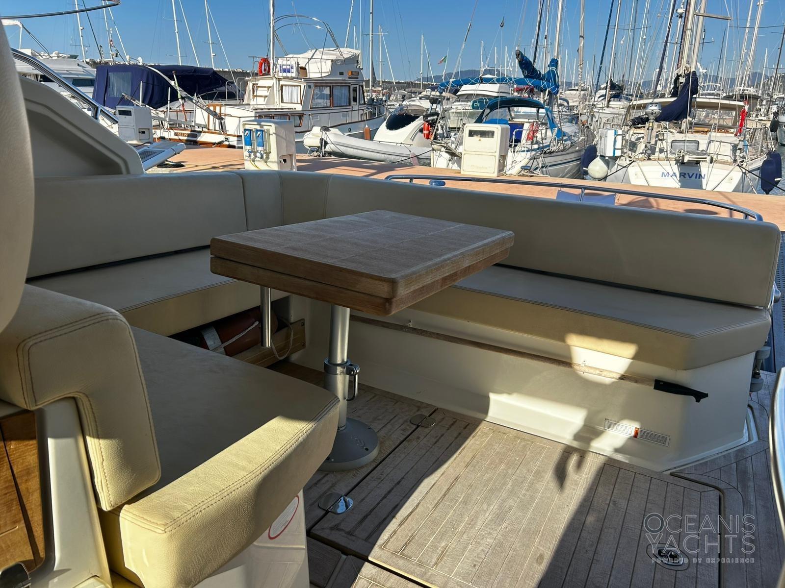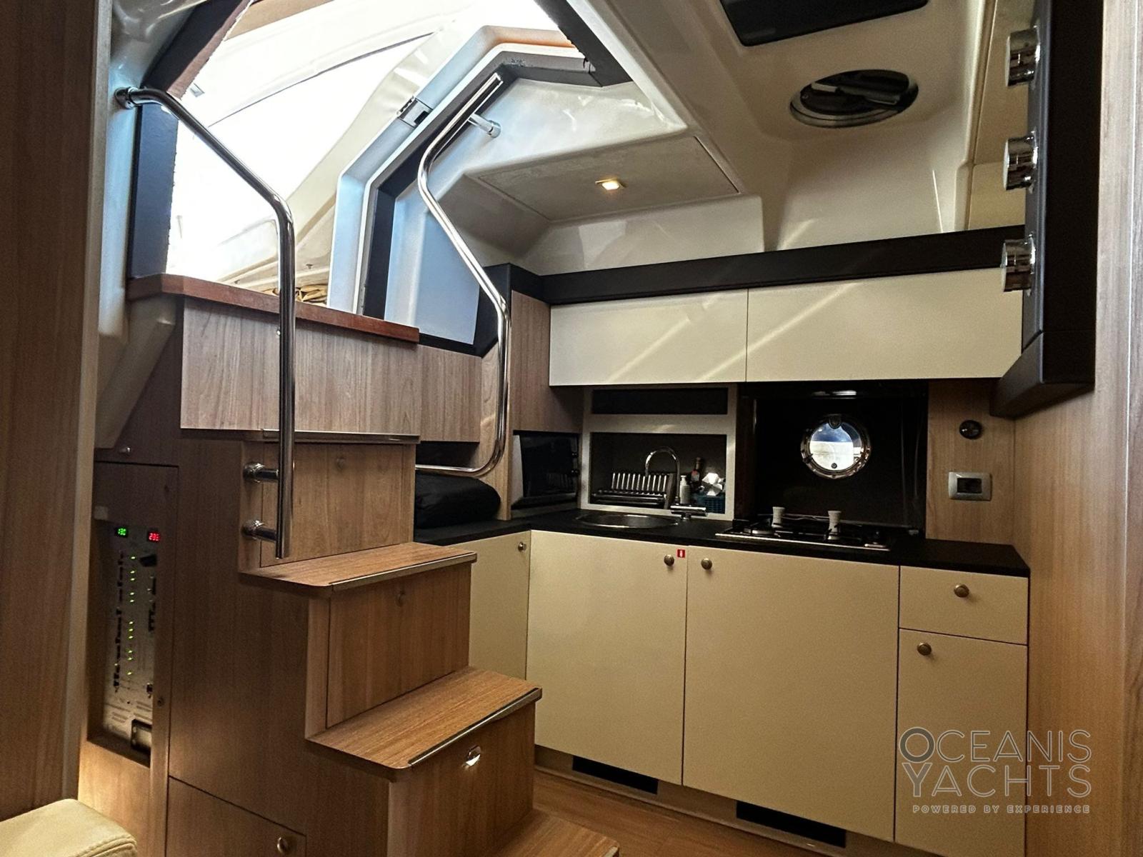 Fume/Gas Detector, Engine Alarm, Bilge Alarm, Alternator, Water pressure pump, Deck Shower, Electric Flaps, Hard top, Courtesy Lights, Underwater lights, Fenders, Gangway (a scomparsa), Platform (idraulica affondabile), Automatic Bilge Pump, Manual Bilge Pump, Teak deck, Entry door, Teak Cockpit, Shorepower connector, Electric Windlass, swimming ladder, cockpit table, Living Room Foldable Table, Tender, Horn.