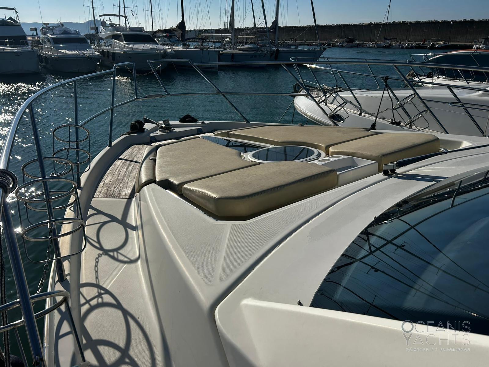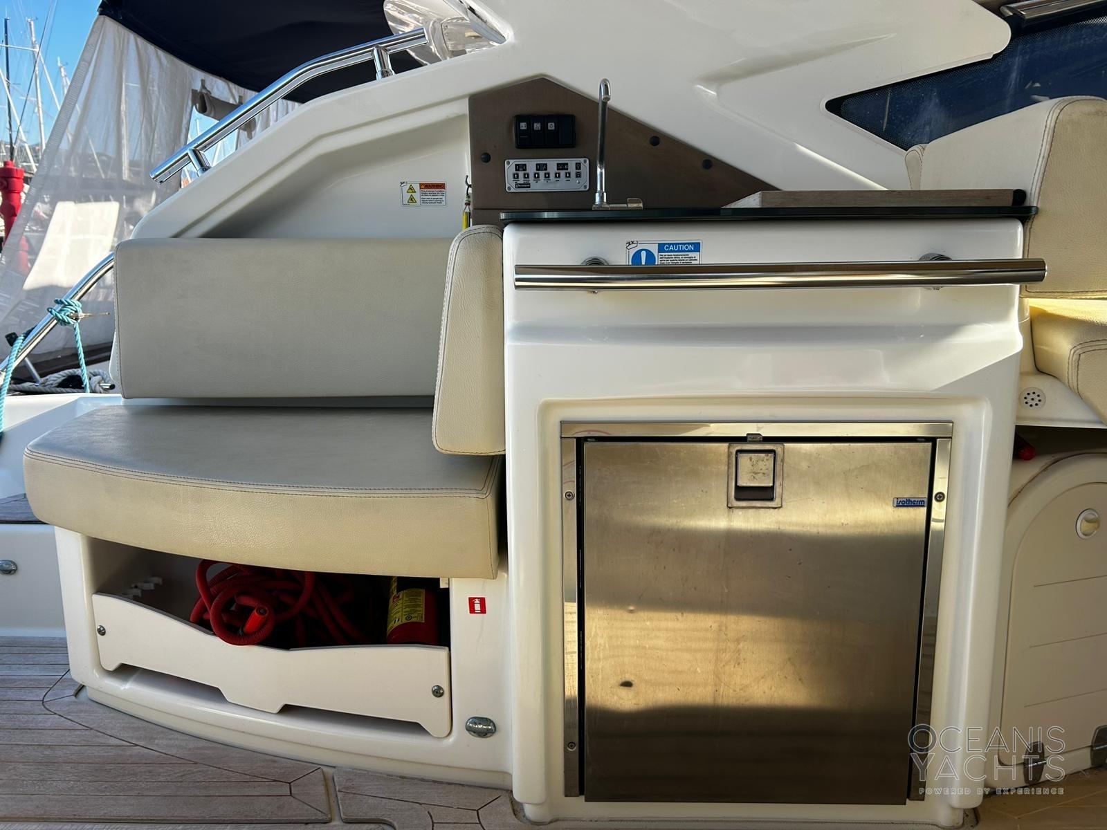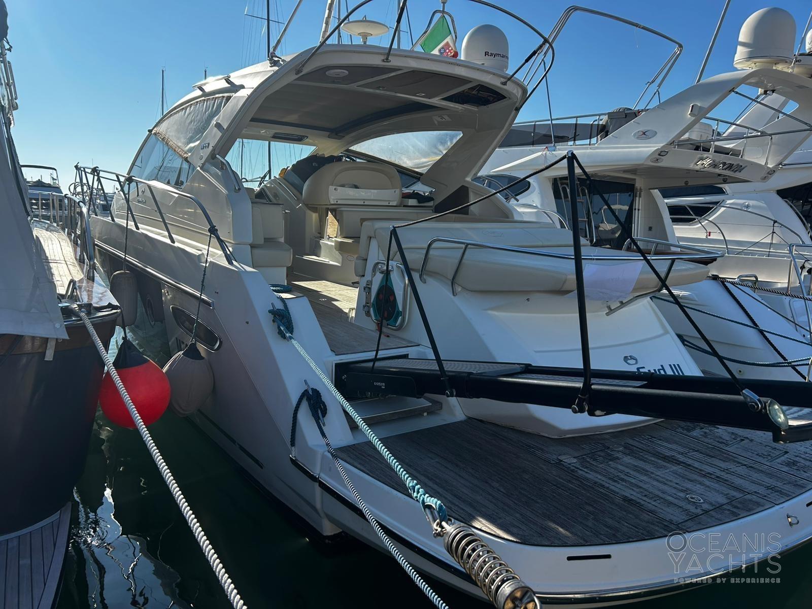 Fume/Gas Detector, Engine Alarm, Bilge Alarm, Alternator, Water pressure pump, Deck Shower, Electric Flaps, Hard top, Courtesy Lights, Underwater lights, Fenders, Gangway (a scomparsa), Platform (idraulica affondabile), Automatic Bilge Pump, Manual Bilge Pump, Teak deck, Entry door, Teak Cockpit, Shorepower connector, Electric Windlass, swimming ladder, cockpit table, Living Room Foldable Table, Tender, Horn.