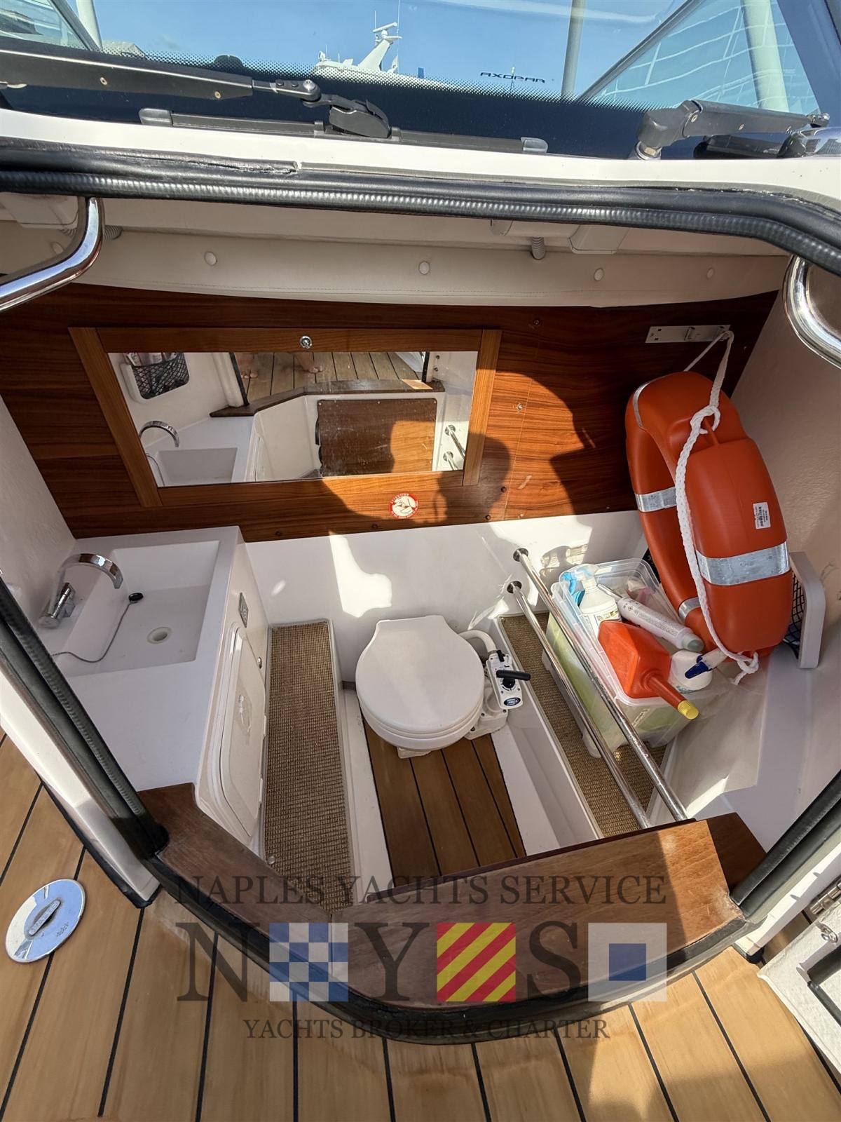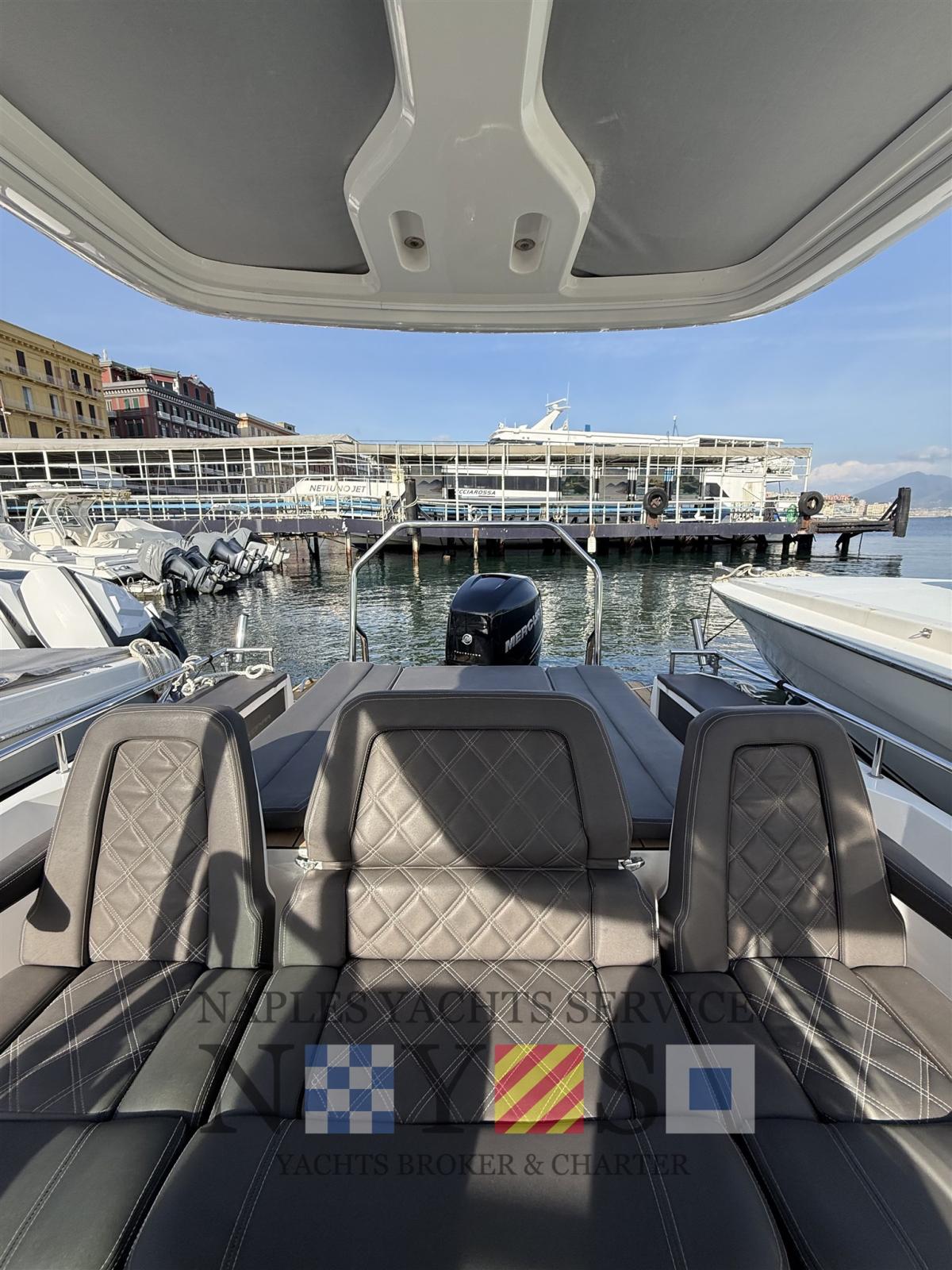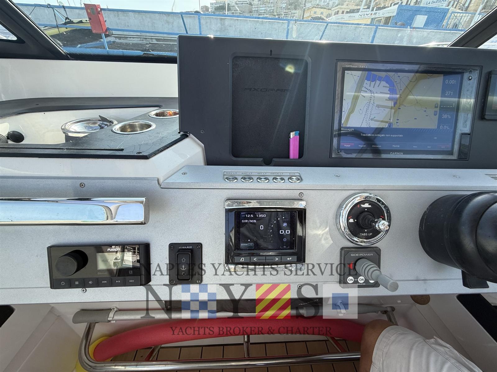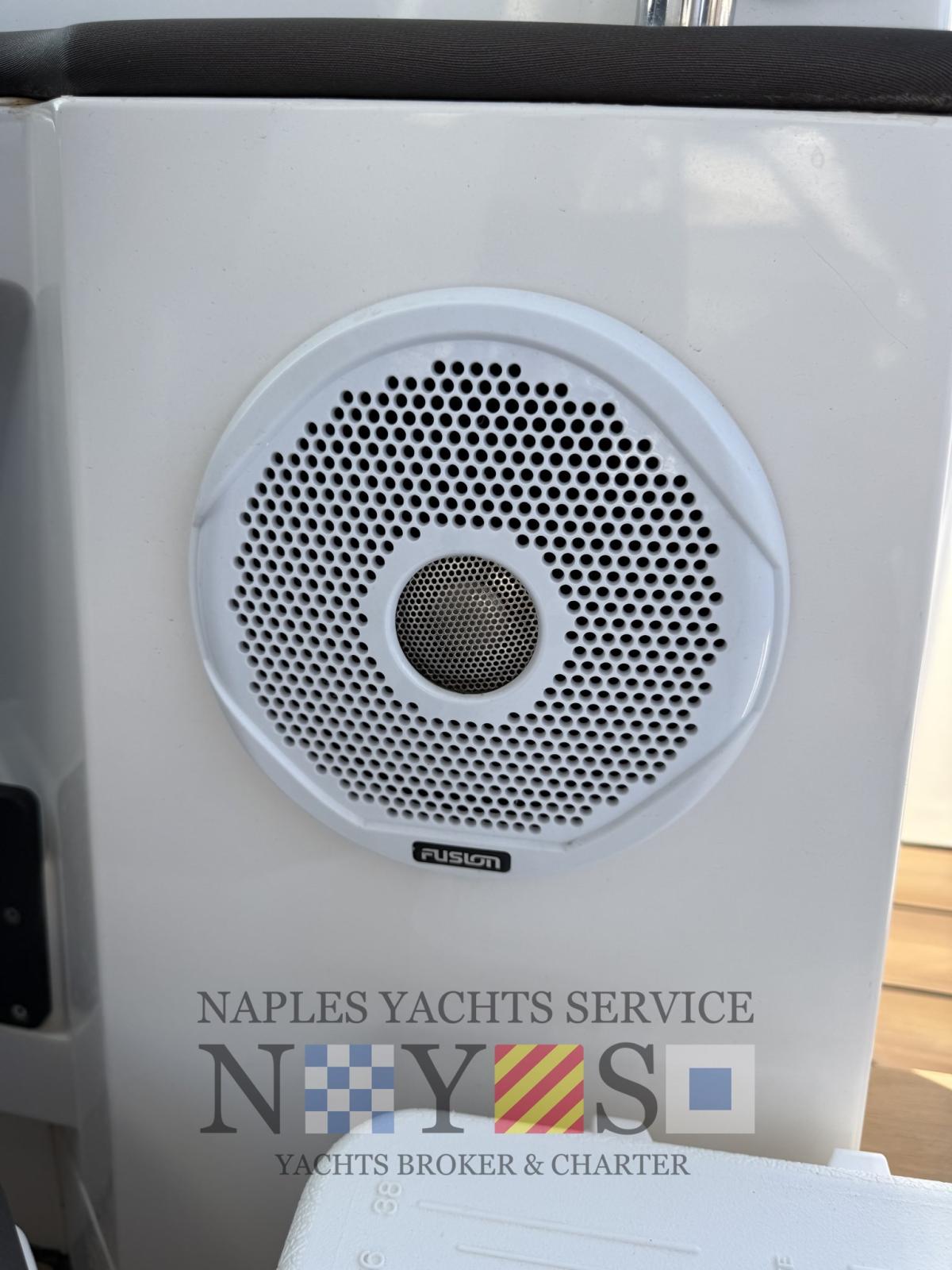Anchor (INOX 7,5kg), Water pressure pump (Marco UP3E (controllo elettronico)), Auto-Trim (Trim Tabs con Joystick), Batteries (1x100Ah + 2x850 Ah Optima starter), Deck Shower (Whale Twister a scomparsa), Bow Thruster (Side Power SE40/125S2), Electric Flaps (Trim Tabs con Joystick), Tow hook for water skiing (Roll-Bar in acciaio inox), Washbasin in the cockpit, Courtesy Lights, Platform (doppie spiaggette laterali con (1) scaletta bagno intgrata con maniglioni in acciaio inox), Electric Windlass (Quick 600W), swimming ladder (inox con maniglioni), cockpit table (pozzetto prua), 2 guard rails with gates (protezioni fisse inox per motori fuoribordo), T-Top.