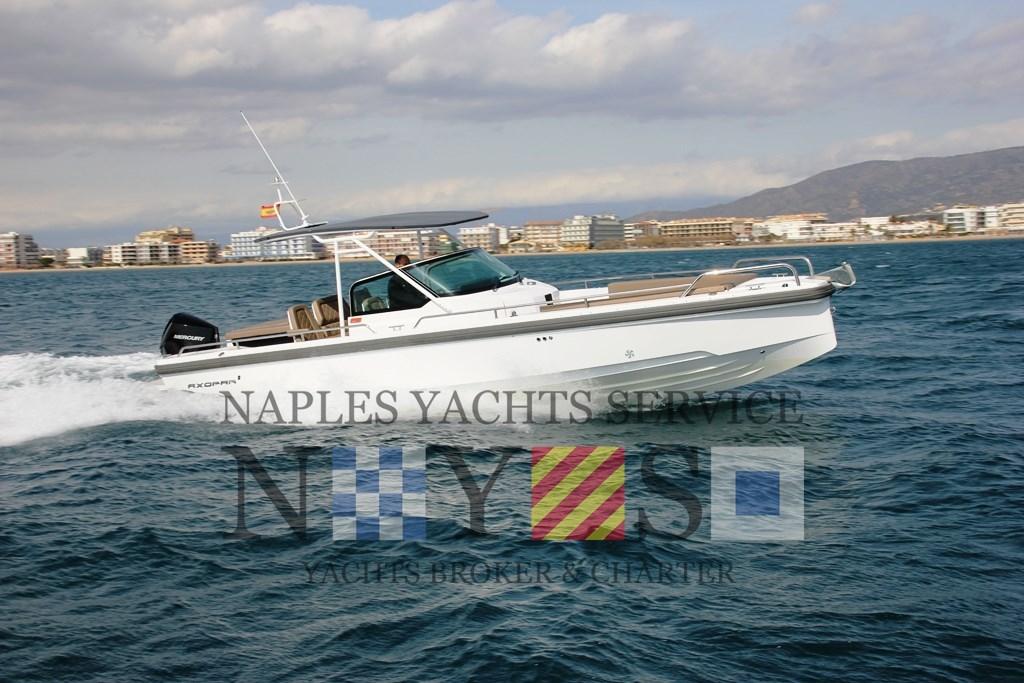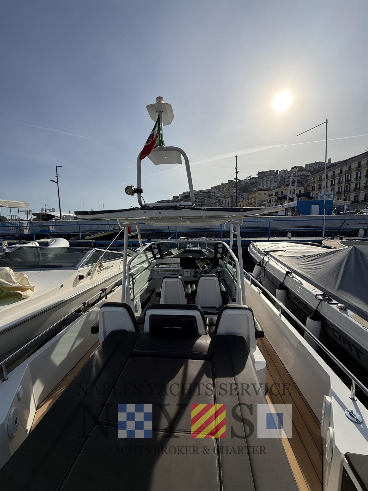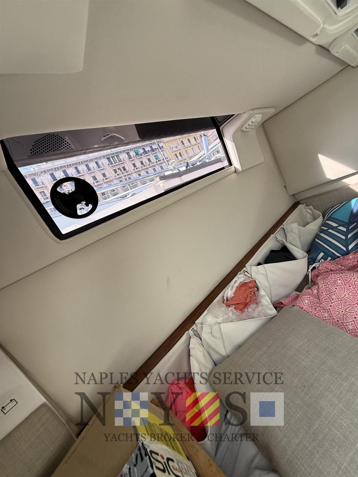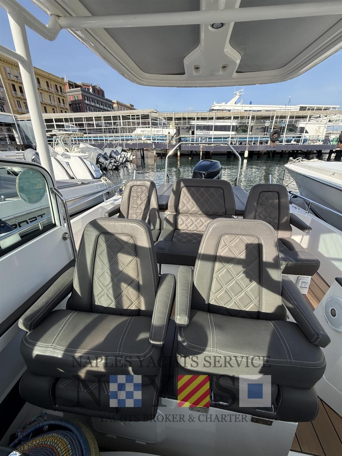 Anchor (INOX 7,5kg), Water pressure pump (Marco UP3E (controllo elettronico)), Auto-Trim (Trim Tabs con Joystick), Batteries (1x100Ah + 2x850 Ah Optima starter), Deck Shower (Whale Twister a scomparsa), Bow Thruster (Side Power SE40/125S2), Electric Flaps (Trim Tabs con Joystick), Tow hook for water skiing (Roll-Bar in acciaio inox), Washbasin in the cockpit, Courtesy Lights, Platform (doppie spiaggette laterali con (1) scaletta bagno intgrata con maniglioni in acciaio inox), Electric Windlass (Quick 600W), swimming ladder (inox con maniglioni), cockpit table (pozzetto prua), 2 guard rails with gates (protezioni fisse inox per motori fuoribordo), T-Top.