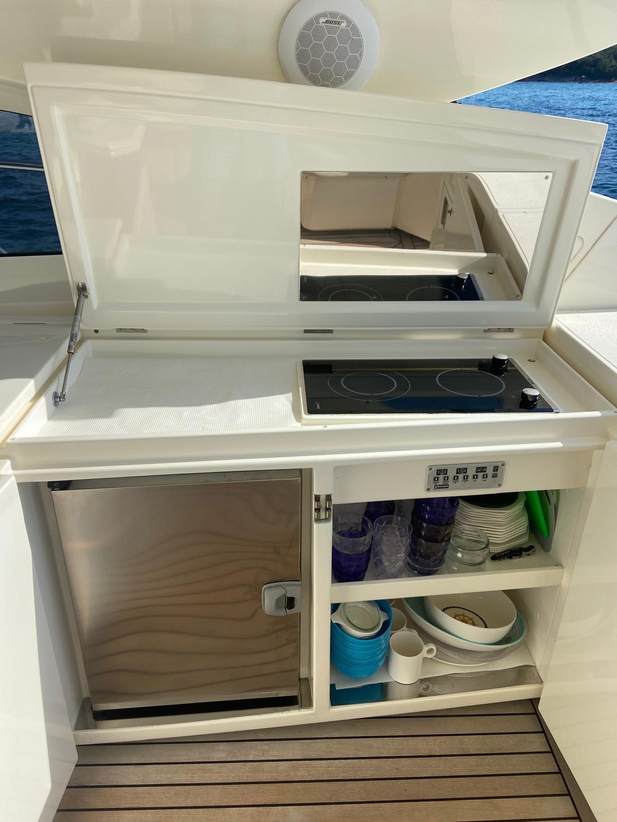 Electric bow thruster - rigid hard top with electric opening - air conditioning - Mase 12 kW generator - wet bar in cockpit with fridge and electric plate two burners - satellite TV antenna - LCD TV - combined microwave oven - electric 4-burner hob - fridge - freezer - retractable electro-hydraulic gangway.