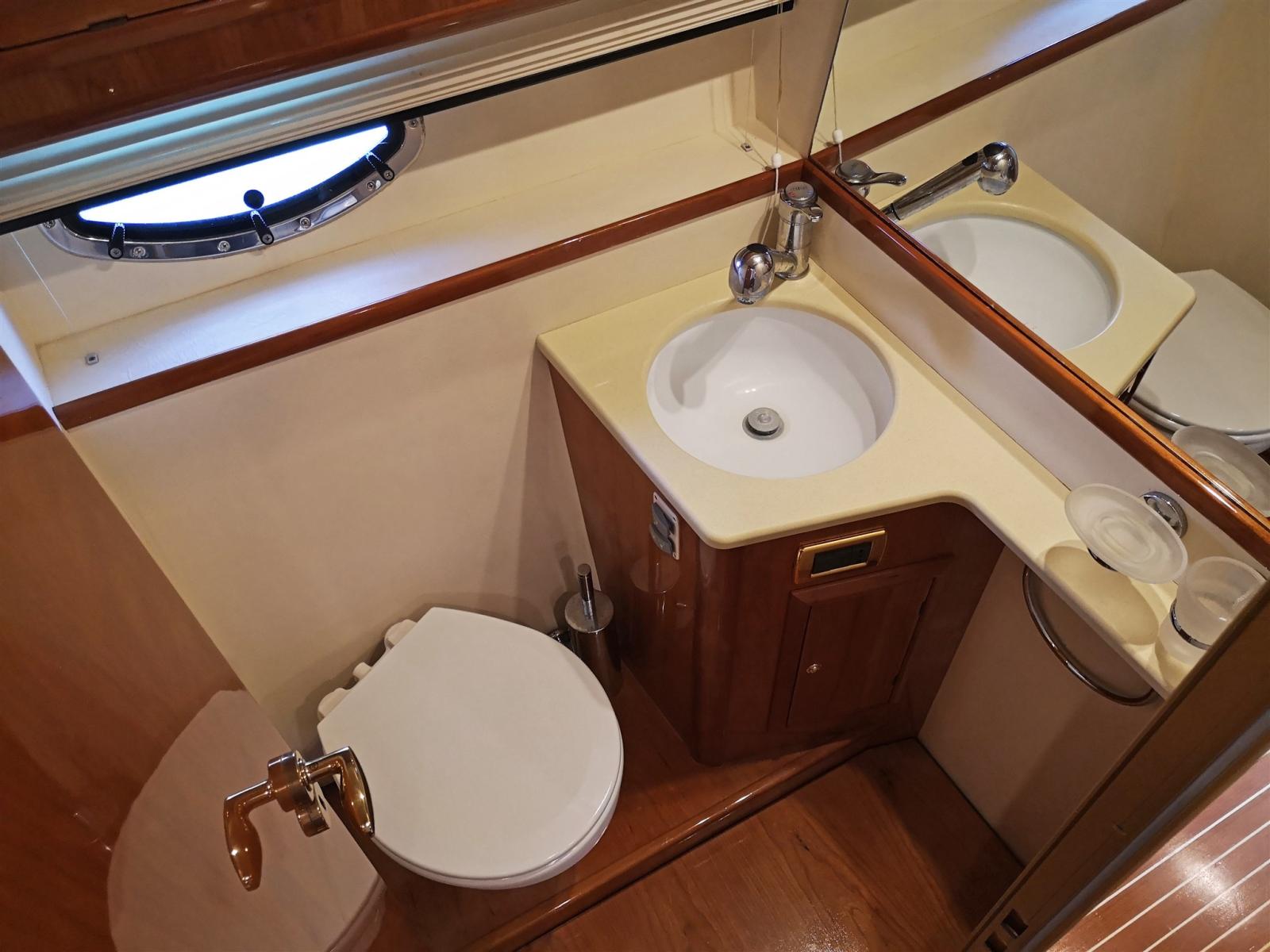 Owner's cabin in the bow with double bed and private bathroom complete with sink, electric toilet and separate shower cubicle
