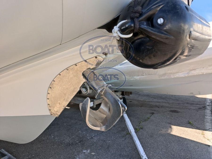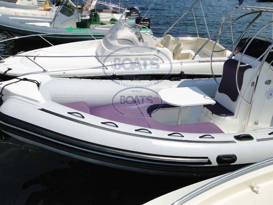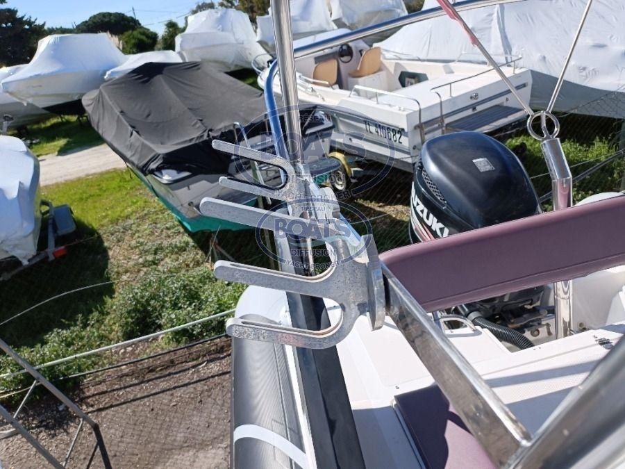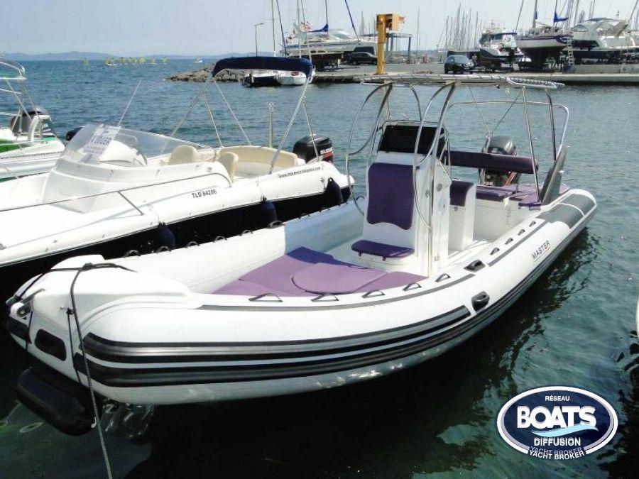 Magnificent semi-rigid MASTER 730 open from 2015. A boat recognized for its marine qualities, a comfortable cockpit with practical storage. Ideally powered by a 225 hp SUZUKI V6. (a speed of 45-47 knots). It benefits from generous equipment: Electric windlass, modular front sun lounger with its picnic table, rear bench seat convertible into a sun lounger, a fixed sun awning. Combined GPS VHF depth sounder. a Fusion Bluetooth radio, a ski mast with a wakeboard holder on the Ti-Top, a swimming ladder, a hand shower.