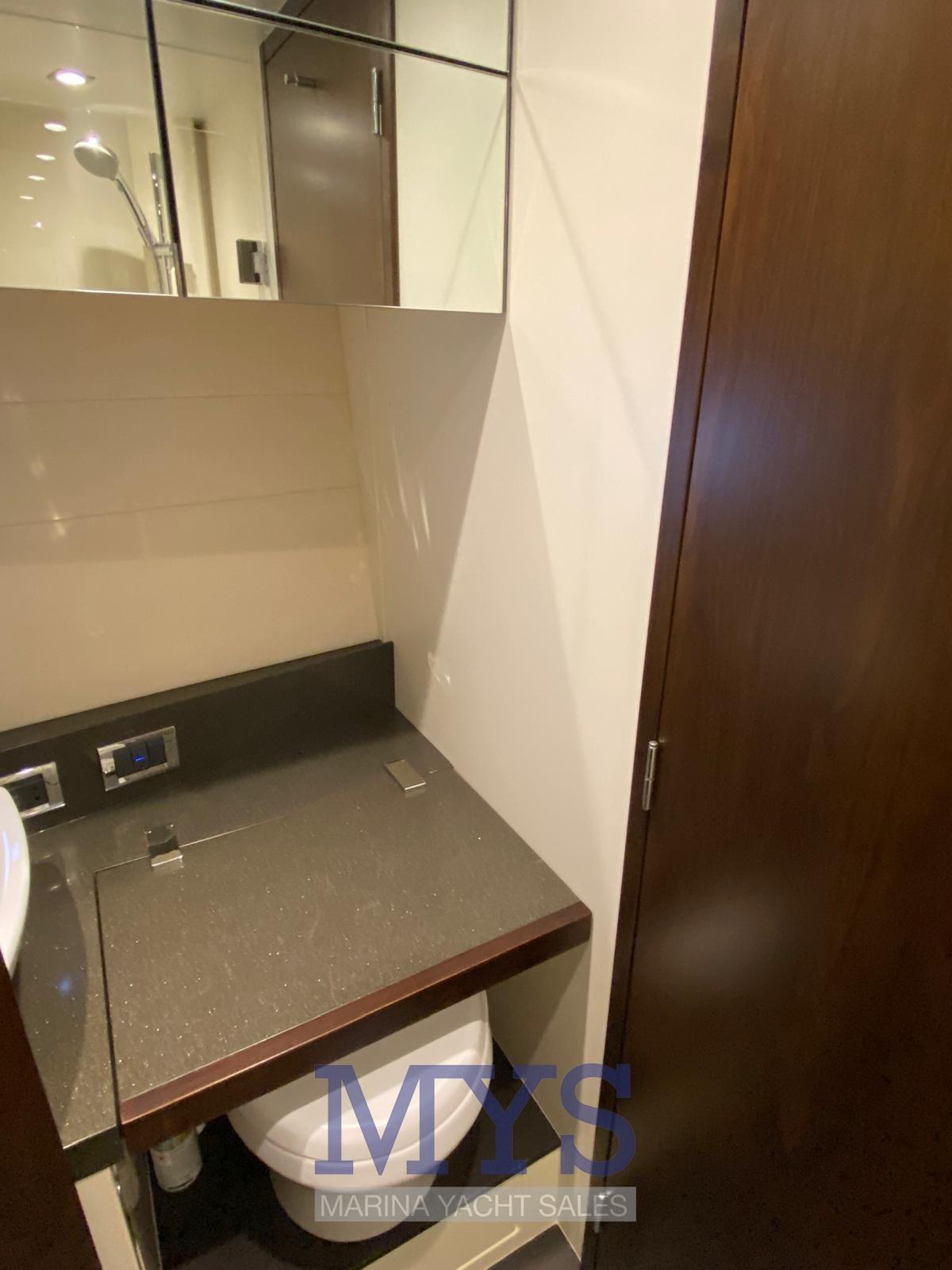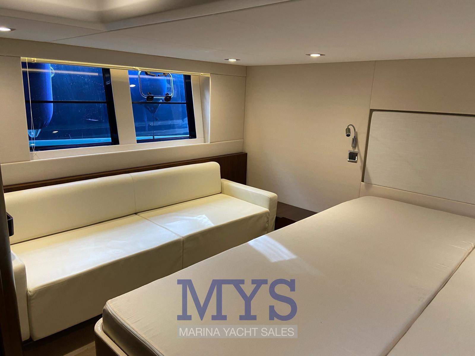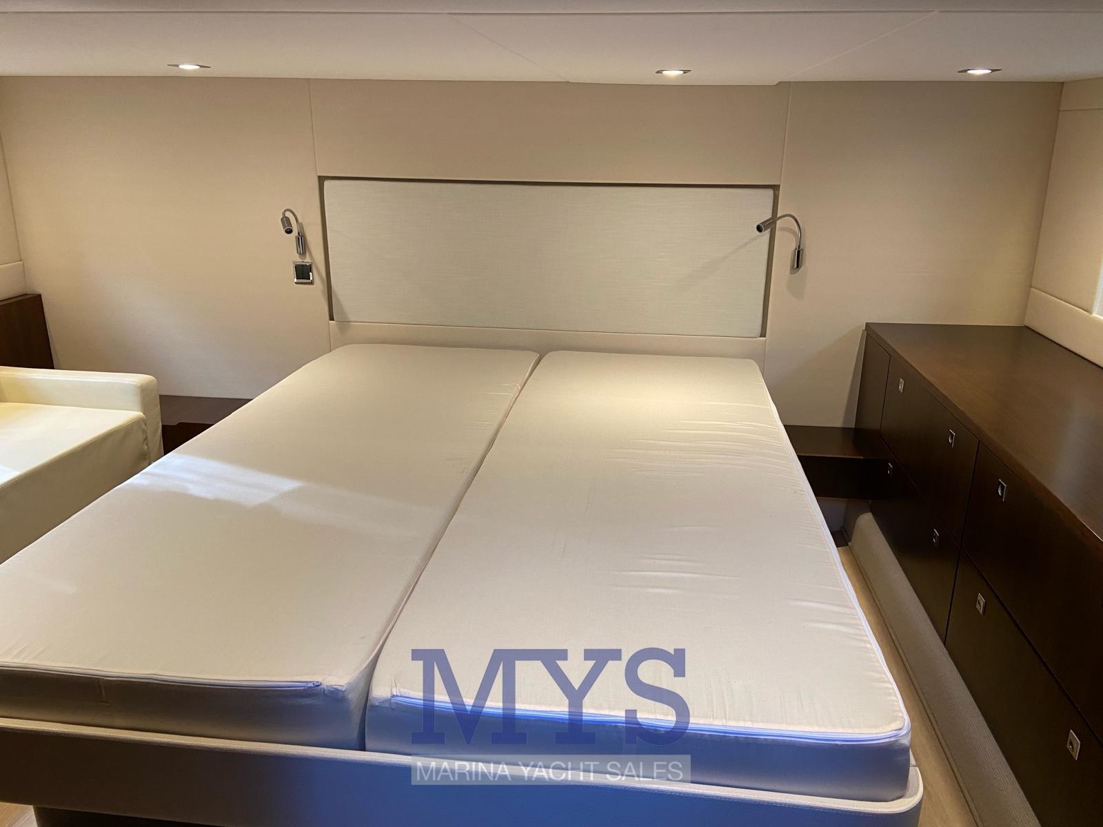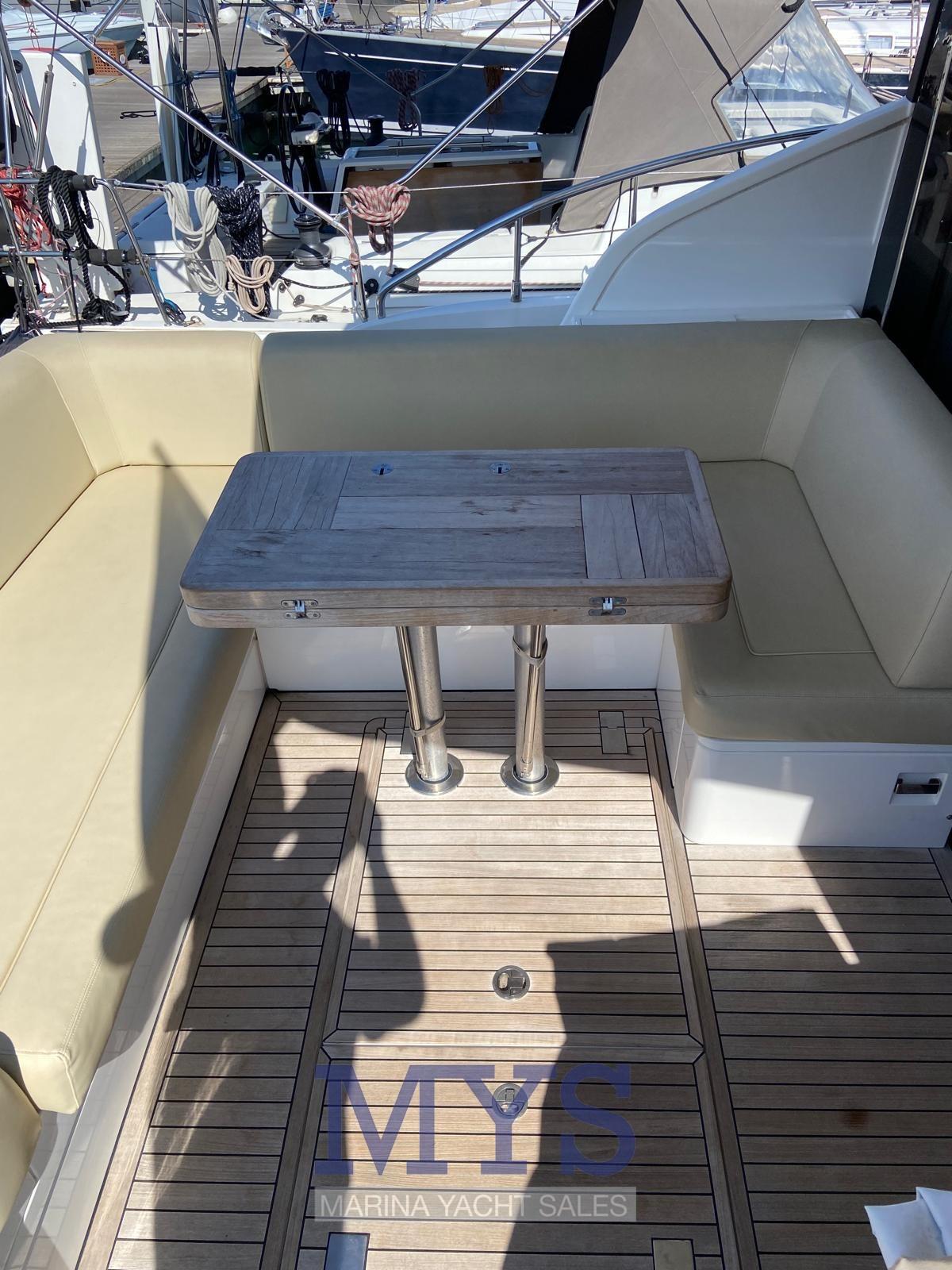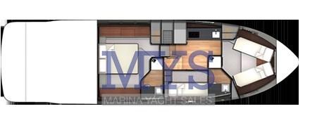 Engine Alarm, Bilge Alarm, Water pressure pump, Teak Side Decks, Special Colour, Deck Shower, Directional Spotlight, Hydraulic Flaps, Hard top, Flaps Indicators, Washbasin in the cockpit, Courtesy Lights, Underwater lights, Gangway, Platform, Automatic Bilge Pump, Manual Bilge Pump, Entry door, Teak Cockpit, Shorepower connector, Electric Windlass, swimming ladder, cockpit table, Horn.
