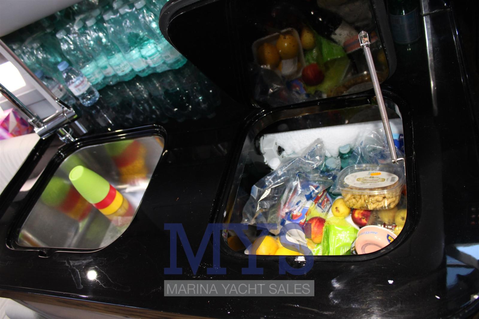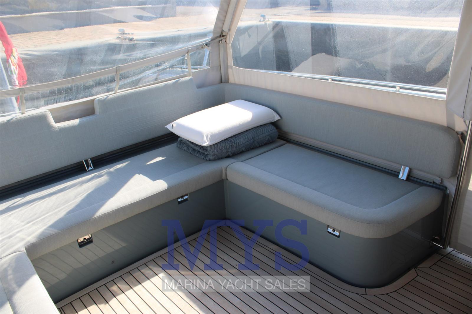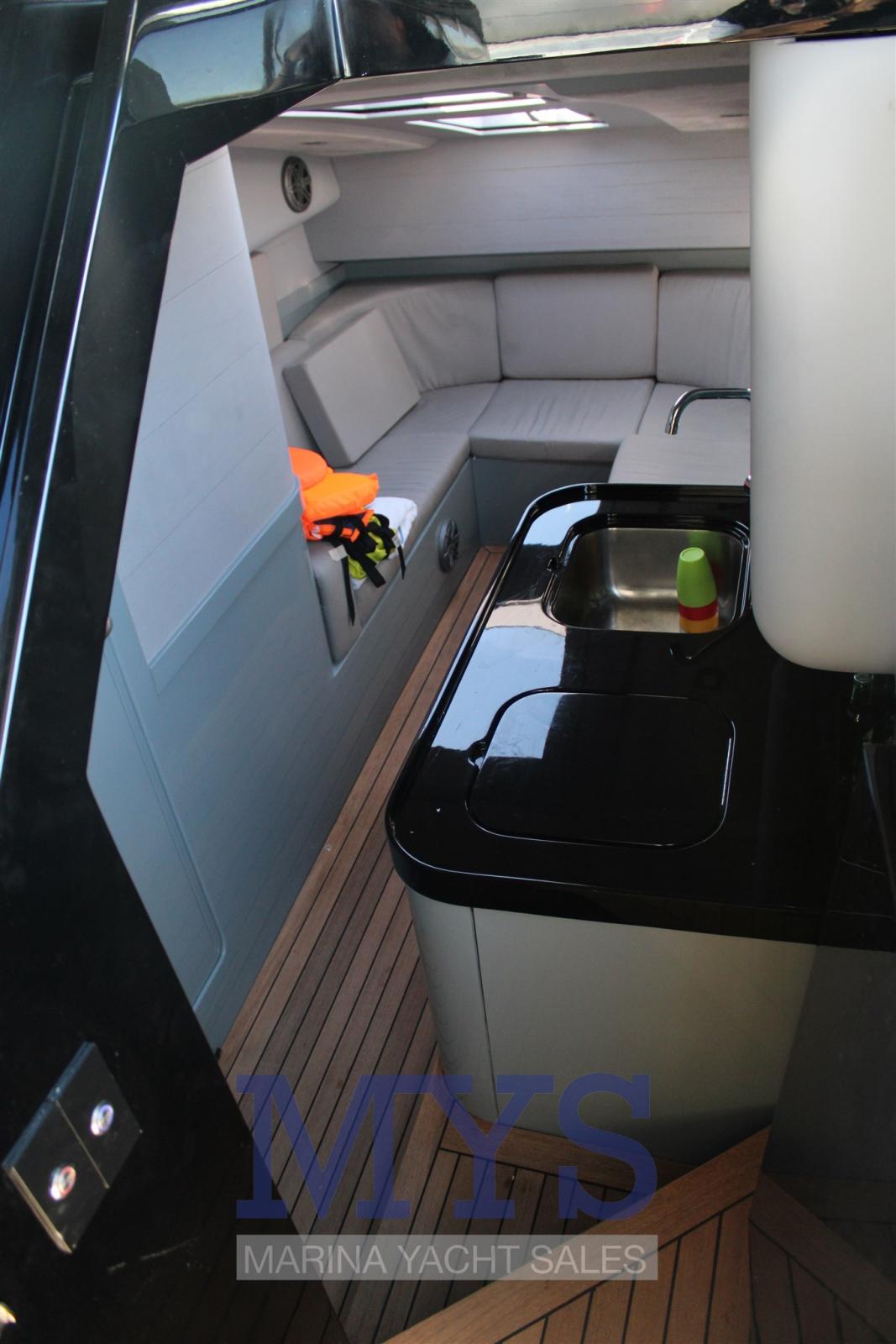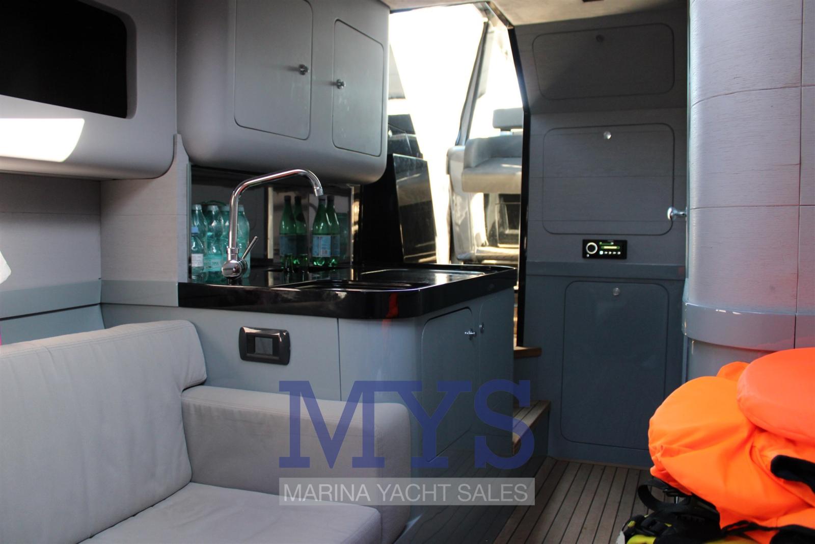 Engine Alarm, Water pressure pump, Deck Shower, Headlights fixed on the stem, Fire Extinguishing System, Courtesy Lights, Underwater lights, Platform, Automatic Bilge Pump, Teak Cockpit, Shorepower connector, Rollbar, Electric Windlass, cockpit table, Horn.