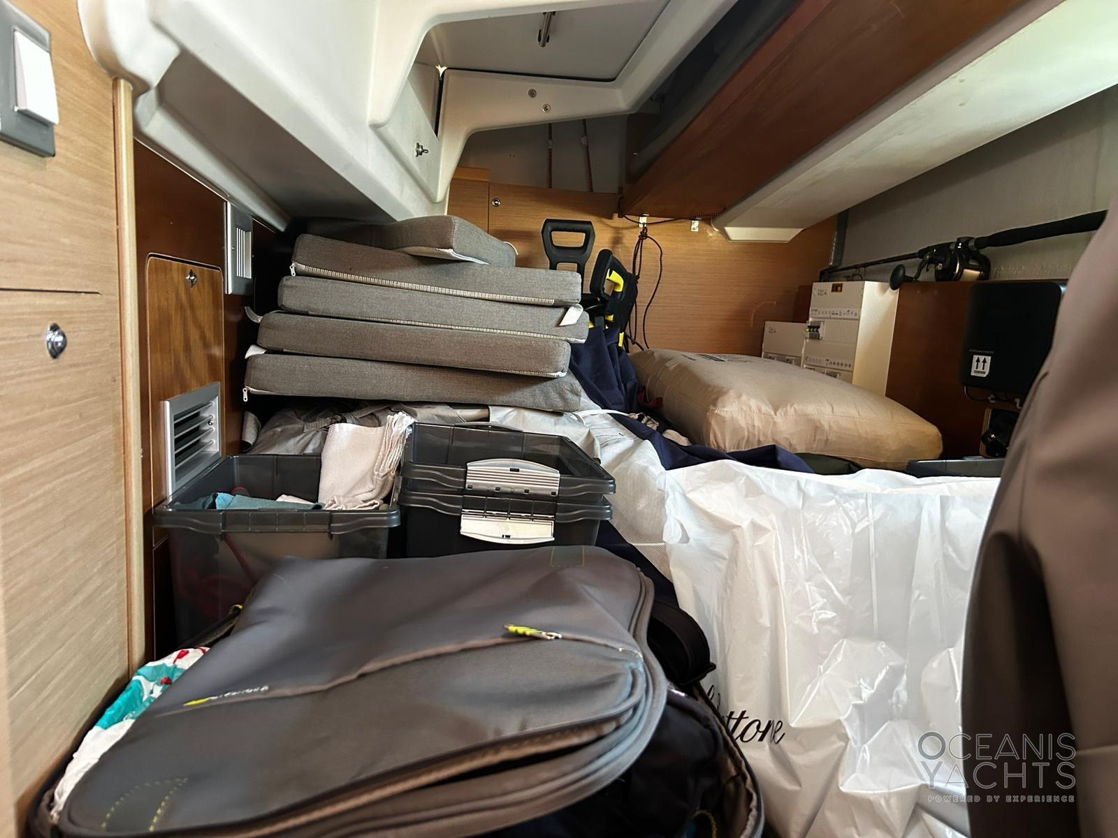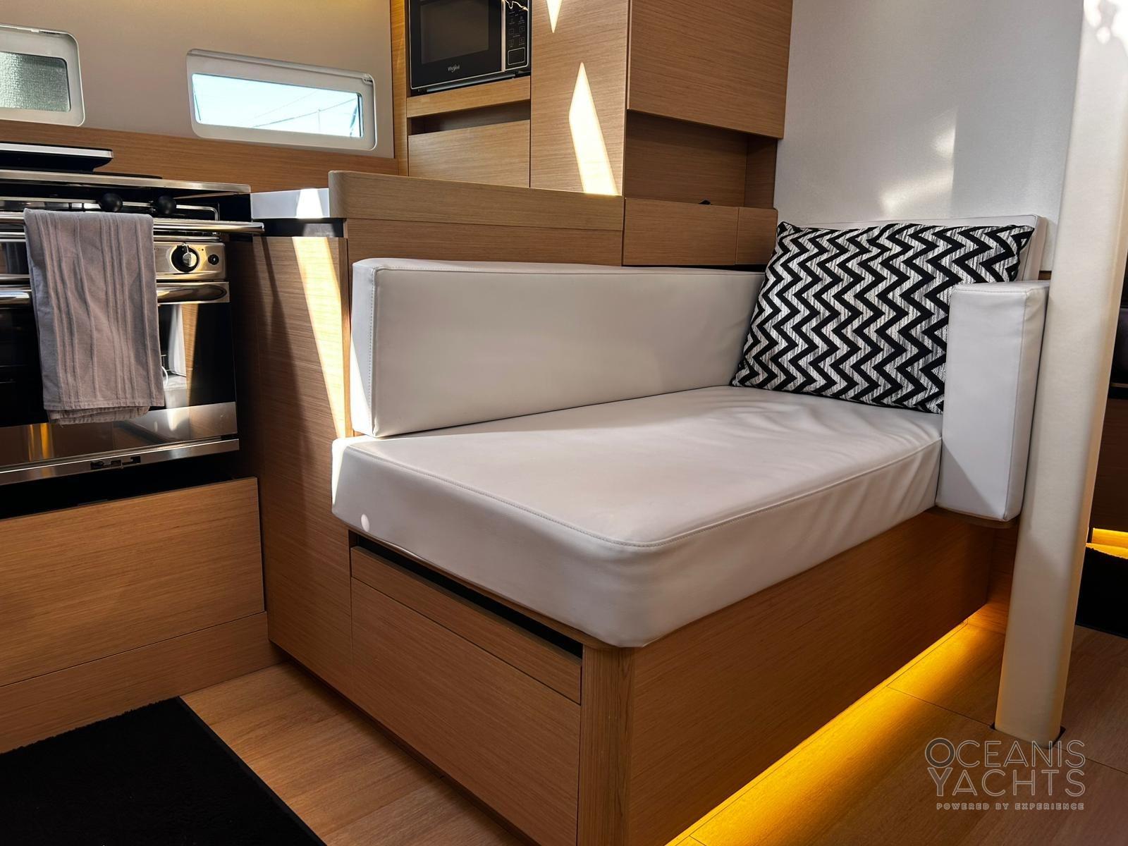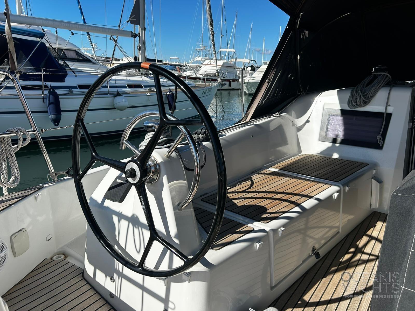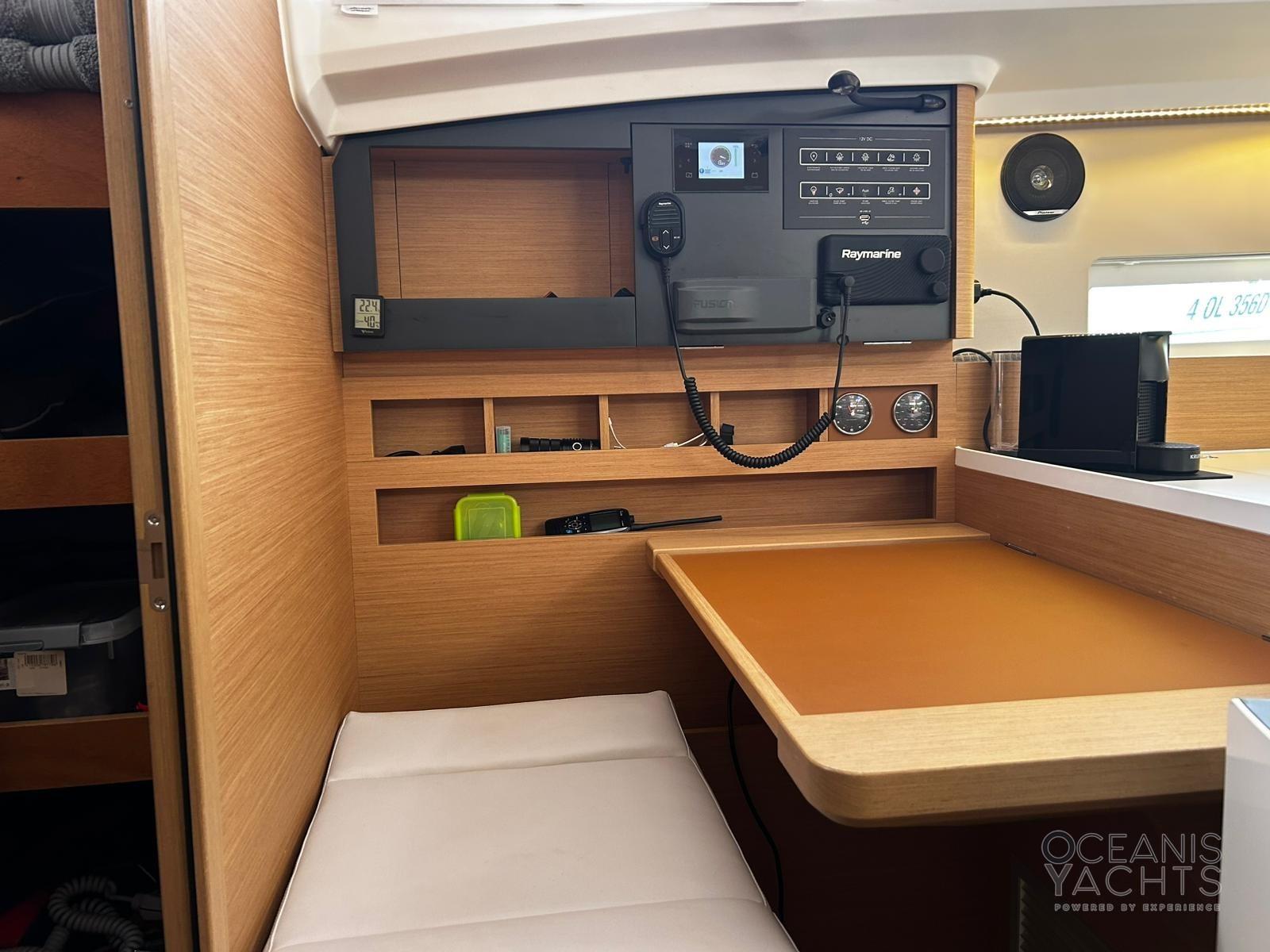 Bowsprit with chain guide for anchor, Second winch control and chain counter anchor in the cockpit, Cockpit table with GPR fins, Lifelines with side opening, quay line 220, USB and 220 sockets in the cabins, Navicolor monitoring, Battery monitoring, Two-burner stove and luxe oven with grill, Additional batteries 60Ah battery charger, 4 125 Ah batteries, 2 halyard bags in the cockpit, Indirect LED lighting, Atmospheric wall light with lampshade, Cockpit (cockpit) indirect lighting, Vertical fridge door, Walls with padded covering, Bottle holder under the floor, Clock and barometer at the chart table, Venetian blinds with side windows and portholes in the saloon