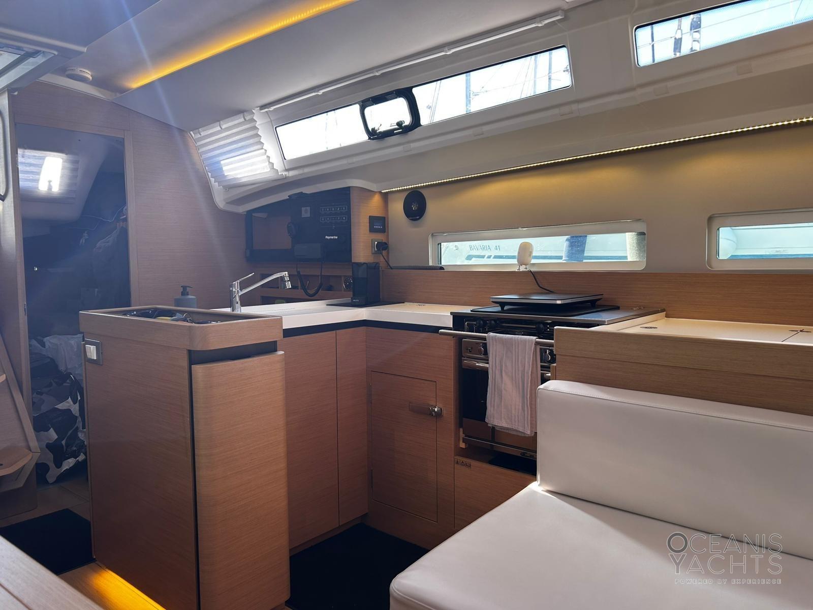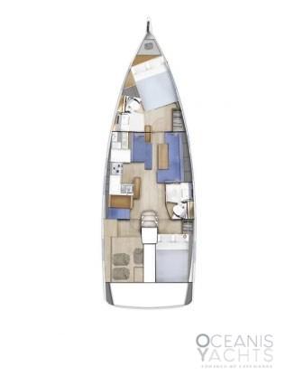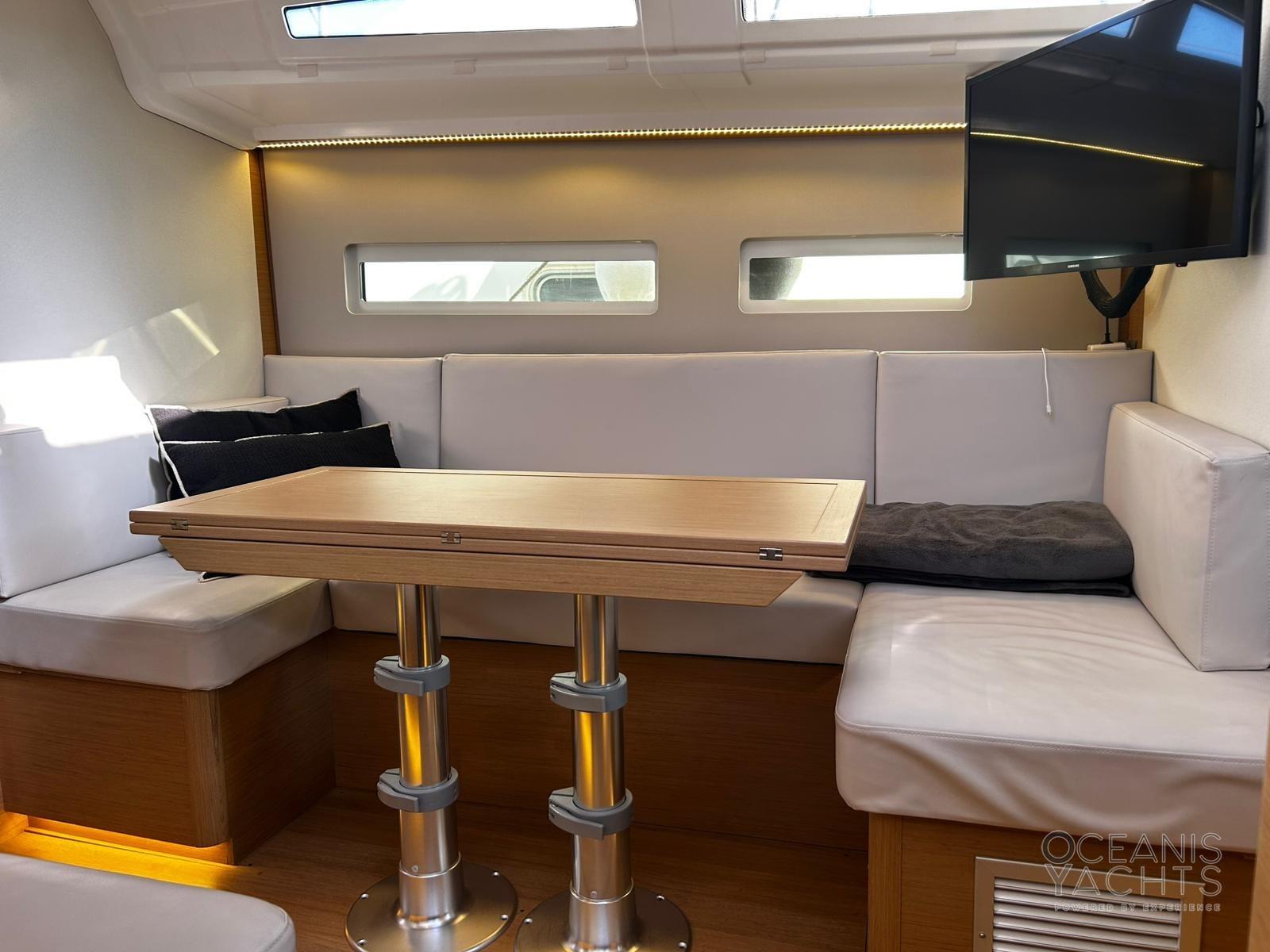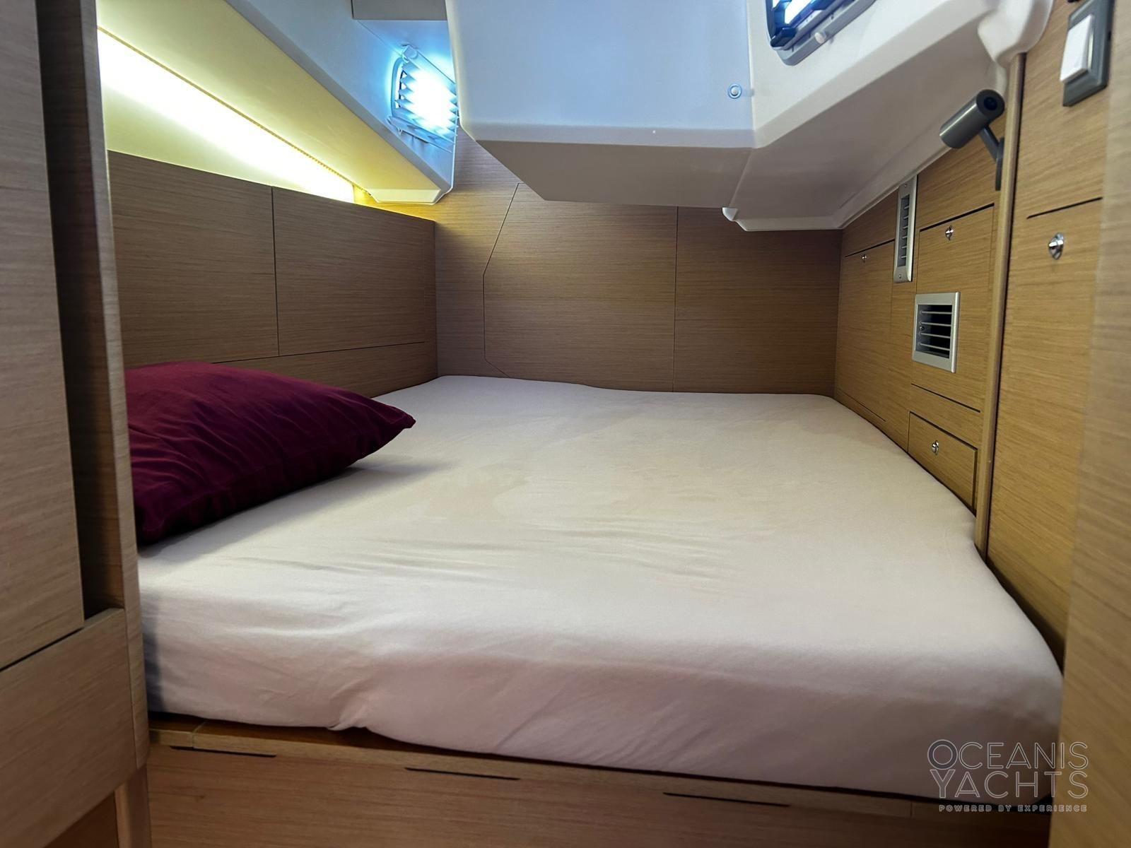 Bowsprit with chain guide for anchor, Second winch control and chain counter anchor in the cockpit, Cockpit table with GPR fins, Lifelines with side opening, quay line 220, USB and 220 sockets in the cabins, Navicolor monitoring, Battery monitoring, Two-burner stove and luxe oven with grill, Additional batteries 60Ah battery charger, 4 125 Ah batteries, 2 halyard bags in the cockpit, Indirect LED lighting, Atmospheric wall light with lampshade, Cockpit (cockpit) indirect lighting, Vertical fridge door, Walls with padded covering, Bottle holder under the floor, Clock and barometer at the chart table, Venetian blinds with side windows and portholes in the saloon