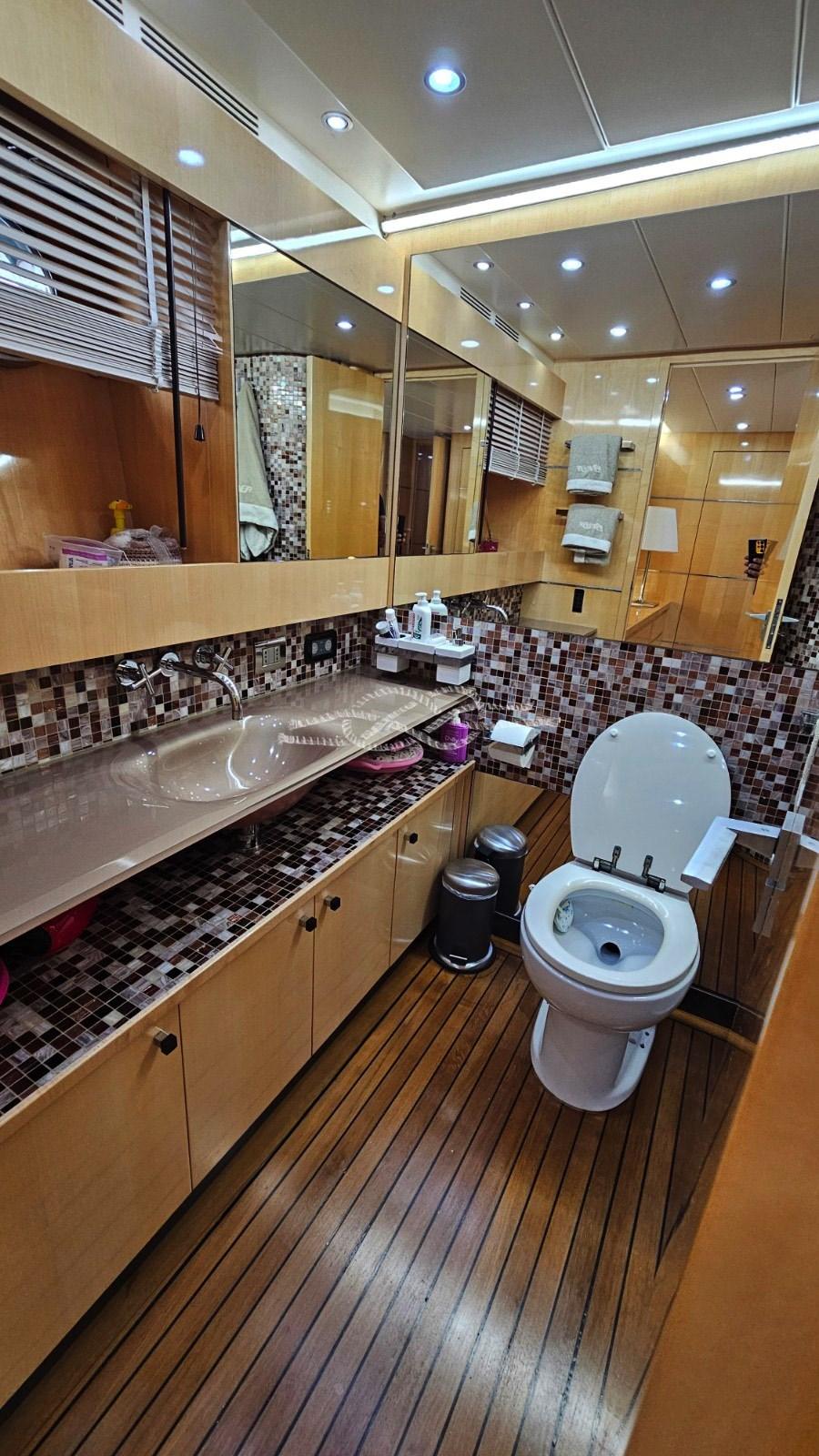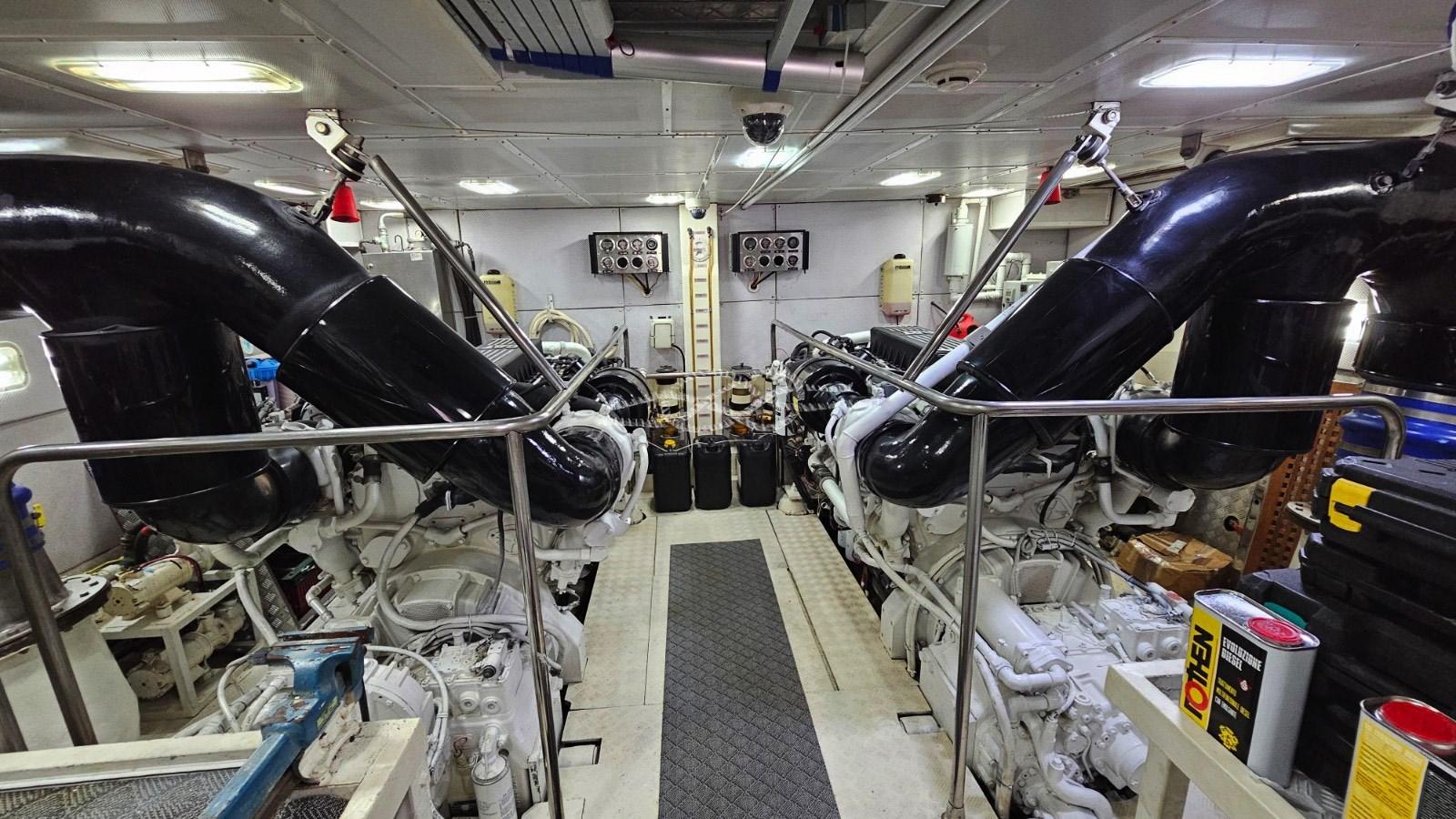 Stern platform tender lift - third control station at the stern - hydraulic bow thruster - hydraulic gangway - Condaria air conditioning in all cabins and engine room - Onan 2 x 27 kW generators - watermaker - satellite TV antenna - TV in the saloon and in all cabins - retractable TV in the cockpit - internal staircase for access to the fly - day toilet - double fridge and freezer - oven - electric hob - double sink - marble kitchen countertops - Miele washing machine - Miele dryer - complete cushions - sundeck in the bow - bimini top - tender garage in the stern - tender jet - Hammann black water treatment system - wet bar on the fly with sink, stainless steel drawer fridge and ice maker - Fusion audio system on the flybridge.