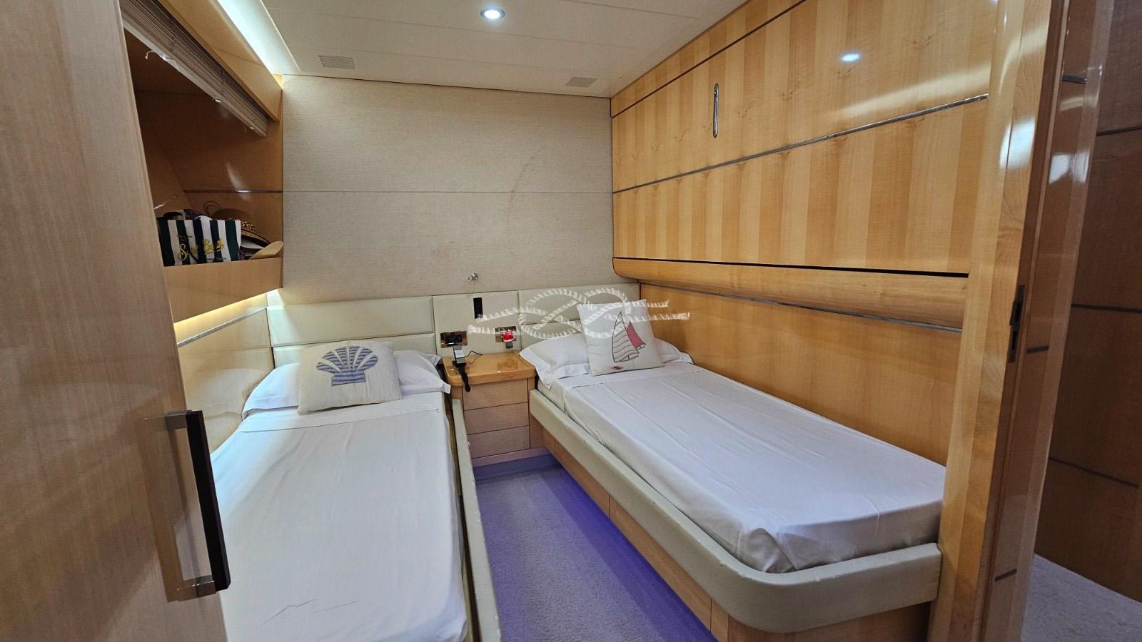Crew accommodation in the bow with separate single and double with bunk beds - bathroom.