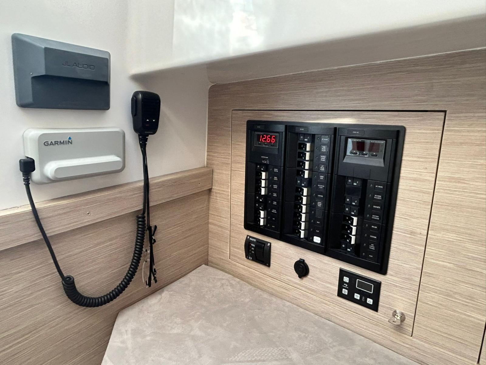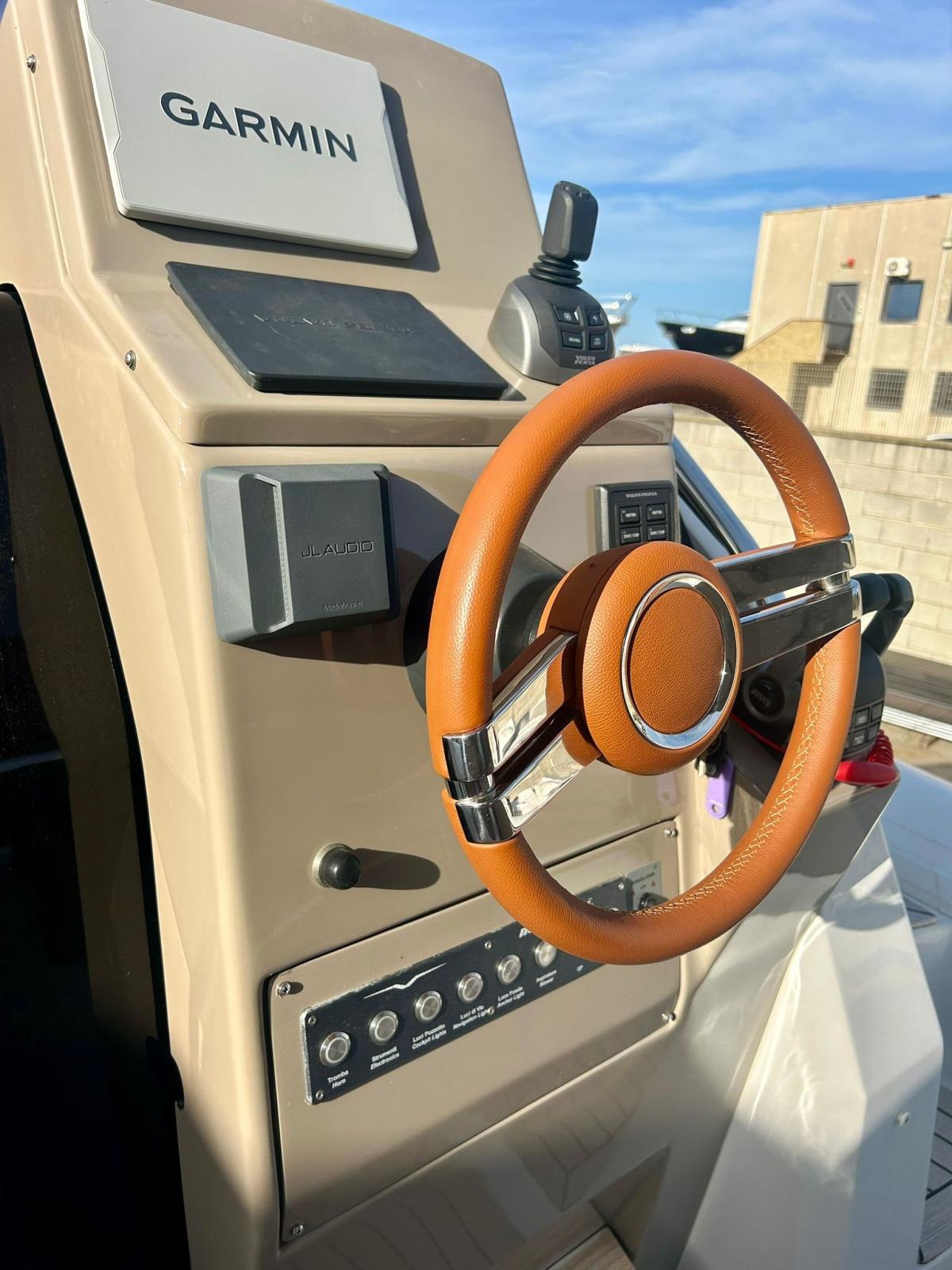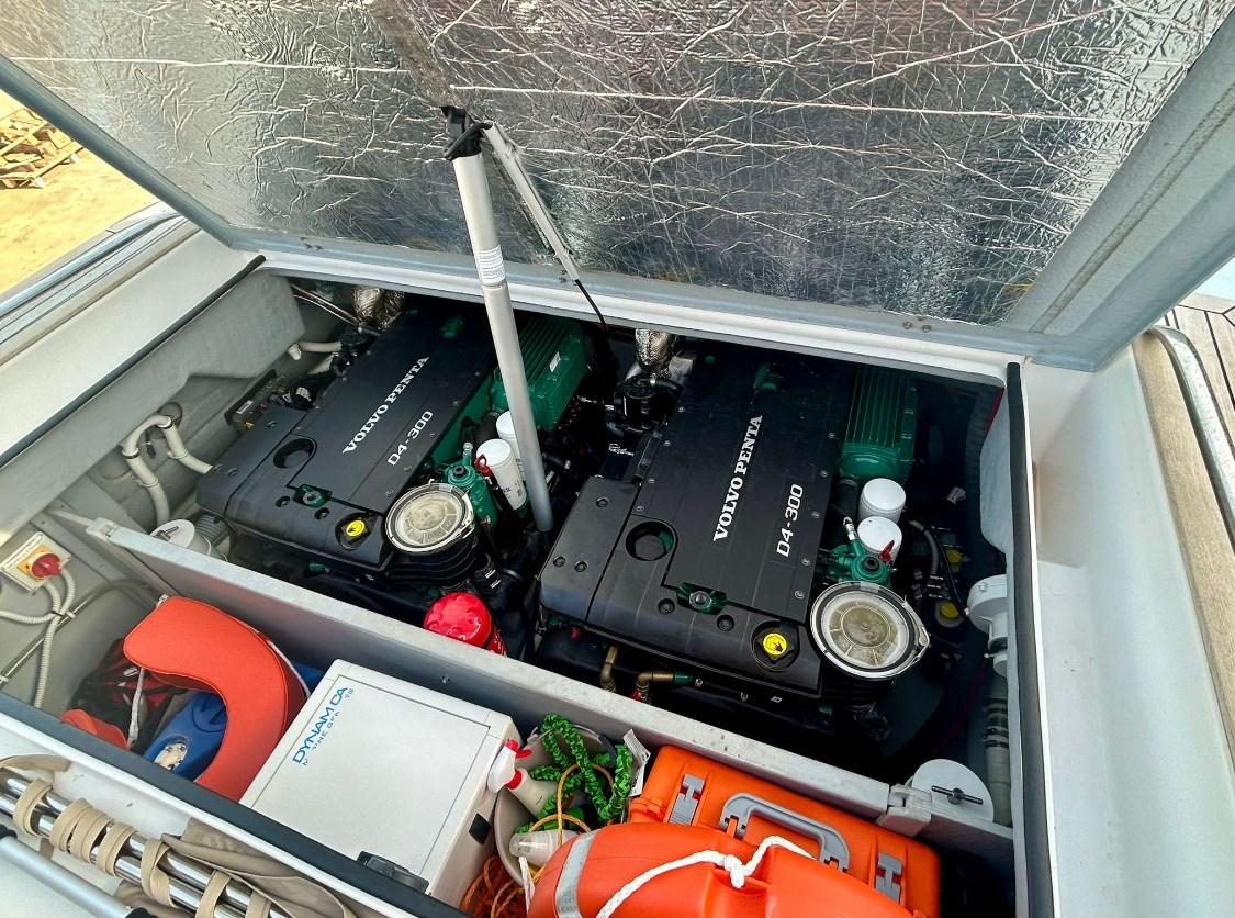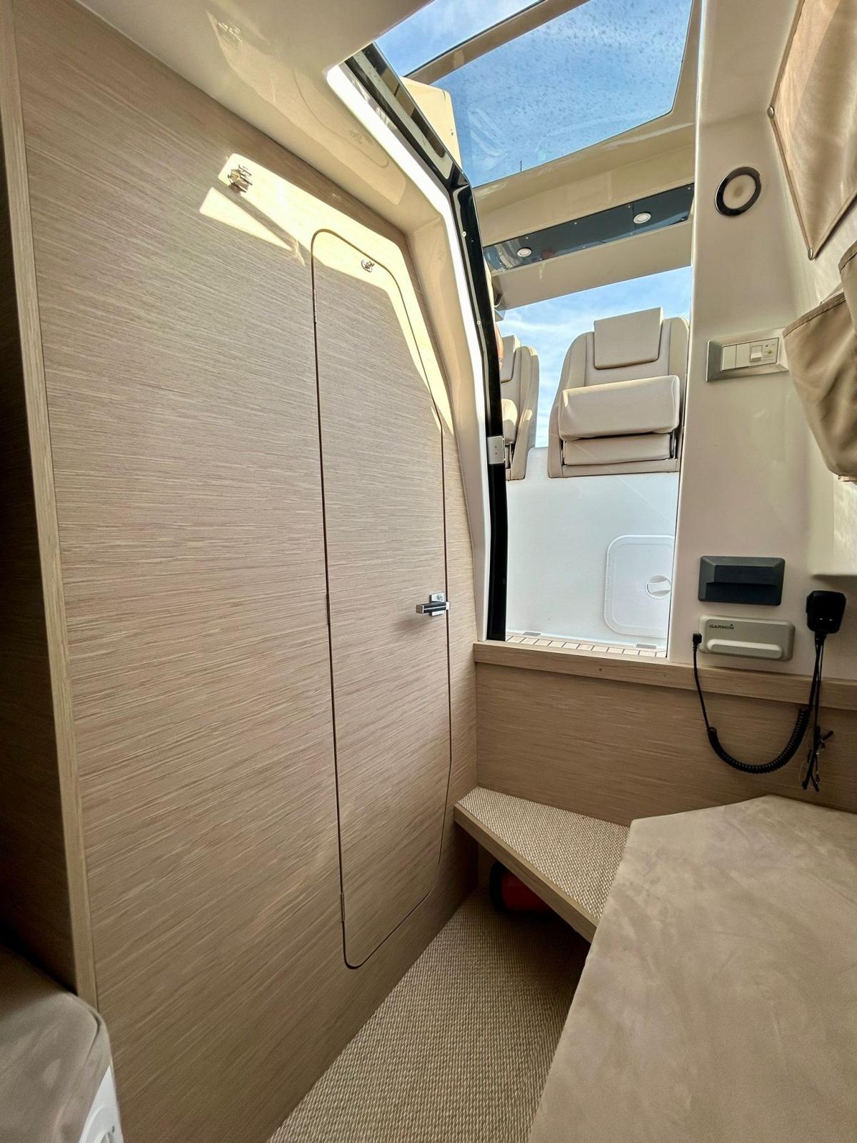 Engine Alarm, Bilge Alarm, Electric Engine Compartment Opening, Auto Dynamic Trim Interceptor, Water pressure pump, Shore power cable, Washbasin in the cockpit, Courtesy Lights, Underwater lights, Teak Cockpit, Shorepower connector, Electric Windlass, cockpit table, T-Top.