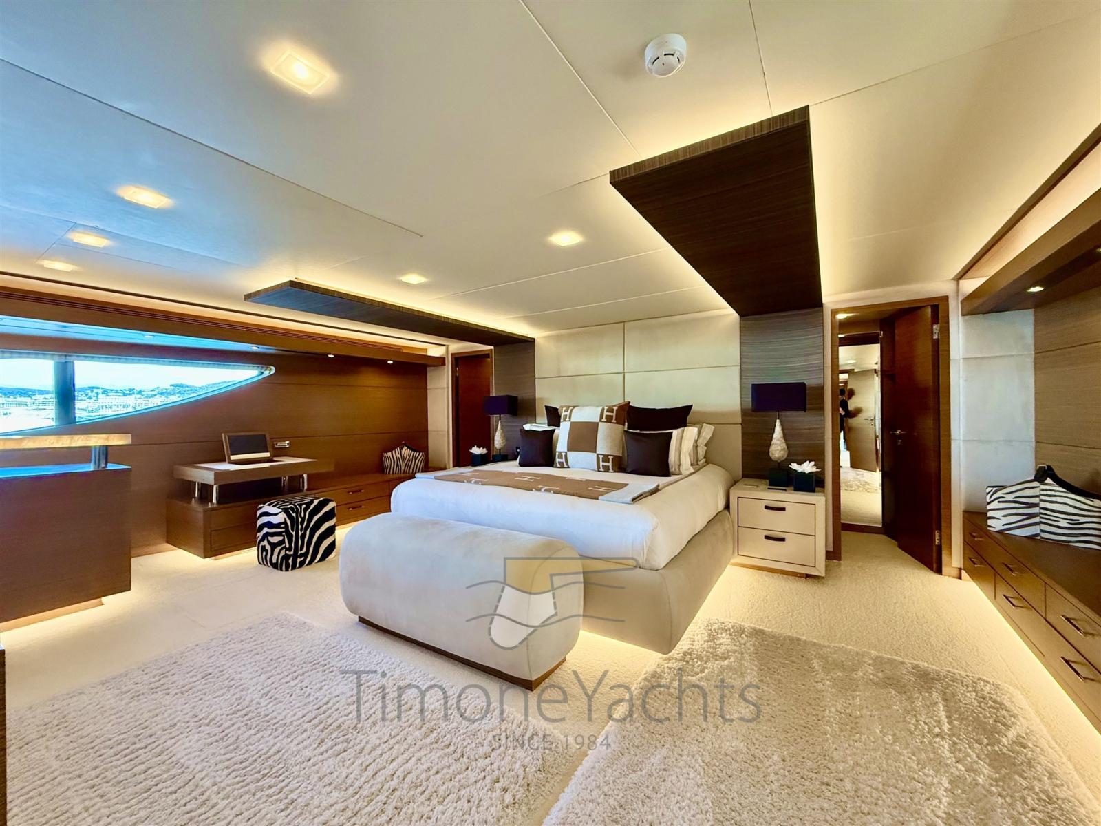 Fume/Gas Detector, Engine Alarm, Bilge Alarm, Alternator, Water pressure pump, Teak Side Decks, Special Colour, Deck Shower, Hydraulic Flaps, Tender Garage, Hard top, Flaps Indicators, Anchor Chain Washdown, Washbasin in the cockpit, Courtesy Lights, Underwater lights, Gangway, Platform, Teak deck, Entry door, Side door, Teak Cockpit, Shorepower connector, Water harbor connector system, swimming ladder, Stabilizers (Seakeeper), cockpit table, Tender, Horn, Stern Winches, Bow Winches.
