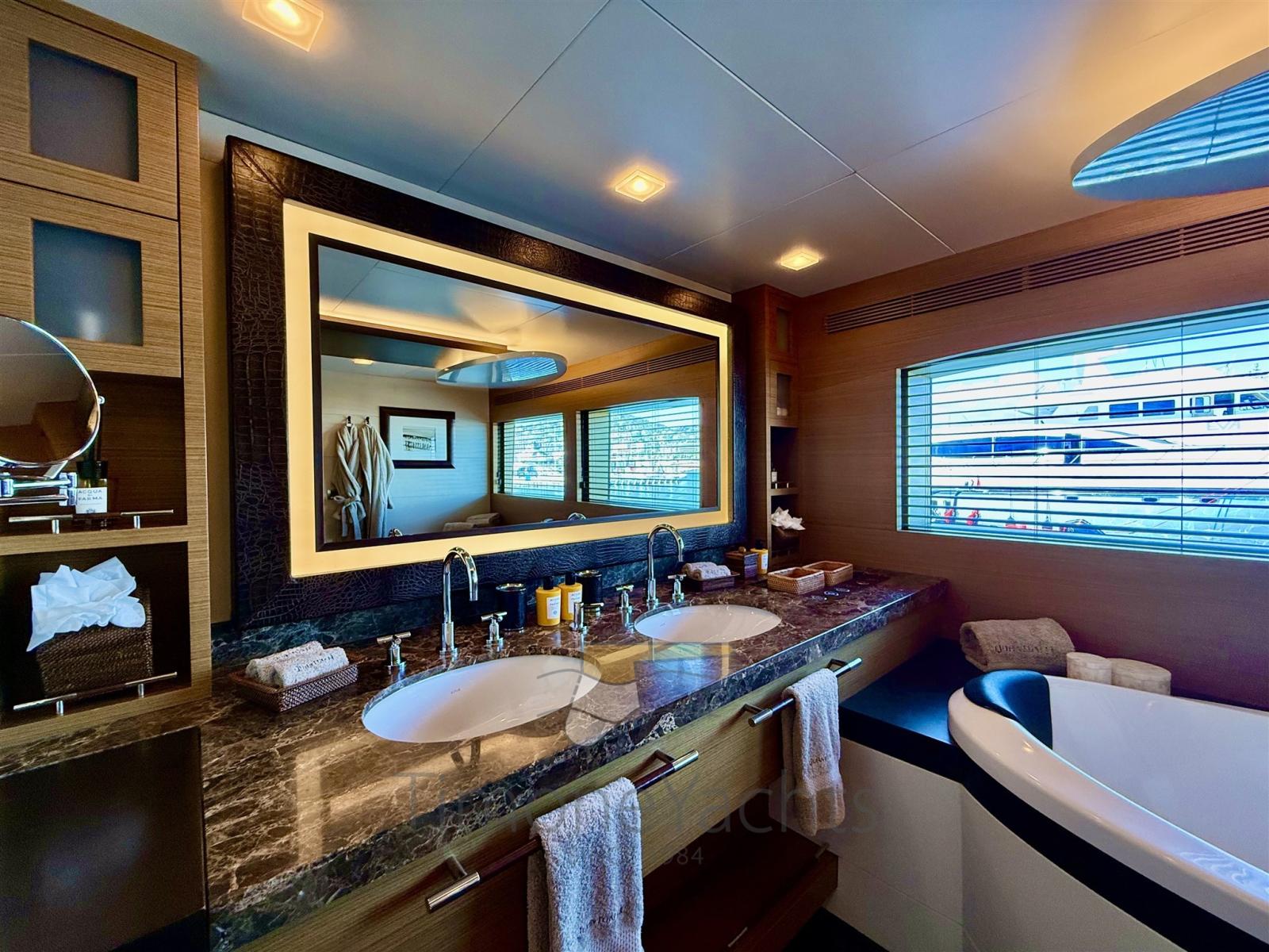 QHT's full-beam master suite is situated on the main deck and complete with a king-sized berth, en suite with a tub and shower, a walk-in closet, and private office space. Meanwhile, all other guest cabins are on the lower deck with en suite facilities of their own.