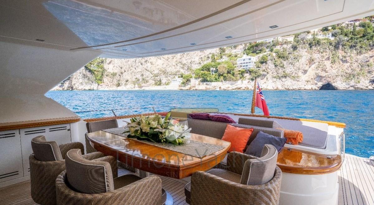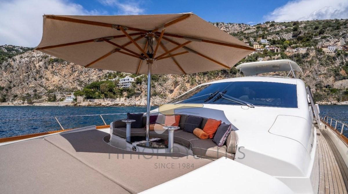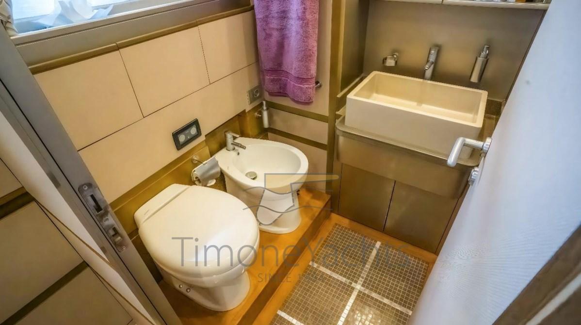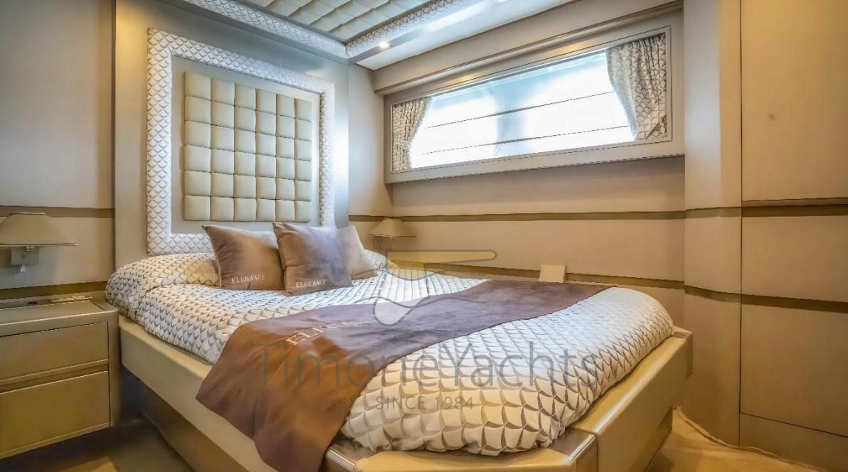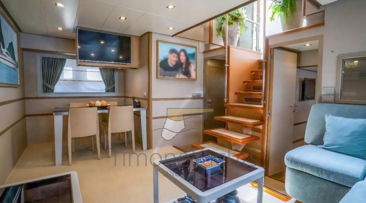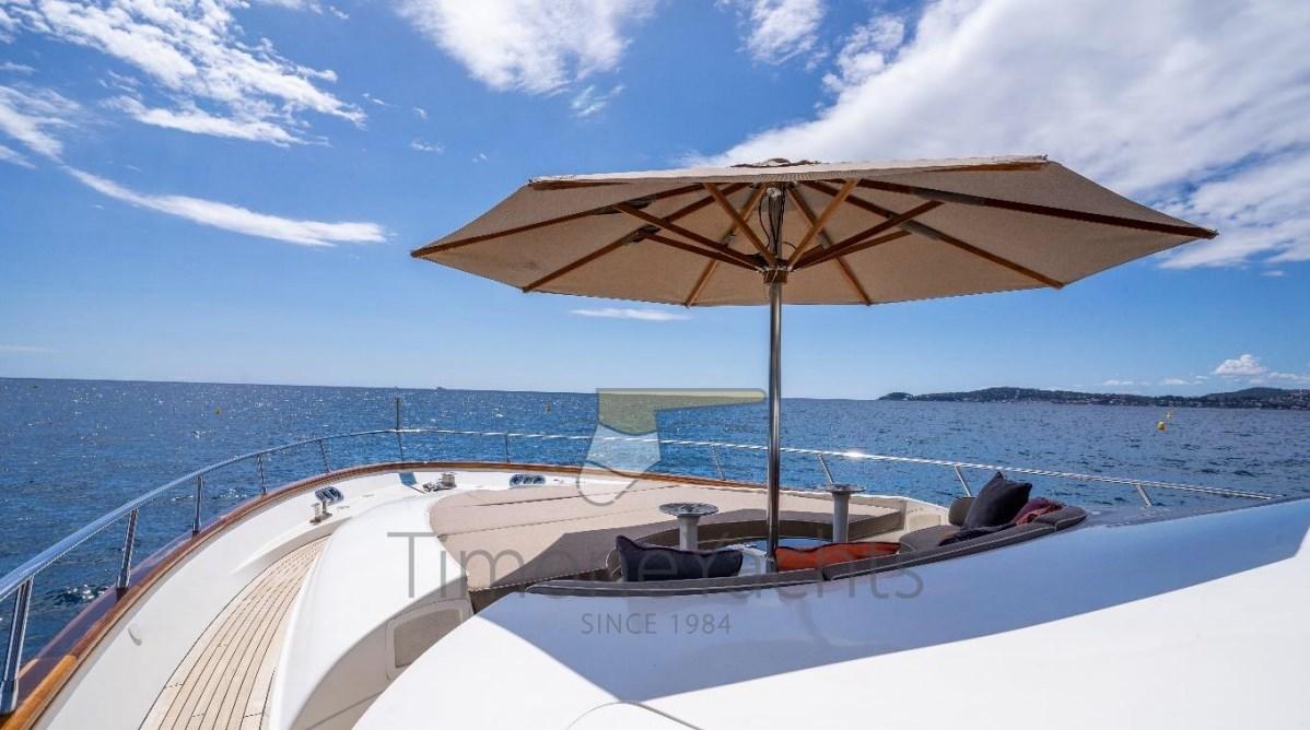 Fume/Gas Detector, Engine Alarm, Bilge Alarm, Alternator, Water pressure pump, Teak Side Decks, Twin Steering, Hydraulic Flaps, Tender Garage, Hard top, Courtesy Lights, Gangway, Teak deck, Entry door, Side door, Teak Cockpit, Shorepower connector, Water harbor connector system, Tender (Avion 2 stroke 30 hp), Horn, Stern Winches, Bow Winches.
