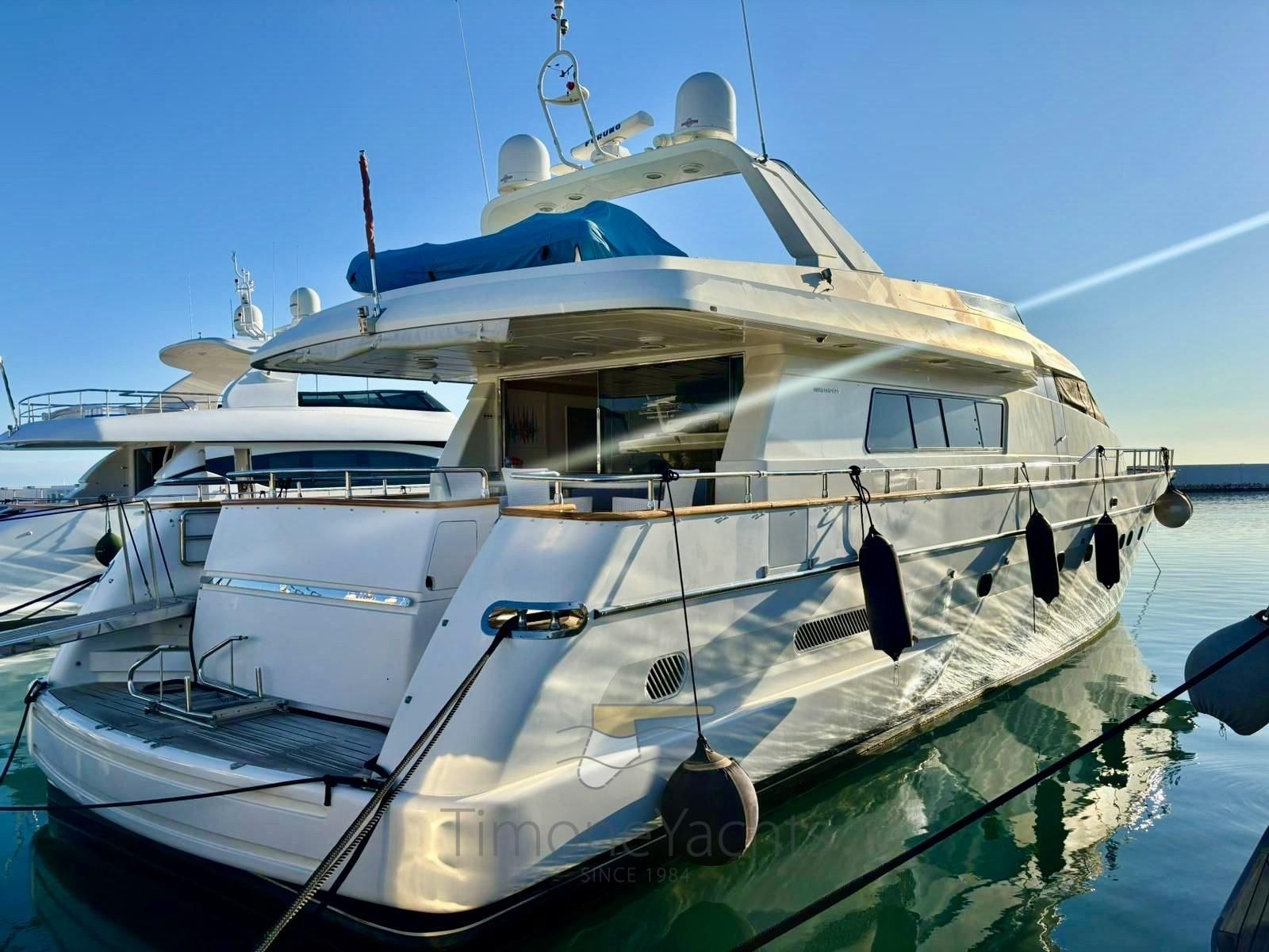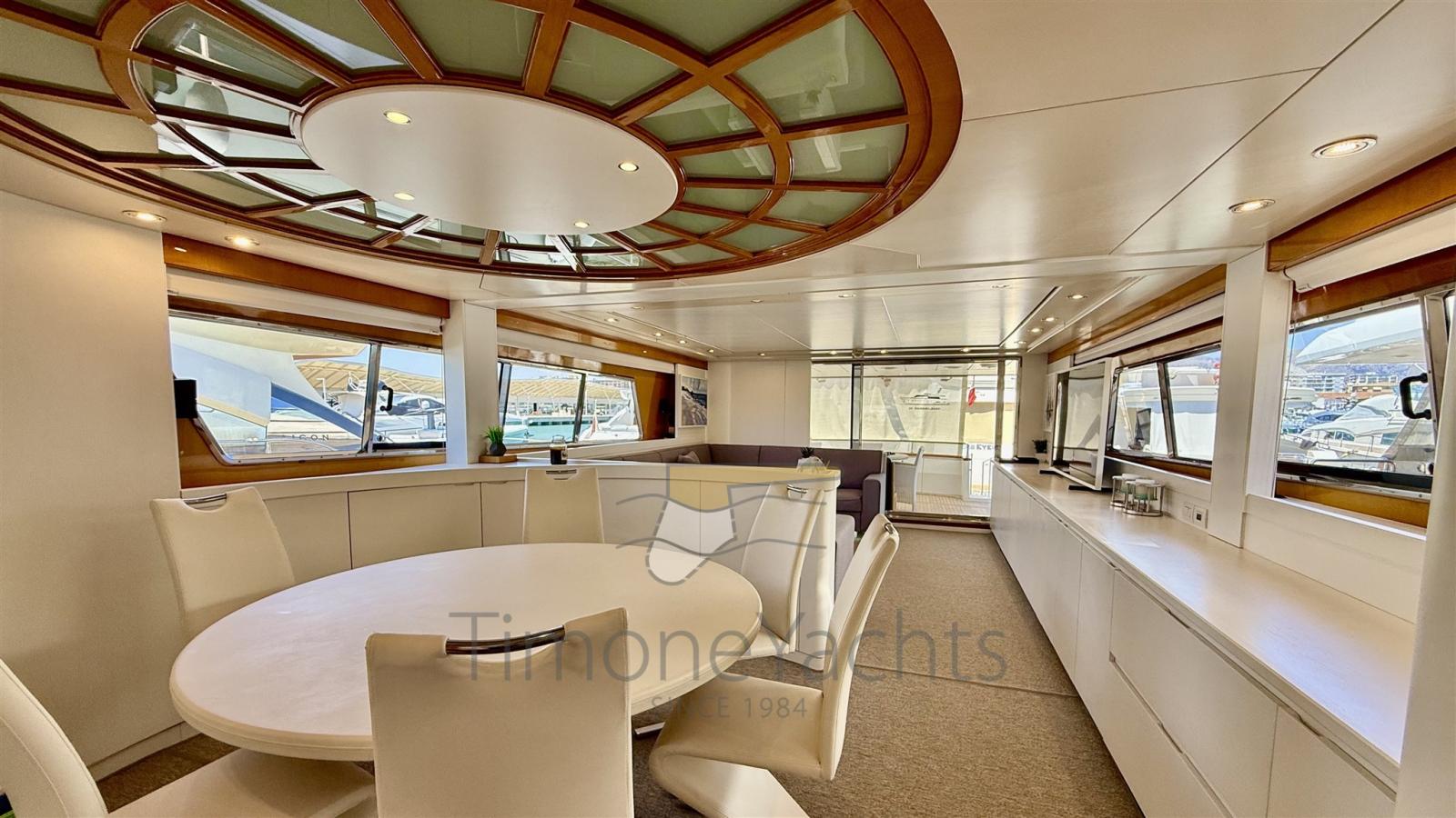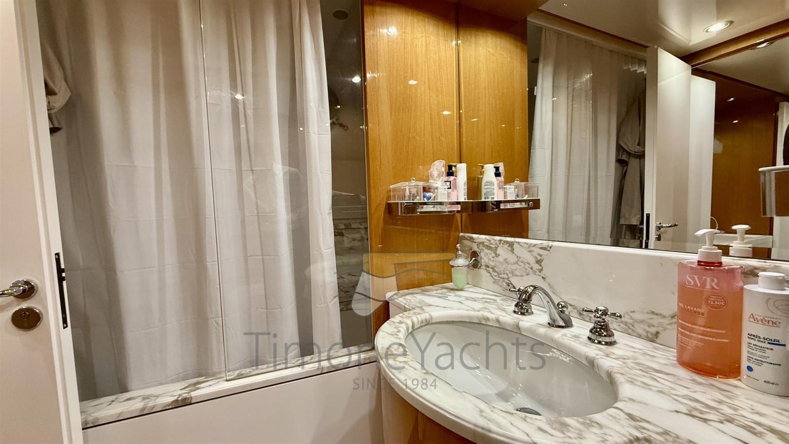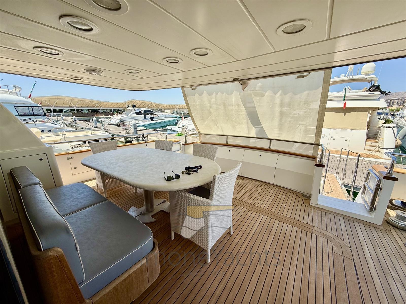 Bilge Alarm, Electric Engine Compartment Opening, Water pressure pump, Teak Side Decks, Deck Shower, Twin Steering, Directional Spotlight, Hydraulic Flaps (N°2), Davits for tender on fly, Fire Extinguishing System, Anchor Chain Washdown, Gangway, Platform, Automatic Bilge Pump, Teak deck, Entry door, Side door, Teak Cockpit, Voltage Rectifier, Rollbar, Electric Windlass, swimming ladder, Saddles for tender, cockpit table, Horn, Stern Winches.