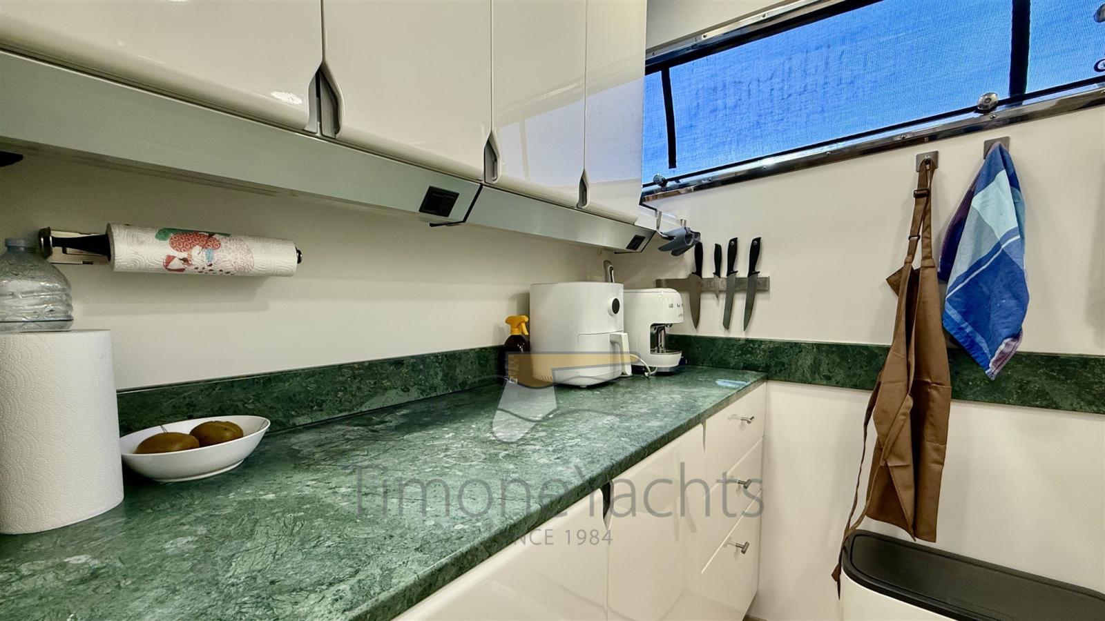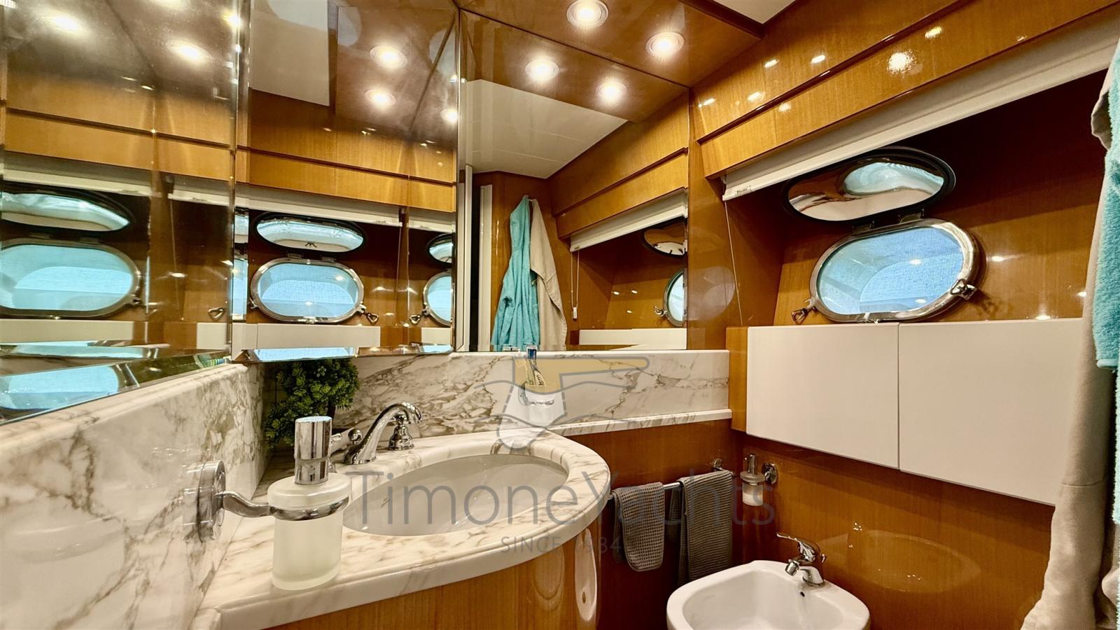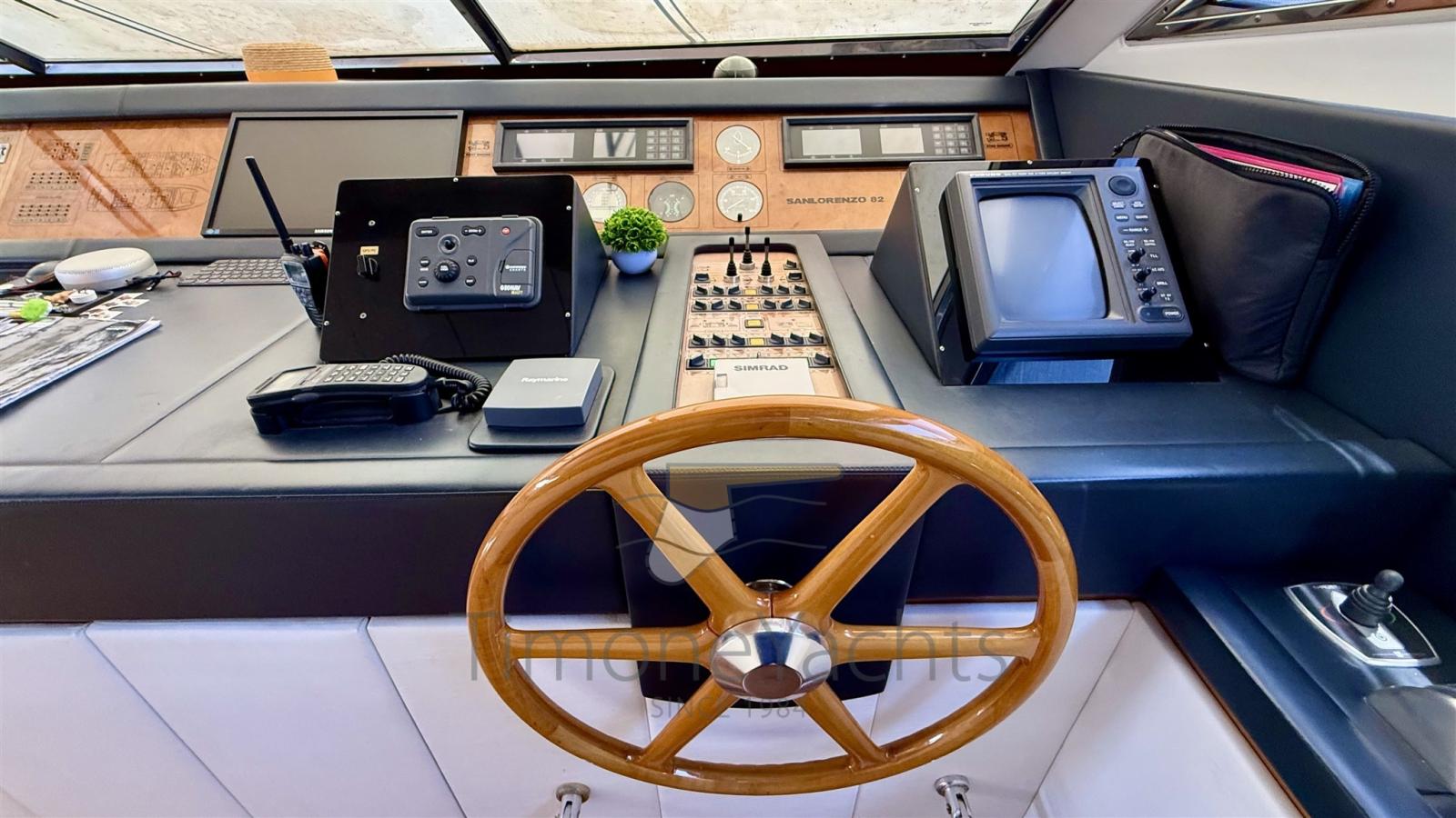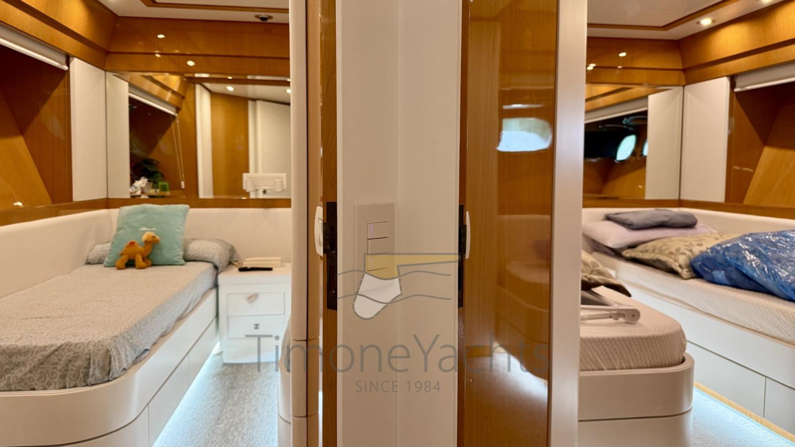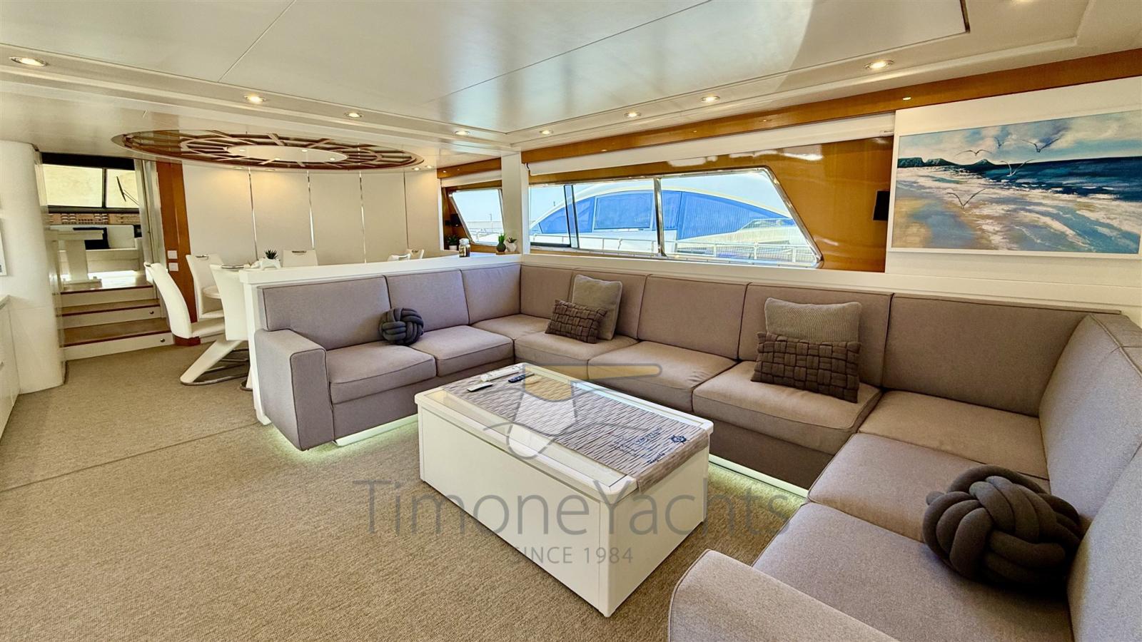 Bilge Alarm, Electric Engine Compartment Opening, Water pressure pump, Teak Side Decks, Deck Shower, Twin Steering, Directional Spotlight, Hydraulic Flaps (N°2), Davits for tender on fly, Fire Extinguishing System, Anchor Chain Washdown, Gangway, Platform, Automatic Bilge Pump, Teak deck, Entry door, Side door, Teak Cockpit, Voltage Rectifier, Rollbar, Electric Windlass, swimming ladder, Saddles for tender, cockpit table, Horn, Stern Winches.